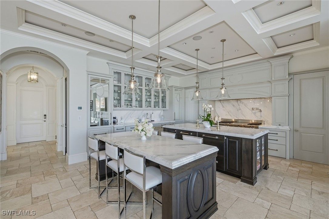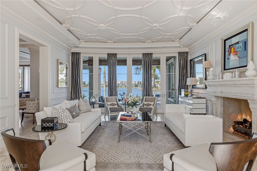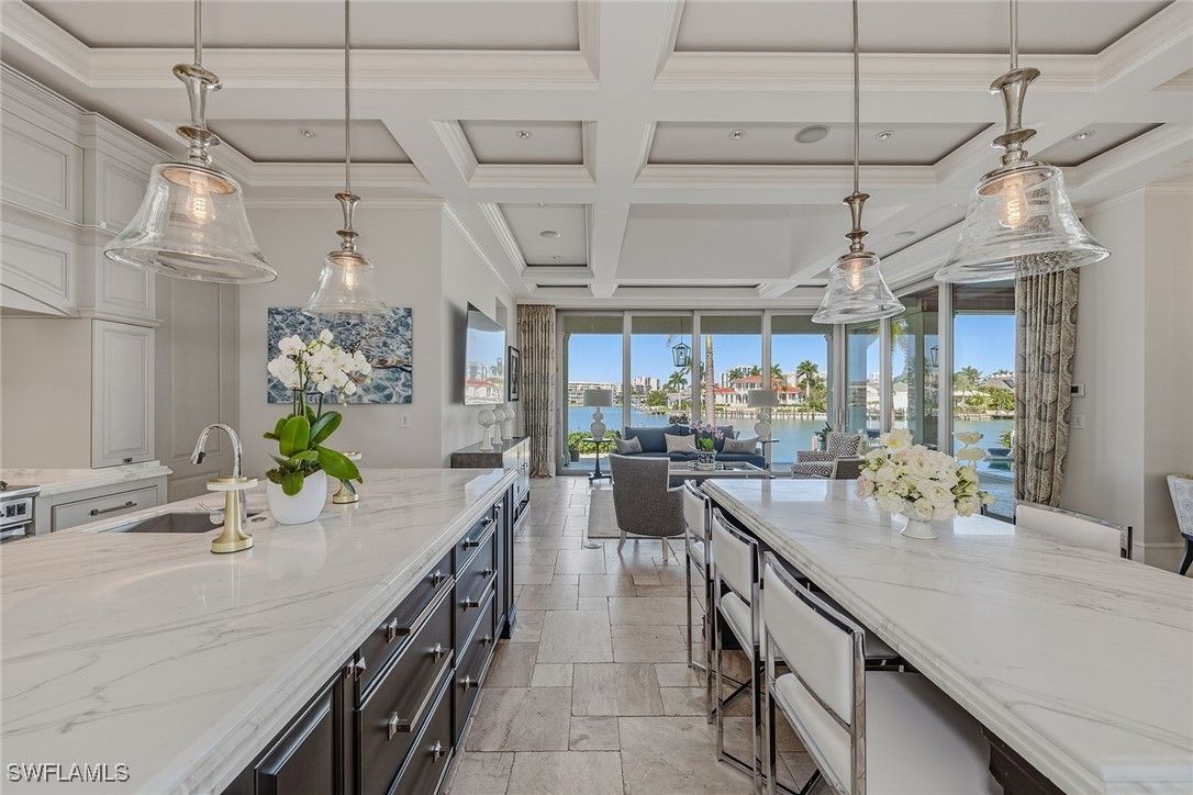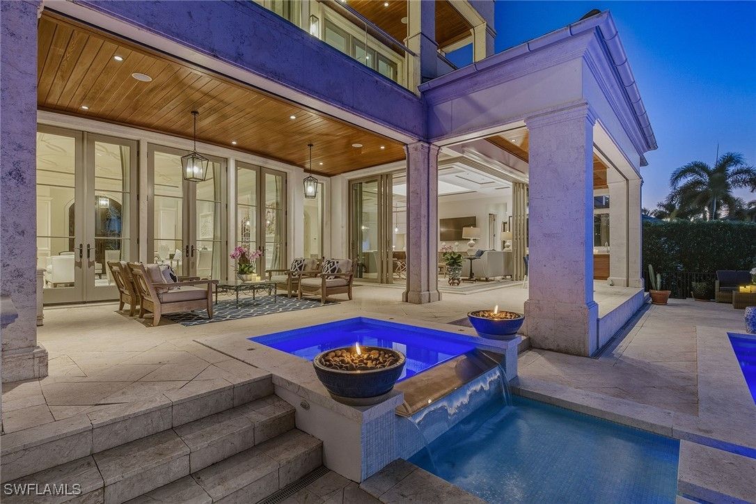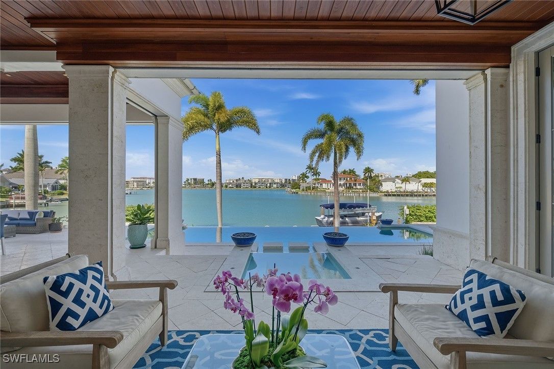 From the moment the front door opens, the bay becomes the focal point. Built by renowned BCB Homes, this custom estate was conceived to showcase the waterfront at every turn while delivering a level of detail and finish expected by the discerning buyer. The home unfolds through a thoughtful balance of formal and casual spaces, each designed to serve a purpose while maintaining visual continuity with the bay. Formal living and dining rooms create an elegant framework for entertaining, while everyday living naturally gravitates toward the family room, where expansive glass captures panoramic water views throughout the day. At center of the residence, the kitchen functions as a gathering space and a showpiece. Dual islands provide scale and flow, while marble countertops and professional appliances support serious cooking and entertaining. The 60-inch Wolf gas French plate range is not simply a feature but a statement, underscoring the home’s commitment to performance and design. Nearby, a dedicated bar and climate-controlled wine room anchor the home as a setting for evenings that linger. Inspired by coastal Europe, the home’s outdoor areas are anchored by an infinity-edge pool and spa that visually merge with the bay beyond. Covered and open-air spaces are layered to accommodate every part of the day, from shaded afternoons on the lanai to evenings around the summer kitchen and open sitting areas. The custom 90-foot dock extends the home’s lifestyle onto the water. Designed to blend naturally with its surroundings, it is equipped with a 16,000-pound lift and floating dock platform, ready to support aquatic adventures. The first-floor primary suite occupies a dedicated wing of the home with a bedroom positioned directly on the bay, offering sweeping water views upon waking and retiring. Dual walk-in closets and a marble-clad bath evoke the best European spas, while a secluded sitting room or office provides a quiet place to work or reflect. The first floor also features a beautifully finished billiards room or fifth bedroom, complete with its bath, allowing the home to adapt effortlessly. The second floor, with its dedicated elevator, features three beautifully appointed guest suites, each with a private en-suite bath. A central social room with a morning bar creates a natural gathering point for guests, reinforcing the home’s sense of ease and hospitality. The second-floor balcony offers expansive bay views, while the rooftop terrace provides an even more commanding perspective. With a dedicated fireplace and open vistas across the water, this space becomes a destination for sunsets, evening conversations and quiet moments above it all. This Moorings bayfront residence is not simply a home but a setting for a life shaped by water, light and thoughtful design.