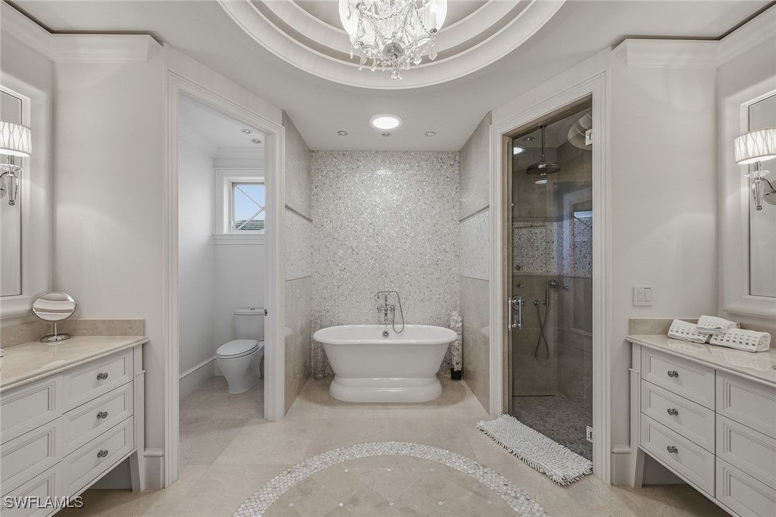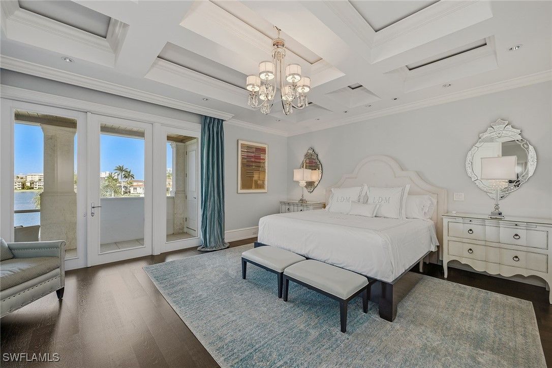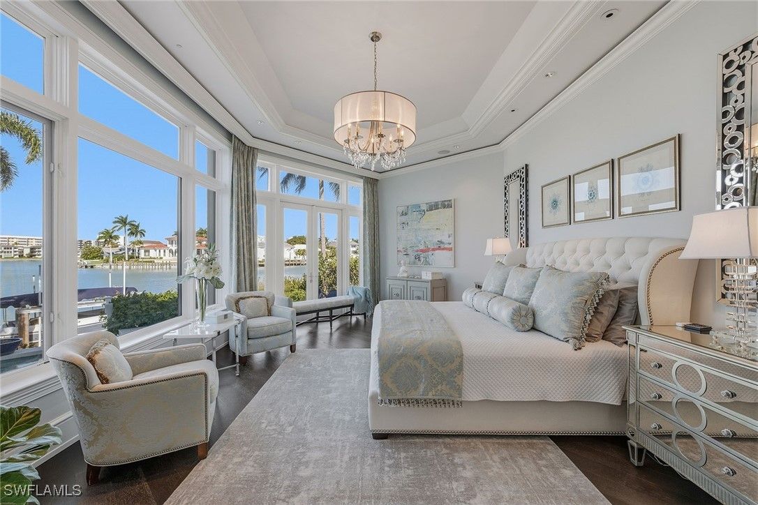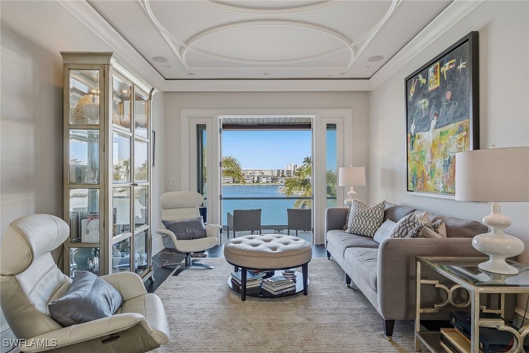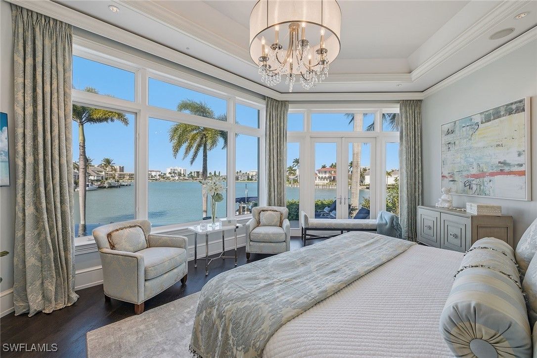 From the moment the front door opens, the bay becomes the focal point. Built by renowned BCB Homes, this custom estate was conceived to showcase the waterfront at every turn while delivering a level of detail and finish expected by the discerning buyer. The home unfolds through a thoughtful balance of formal and casual spaces, each designed to serve a purpose while maintaining visual continuity with the bay. Formal living and dining rooms create an elegant framework for entertaining, while everyday living naturally gravitates toward the family room, where expansive glass captures panoramic water views throughout the day. At center of the residence, the kitchen functions as a gathering space and a showpiece. Dual islands provide scale and flow, while marble countertops and professional appliances support serious cooking and entertaining. The 60-inch Wolf gas French plate range is not simply a feature but a statement, underscoring the home’s commitment to performance and design. Nearby, a dedicated bar and climate-controlled wine room anchor the home as a setting for evenings that linger. Inspired by coastal Europe, the home’s outdoor areas are anchored by an infinity-edge pool and spa that visually merge with the bay beyond. Covered and open-air spaces are layered to accommodate every part of the day, from shaded afternoons on the lanai to evenings around the summer kitchen and open sitting areas. The custom 90-foot dock extends the home’s lifestyle onto the water. Designed to blend naturally with its surroundings, it is equipped with a 16,000-pound lift and floating dock platform, ready to support aquatic adventures. The first-floor primary suite occupies a dedicated wing of the home with a bedroom positioned directly on the bay, offering sweeping water views upon waking and retiring. Dual walk-in closets and a marble-clad bath evoke the best European spas, while a secluded sitting room or office provides a quiet place to work or reflect. The first floor also features a beautifully finished billiards room or fifth bedroom, complete with its bath, allowing the home to adapt effortlessly. The second floor, with its dedicated elevator, features three beautifully appointed guest suites, each with a private en-suite bath. A central social room with a morning bar creates a natural gathering point for guests, reinforcing the home’s sense of ease and hospitality. The second-floor balcony offers expansive bay views, while the rooftop terrace provides an even more commanding perspective. With a dedicated fireplace and open vistas across the water, this space becomes a destination for sunsets, evening conversations and quiet moments above it all. This Moorings bayfront residence is not simply a home but a setting for a life shaped by water, light and thoughtful design.