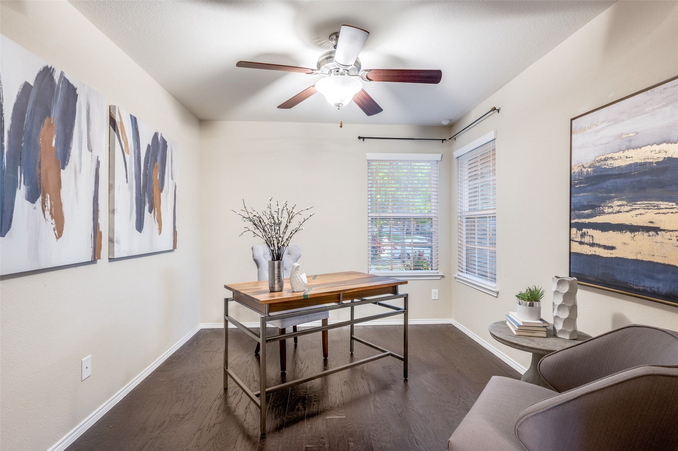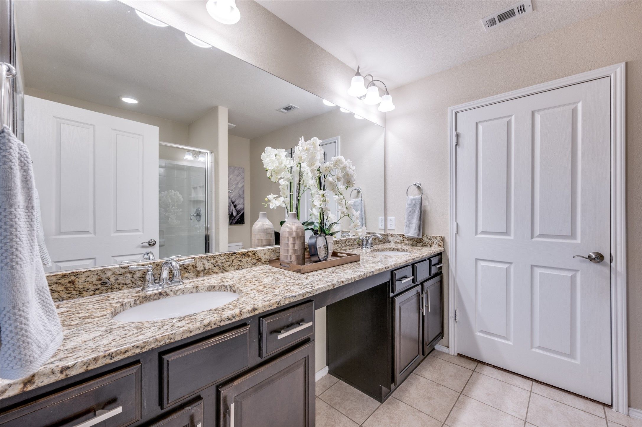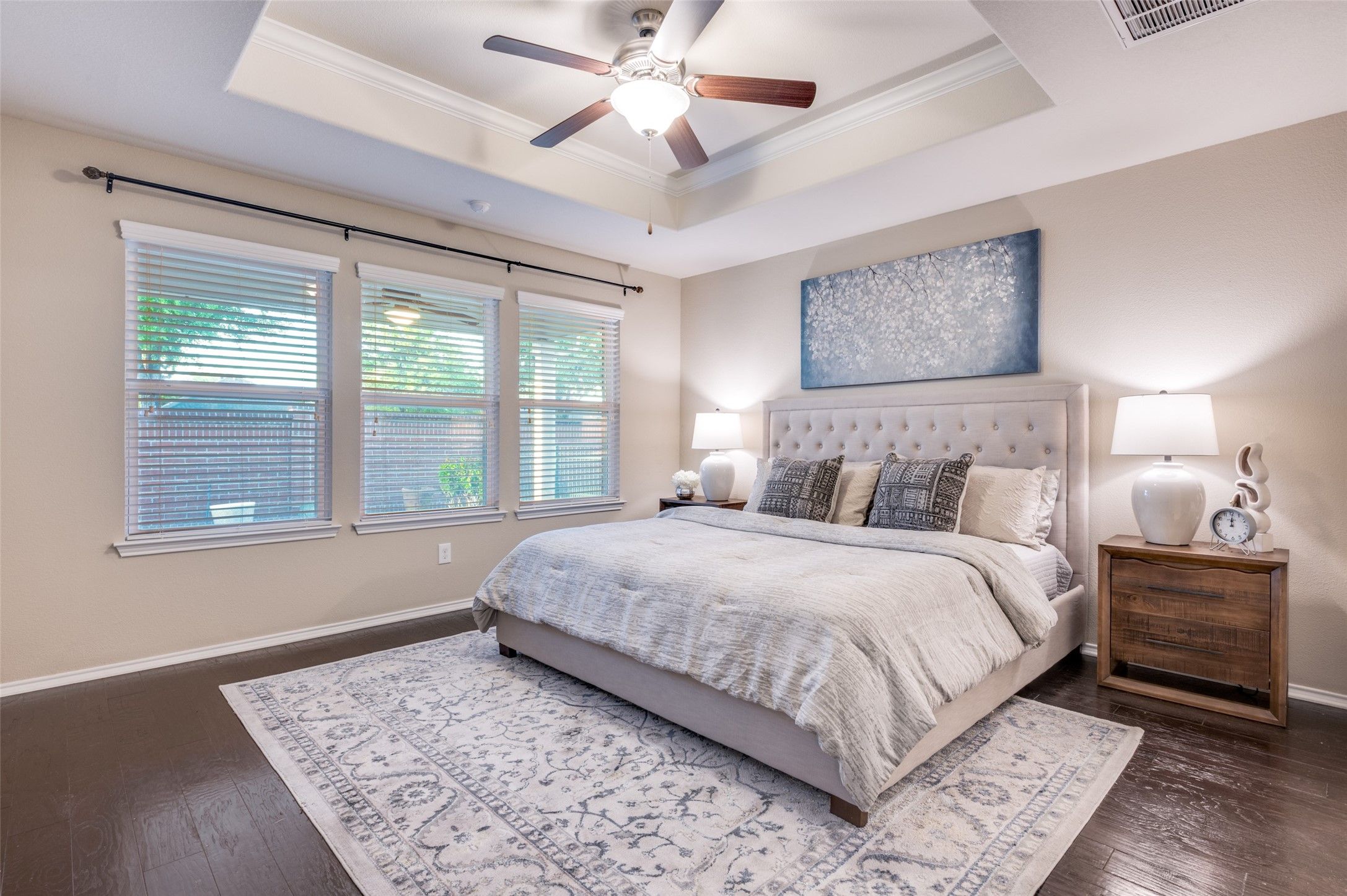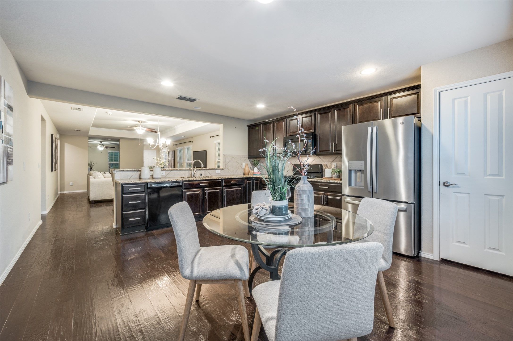 Welcome to easy living in the highly desirable Frisco Lakes by Del Webb 55+ community. This beautifully maintained single-story home offers a warm, comfortable layout with inviting spaces both inside and out. From the moment you arrive, the mature trees, manicured lawn, and charming curb appeal create a welcoming first impression. Inside, you’ll find rich wood flooring, abundant natural light, and a well-designed floorplan that blends open-concept living with flexible spaces for everyday comfort. The spacious living and dining areas flow easily together, making the home feel open yet cozy. A separate front room provides the perfect spot for a home office, reading room, or hobby space. The kitchen features granite countertops, generous cabinetry, black appliances, and a breakfast bar that opens to the main dining and living area, making it ideal for both daily living and casual entertaining. The primary suite offers a relaxing retreat with an ensuite bath that includes dual sinks, granite counters, and a large walk-in shower. Out back, enjoy a covered patio and a beautifully kept yard with room to garden, unwind, or simply enjoy a quiet morning outdoors. Frisco Lakes by Del Webb is known for its active adult lifestyle and outstanding amenities, including golf, fitness centers, indoor and outdoor pools, tennis, pickleball, walking trails, clubhouses, and a full calendar of social events and activities. This is an excellent opportunity to enjoy low-maintenance living in one of Frisco’s most sought-after 55+ communities. The community has many amenities available for use by residents. These include three fitness centers, an indoor walking track at the Village Center, three outdoor pools, a large indoor pool, eight pickleball courts, four tennis courts, and outdoor walking and biking paths. The community also has space for large community parties and dances, craft activities, cards and dominoes games, and lifelong learning classes.