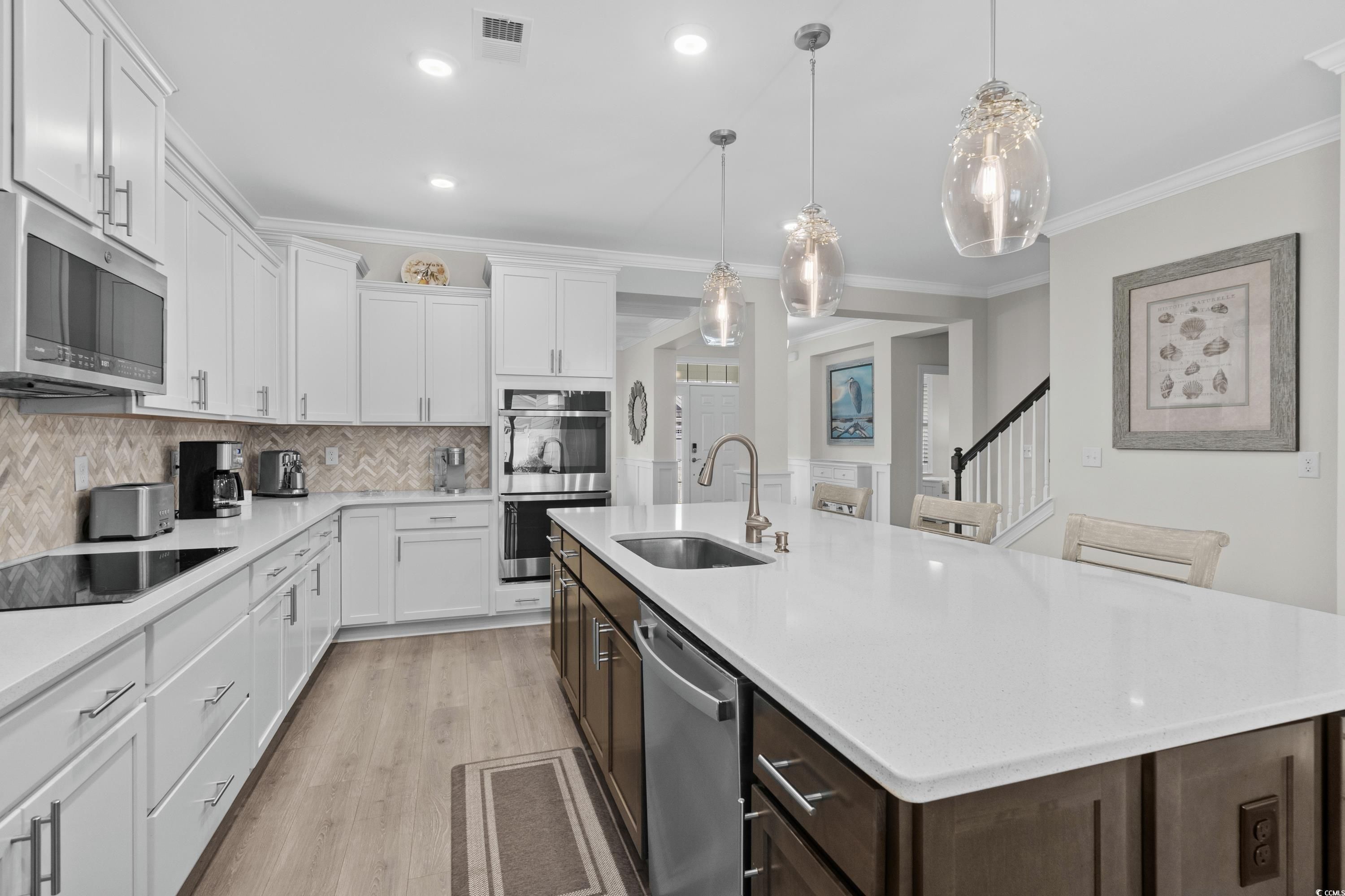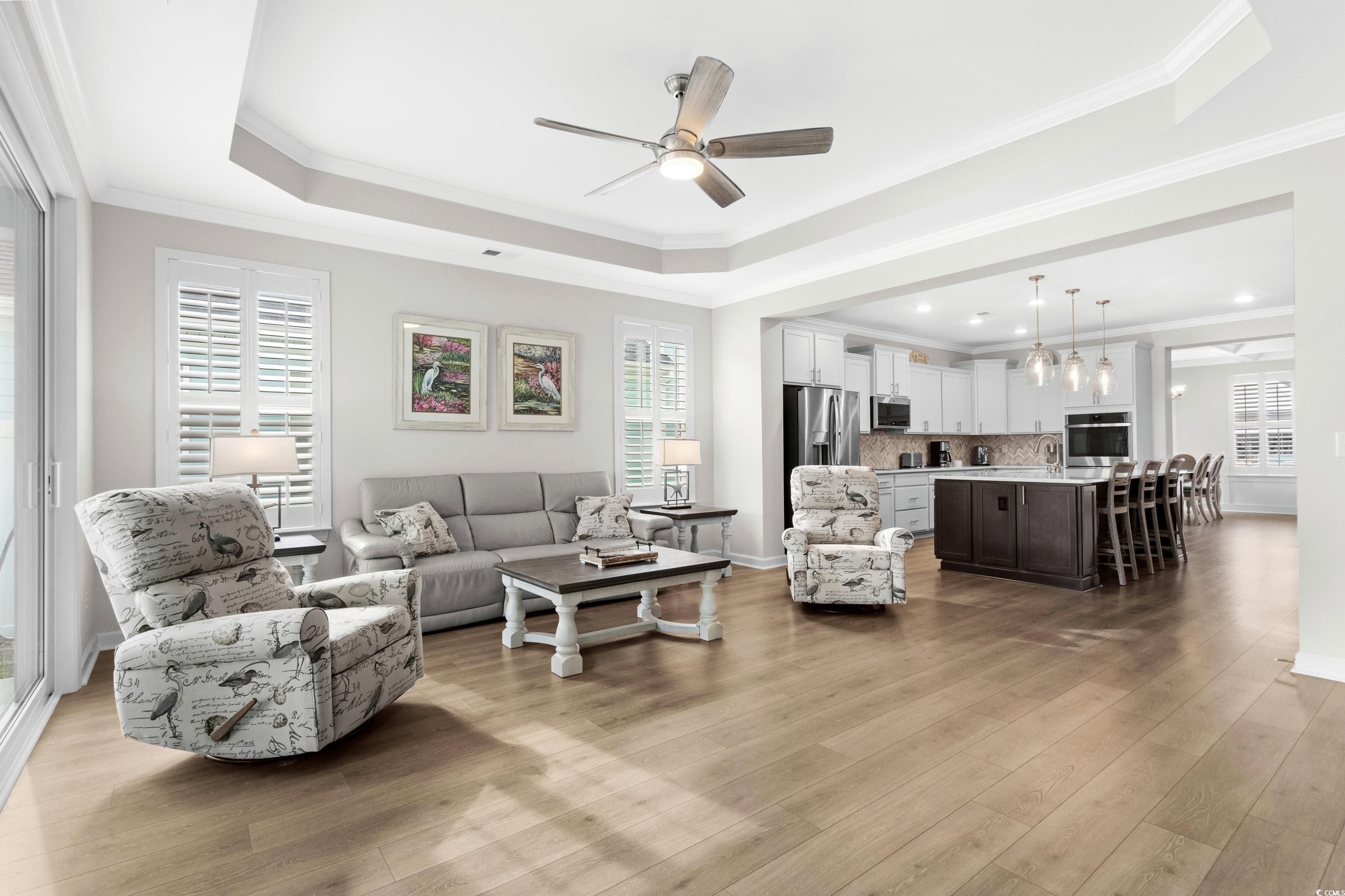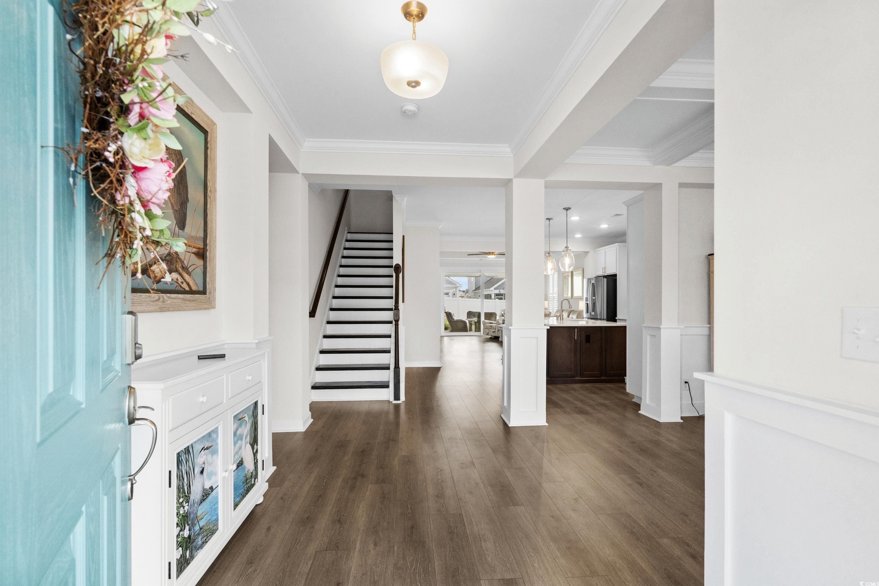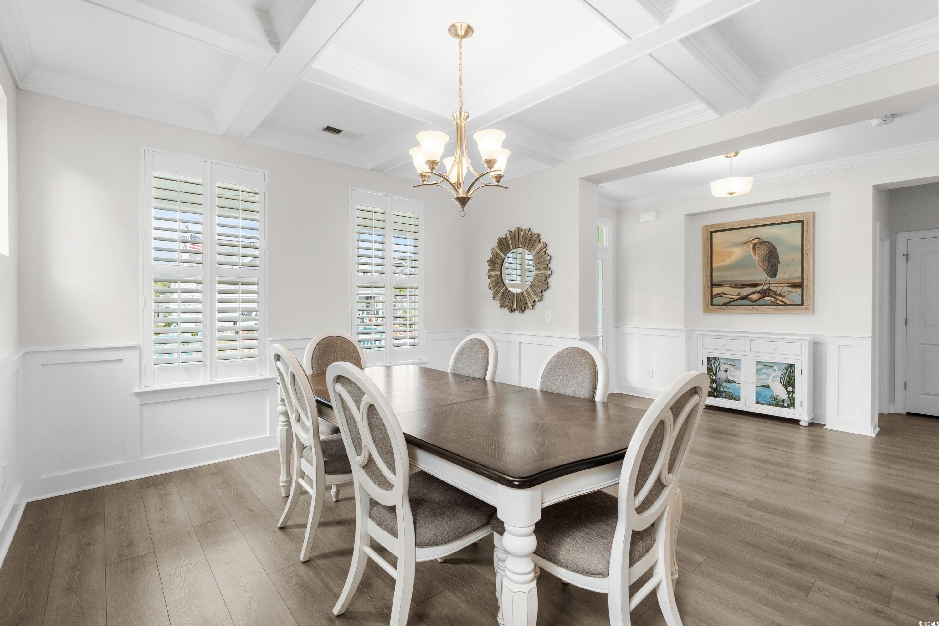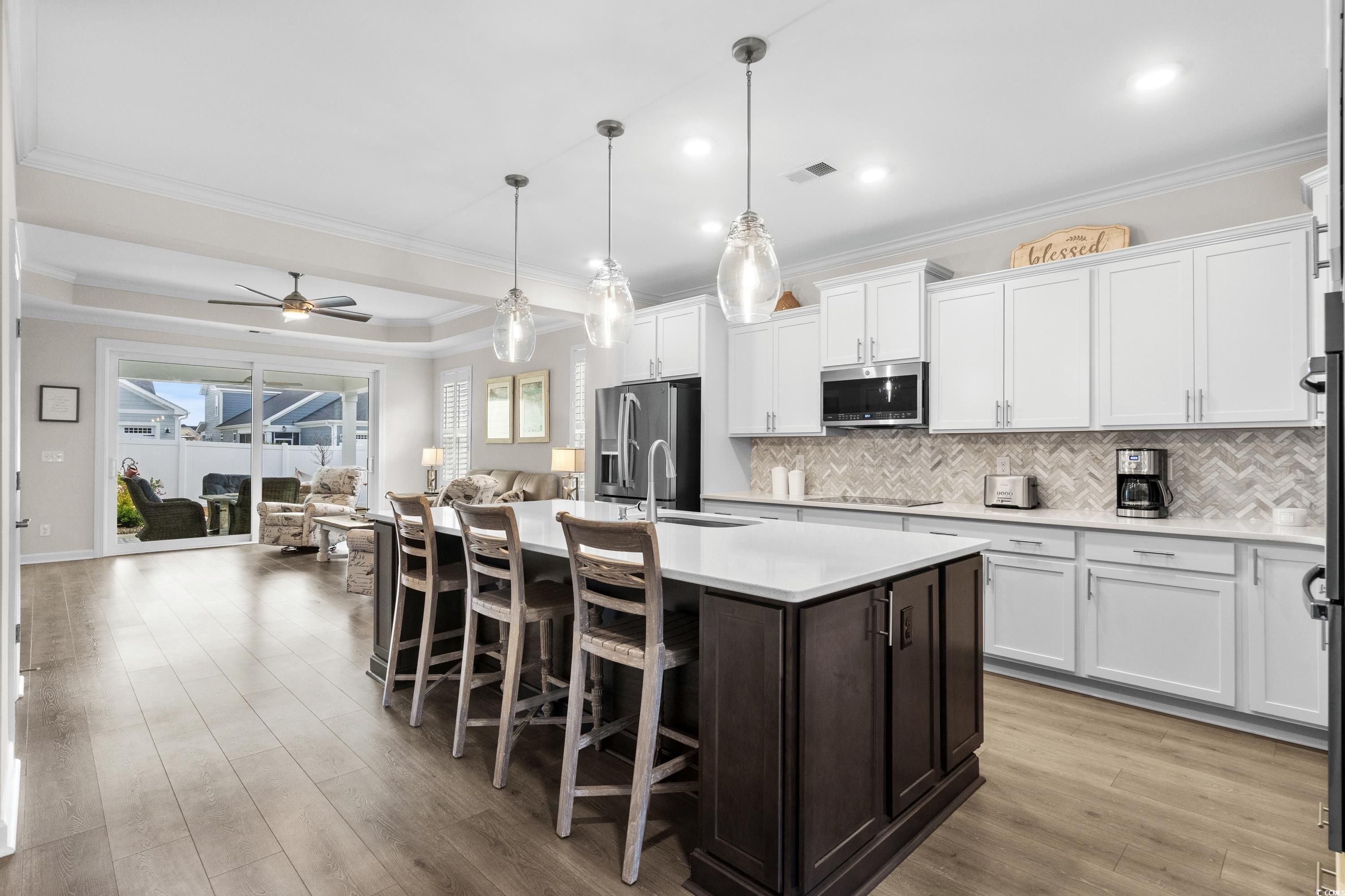 Introducing this better than new coastal inspired home which is one of the few Beach Bungalow designs built within Bridgewater. From the moment you step inside, you will be captivated by the light and bright layout featuring many windows, recessed lighting, and exquisite details including coffered and tray ceilings, extensive wainscoting, and elegant crown mouldings. The wide, welcoming foyer invites you into an open concept living space perfect for both family life and entertaining. The dining area, great room, and kitchen flow seamlessly together, creating a sense of warmth and connection. A show stopping kitchen is the focal point, featuring quartz countertops, stunning marble herringbone backsplash, plenty of cabinetry and counter space including an oversized center island/breakfast bar. Cooking is a breeze with top of the line appliances and an expansive walk-in pantry to keep everything organized. Retreat to the luxurious primary suite, where relaxation takes center stage. The en suite bathroom impresses with raised granite-topped double sinks and a spa worthy tiled walk-in shower. A second bedroom and full bathroom complete the main floor, offering comfort and convenience for family or guests. Upstairs, a third bedroom, full bathroom, and versatile loft style bonus room provide extra space for your needs--whether it's a home office, playroom, or media area. Throughout the home, LVP and tile flooring in all public spaces ensure a blend of beauty and practicality, while neutral paint colors and custom Plantation Shutters add tasteful sophistication. Storage is abundant with many closets and thoughtful storage spaces throughout the interior. The outdoor living is a joy with two covered porches and a fully fenced rear yard. Bridgewater is a vibrant community featuring unparalleled amenities including a clubhouse/amenities center, resort style pool, pickleball courts, exercise room, dog park with washing station, kayak launch and more. This community is ideally located near pristine beaches, the attractions of North Myrtle Beach, McLeod Seacoast Health Care, Brunswick County, NC with easy access to Hwy 31. Don't miss this opportunity!