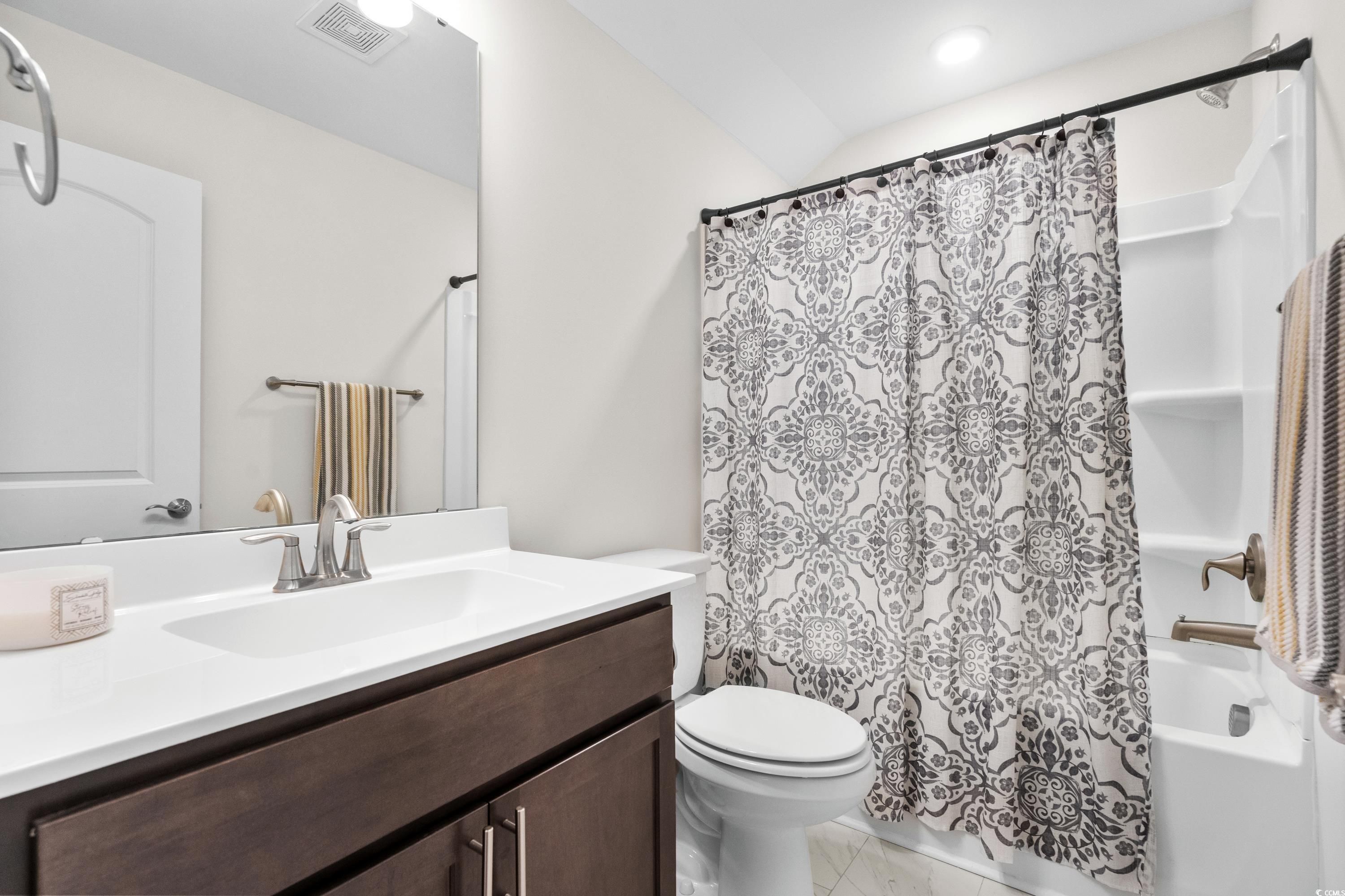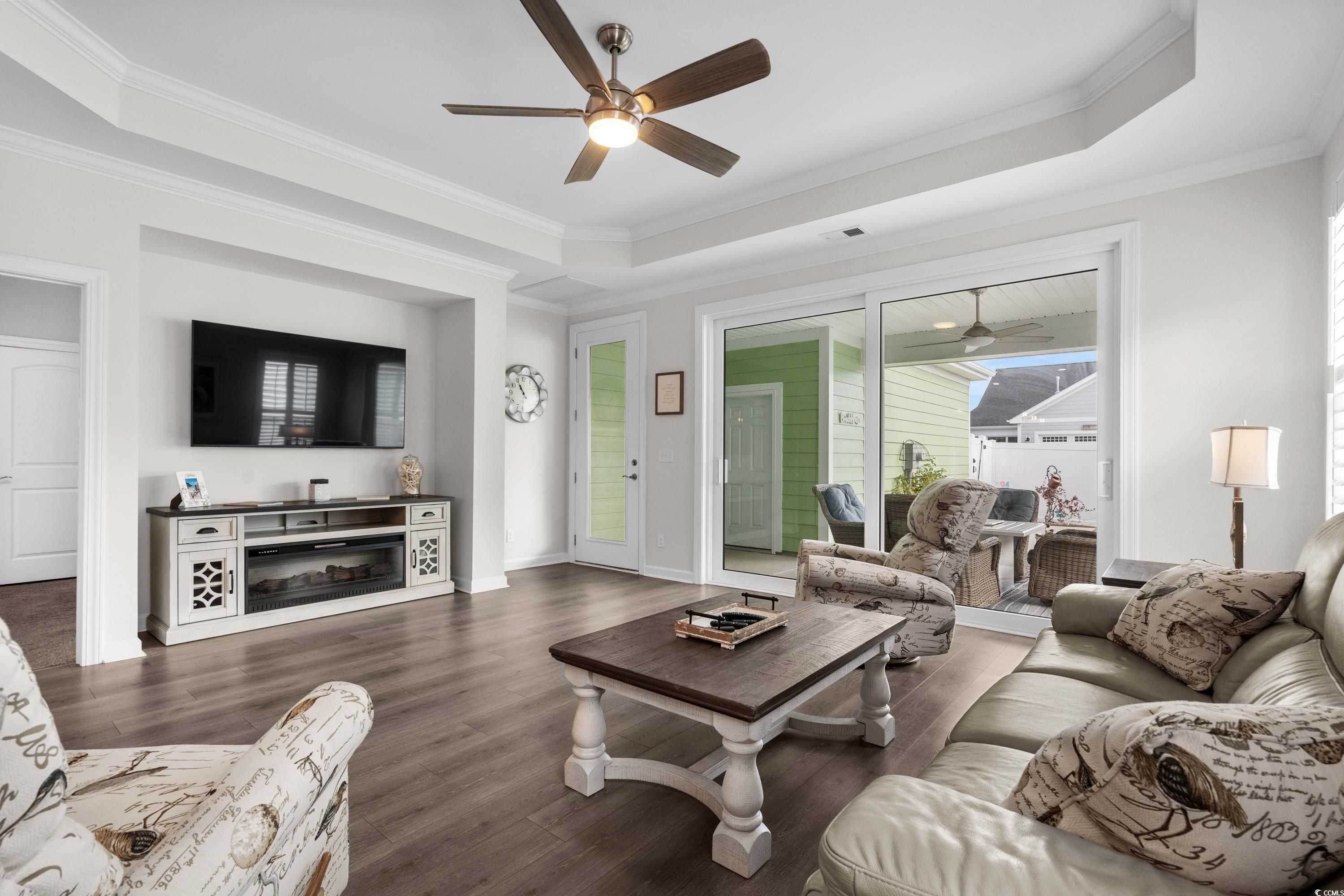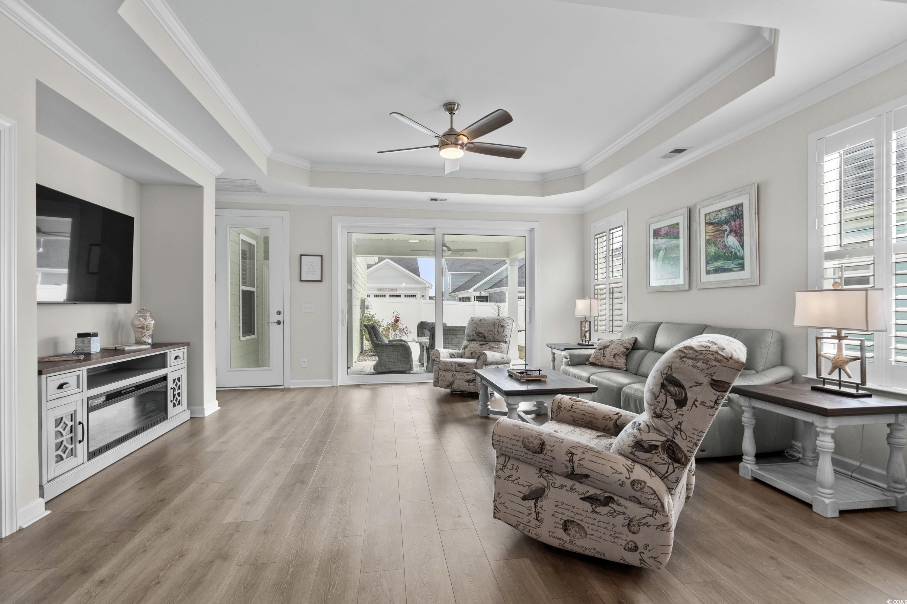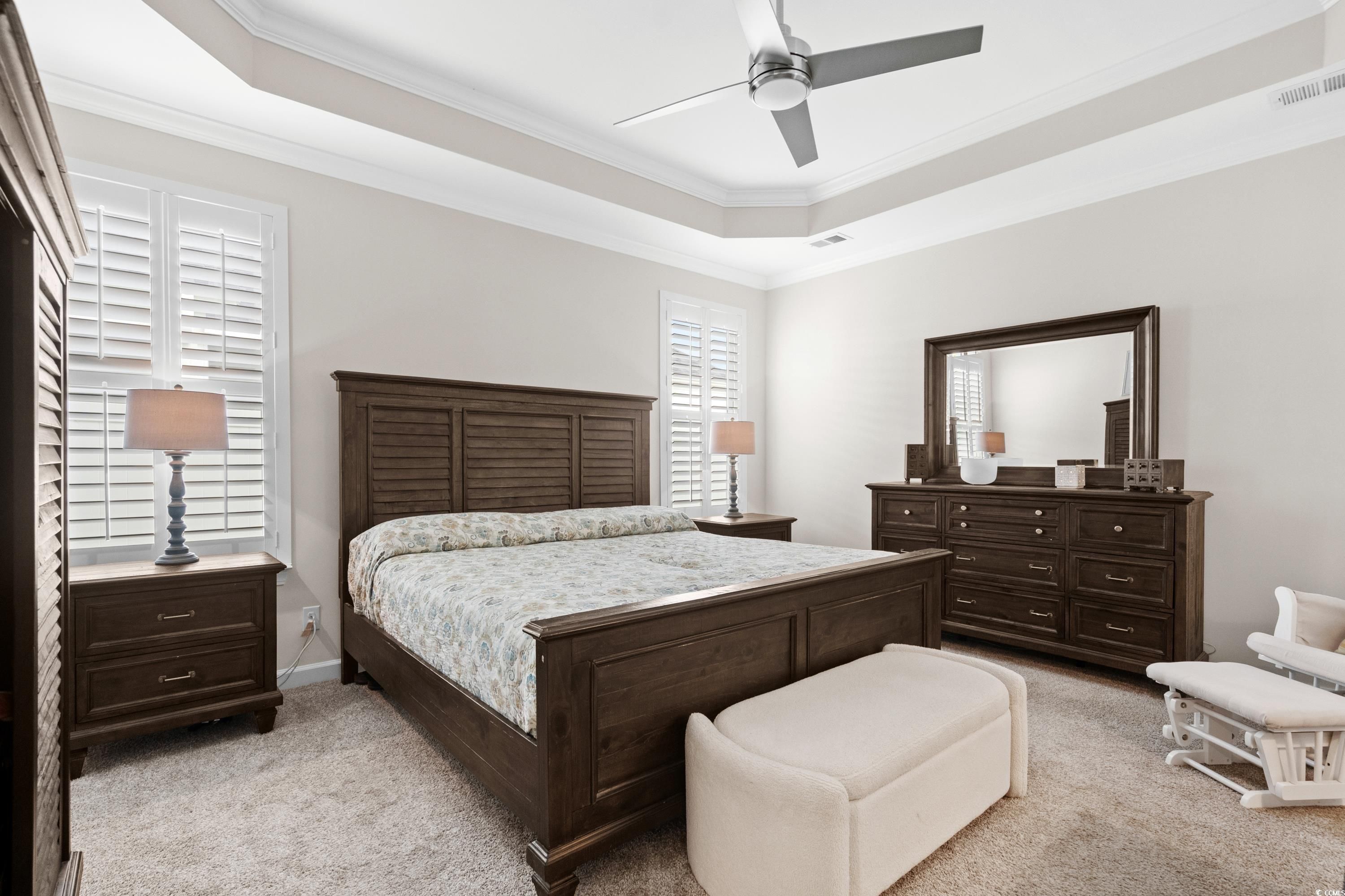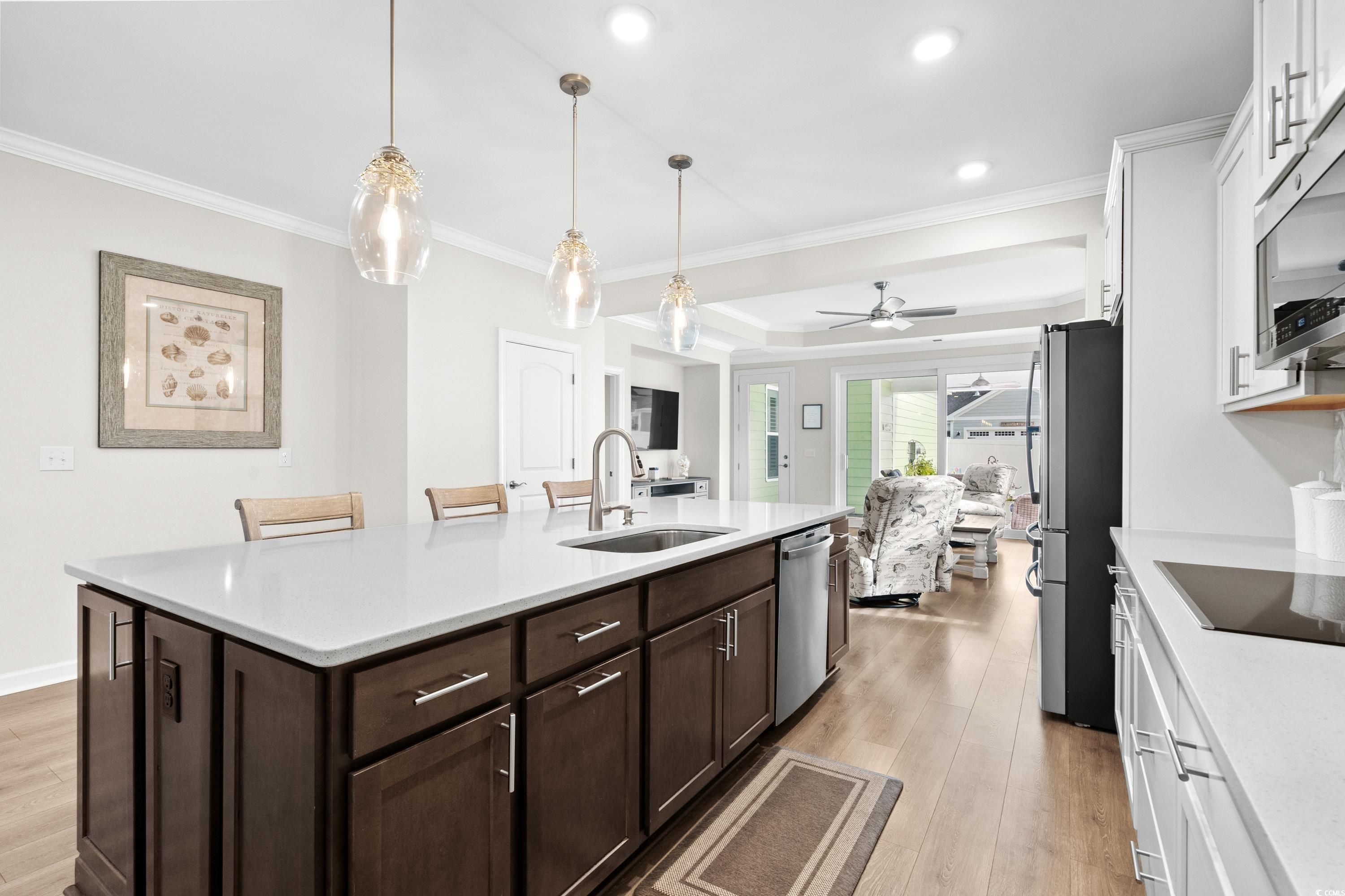 Introducing this better than new coastal inspired home which is one of the few Beach Bungalow designs built within Bridgewater. From the moment you step inside, you will be captivated by the light and bright layout featuring many windows, recessed lighting, and exquisite details including coffered and tray ceilings, extensive wainscoting, and elegant crown mouldings. The wide, welcoming foyer invites you into an open concept living space perfect for both family life and entertaining. The dining area, great room, and kitchen flow seamlessly together, creating a sense of warmth and connection. A show stopping kitchen is the focal point, featuring quartz countertops, stunning marble herringbone backsplash, plenty of cabinetry and counter space including an oversized center island/breakfast bar. Cooking is a breeze with top of the line appliances and an expansive walk-in pantry to keep everything organized. Retreat to the luxurious primary suite, where relaxation takes center stage. The en suite bathroom impresses with raised granite-topped double sinks and a spa worthy tiled walk-in shower. A second bedroom and full bathroom complete the main floor, offering comfort and convenience for family or guests. Upstairs, a third bedroom, full bathroom, and versatile loft style bonus room provide extra space for your needs--whether it's a home office, playroom, or media area. Throughout the home, LVP and tile flooring in all public spaces ensure a blend of beauty and practicality, while neutral paint colors and custom Plantation Shutters add tasteful sophistication. Storage is abundant with many closets and thoughtful storage spaces throughout the interior. The outdoor living is a joy with two covered porches and a fully fenced rear yard. Bridgewater is a vibrant community featuring unparalleled amenities including a clubhouse/amenities center, resort style pool, pickleball courts, exercise room, dog park with washing station, kayak launch and more. This community is ideally located near pristine beaches, the attractions of North Myrtle Beach, McLeod Seacoast Health Care, Brunswick County, NC with easy access to Hwy 31. Don't miss this opportunity!