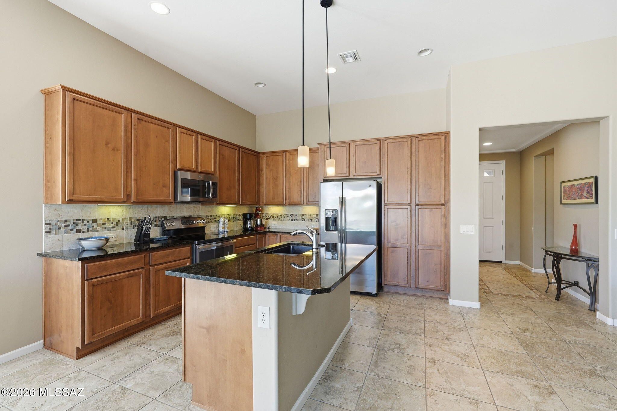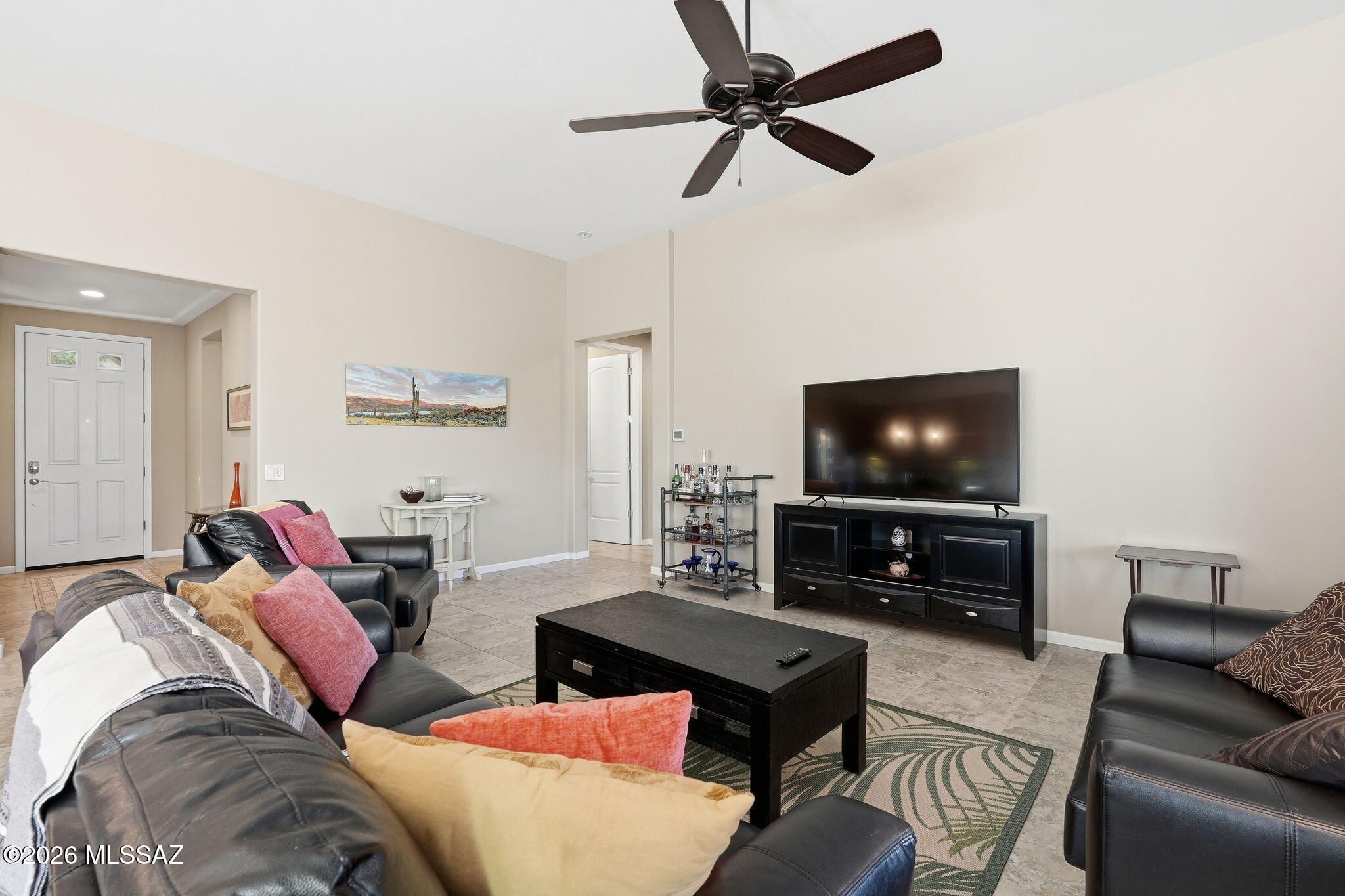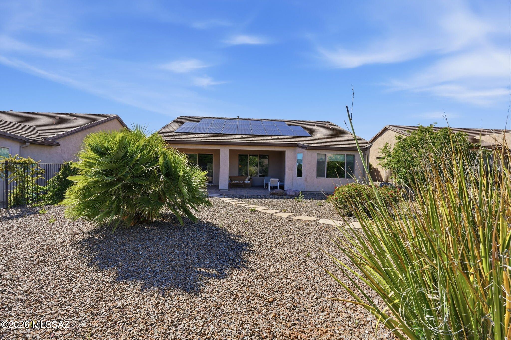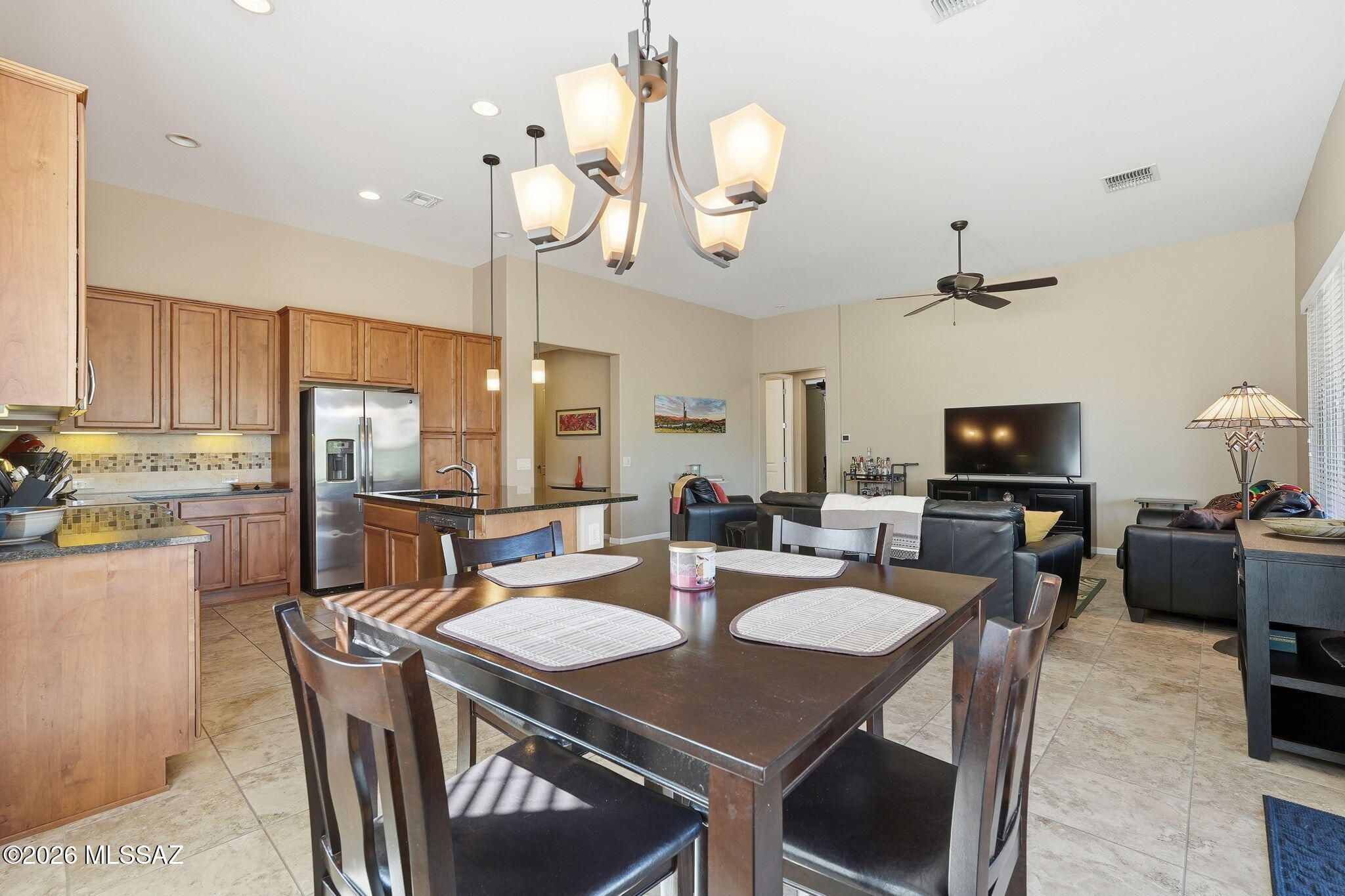 Located in the highly desirable SaddleBrooke Ranch community in Oracle, this beautifully maintained 2015 Dolce model offers mountain views and energy-efficient living with owned solar.The home features 2 bedrooms, a den, and 2.5 bathrooms across 1,769 sq ft, plus a 2-car garage. A custom tiled inlay foyer welcomes you into a bright open floor plan filled with natural light. The kitchen includes stainless steel appliances, quartz countertops with tile backsplash, and 42'' nutmeg cabinets, along with custom lighting and ceiling fans throughout. The spacious owner's suite features an updated bathroom and walk-in closet, while the guest bedroom includes an ensuite bath. Large sliding doors open to a covered paver patio with beautiful mountain views, creating the perfect place to relax & enjo