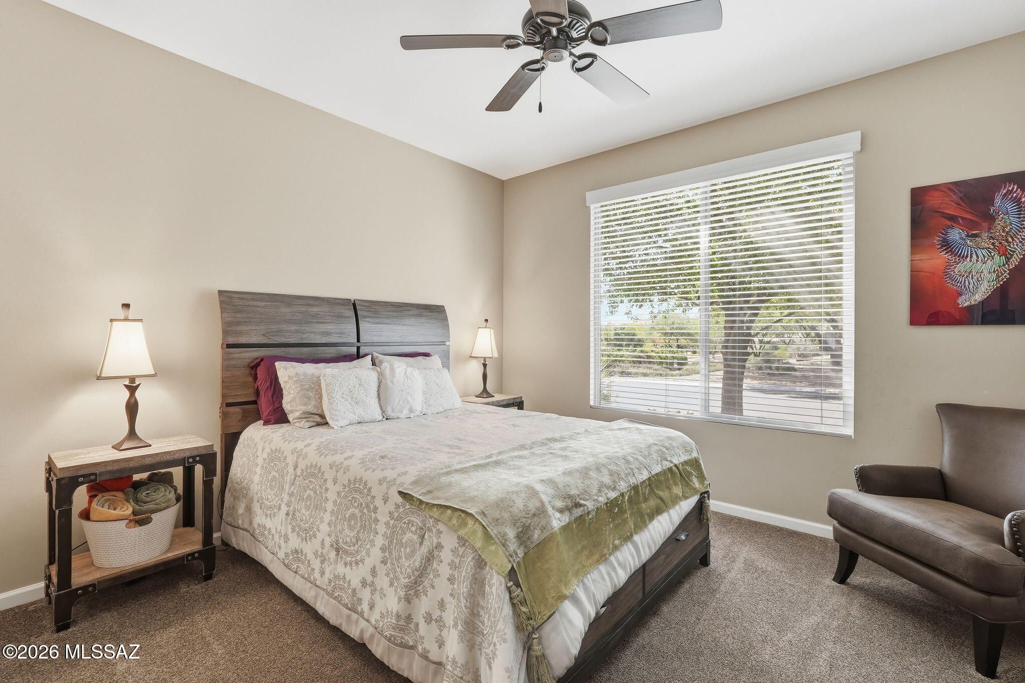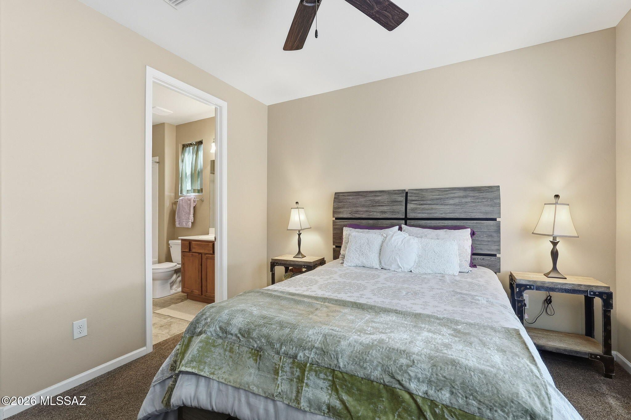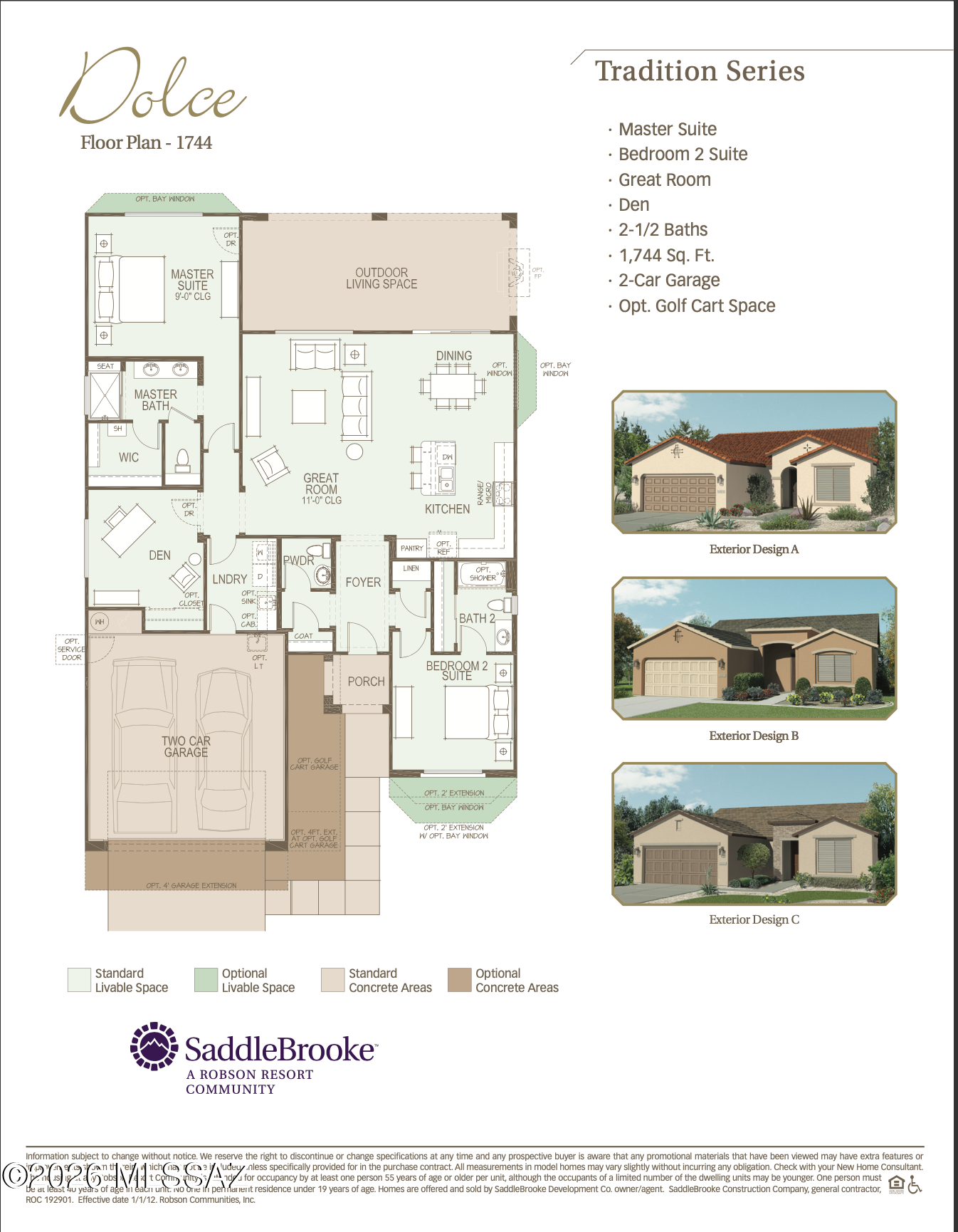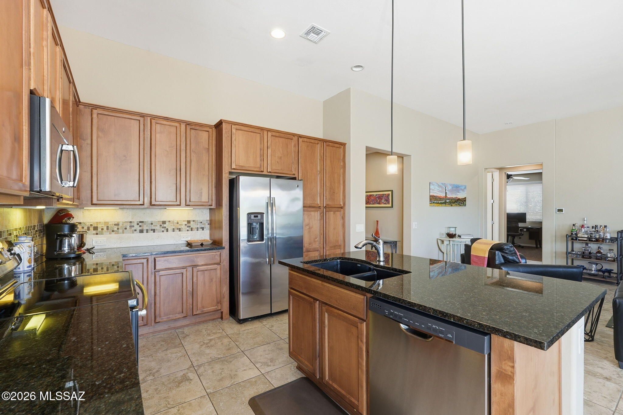 Located in the highly desirable SaddleBrooke Ranch community in Oracle, this beautifully maintained 2015 Dolce model offers mountain views and energy-efficient living with owned solar.The home features 2 bedrooms, a den, and 2.5 bathrooms across 1,769 sq ft, plus a 2-car garage. A custom tiled inlay foyer welcomes you into a bright open floor plan filled with natural light. The kitchen includes stainless steel appliances, quartz countertops with tile backsplash, and 42'' nutmeg cabinets, along with custom lighting and ceiling fans throughout. The spacious owner's suite features an updated bathroom and walk-in closet, while the guest bedroom includes an ensuite bath. Large sliding doors open to a covered paver patio with beautiful mountain views, creating the perfect place to relax & enjo