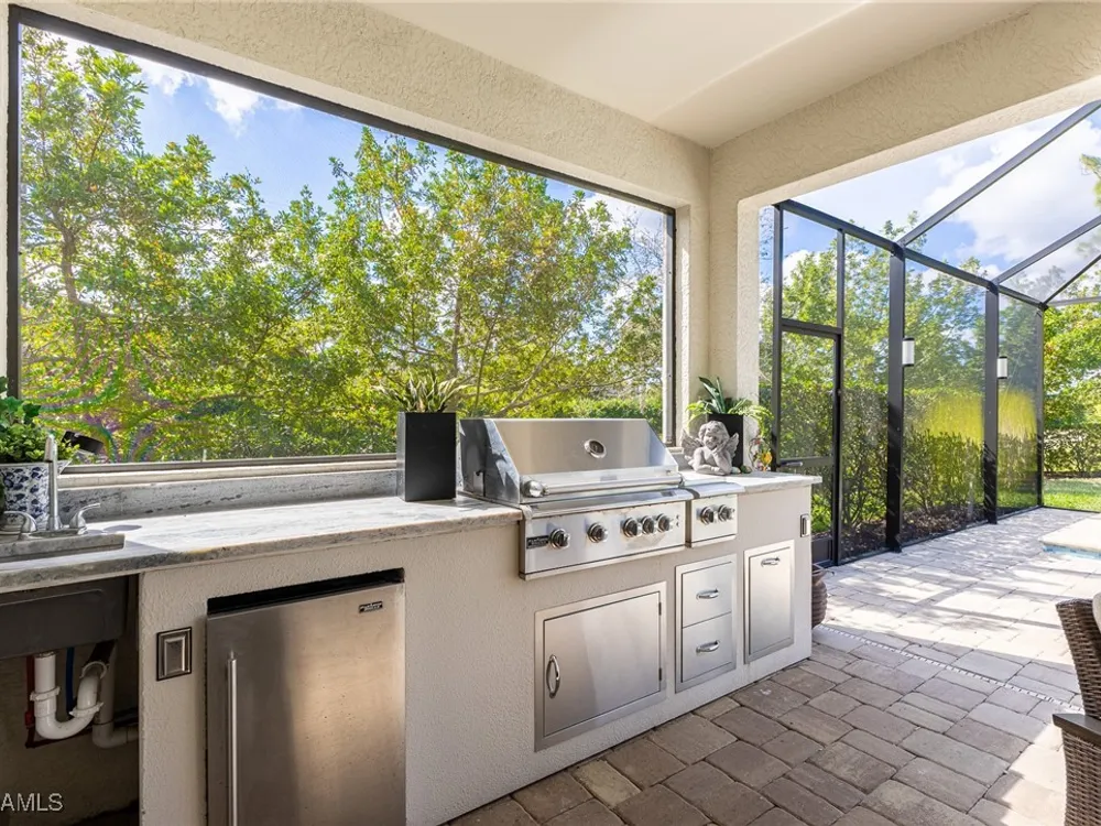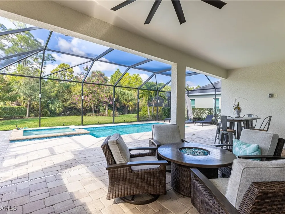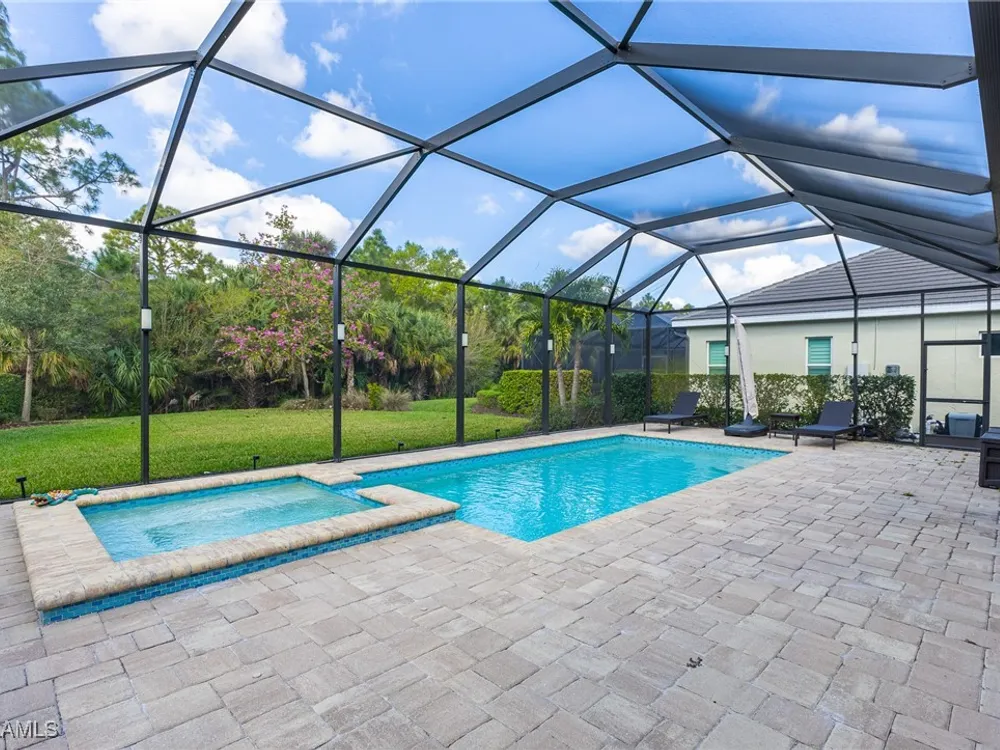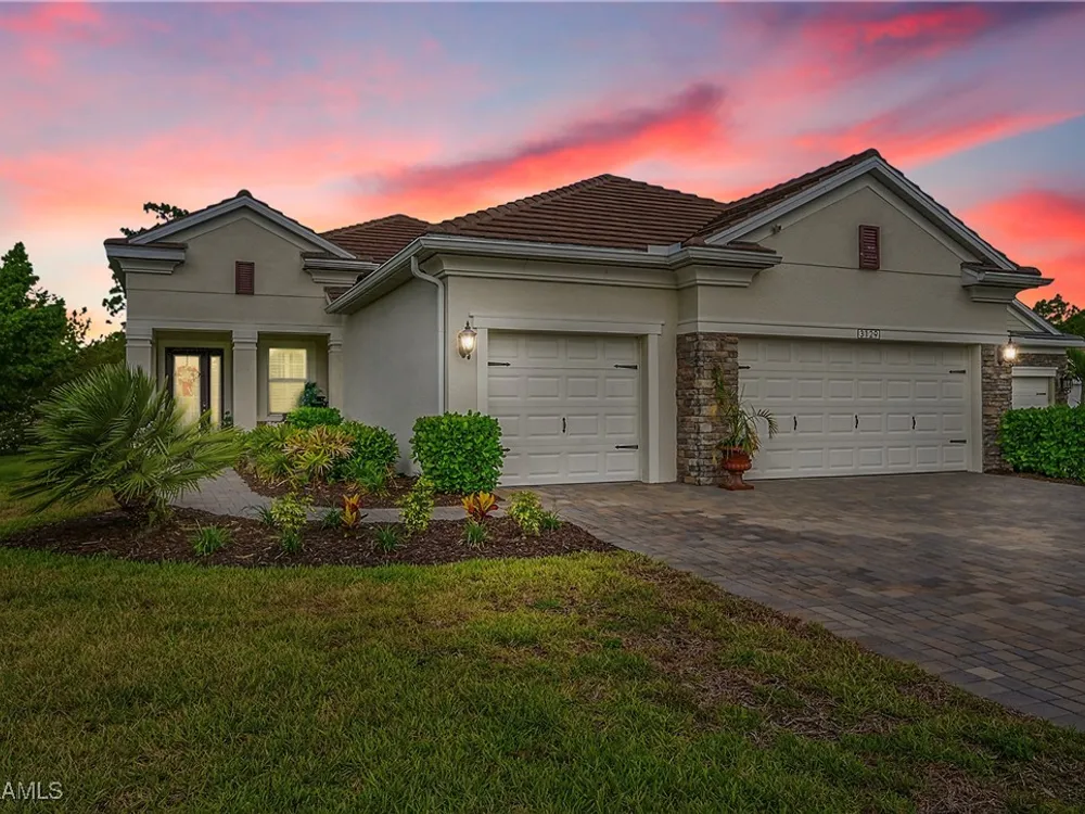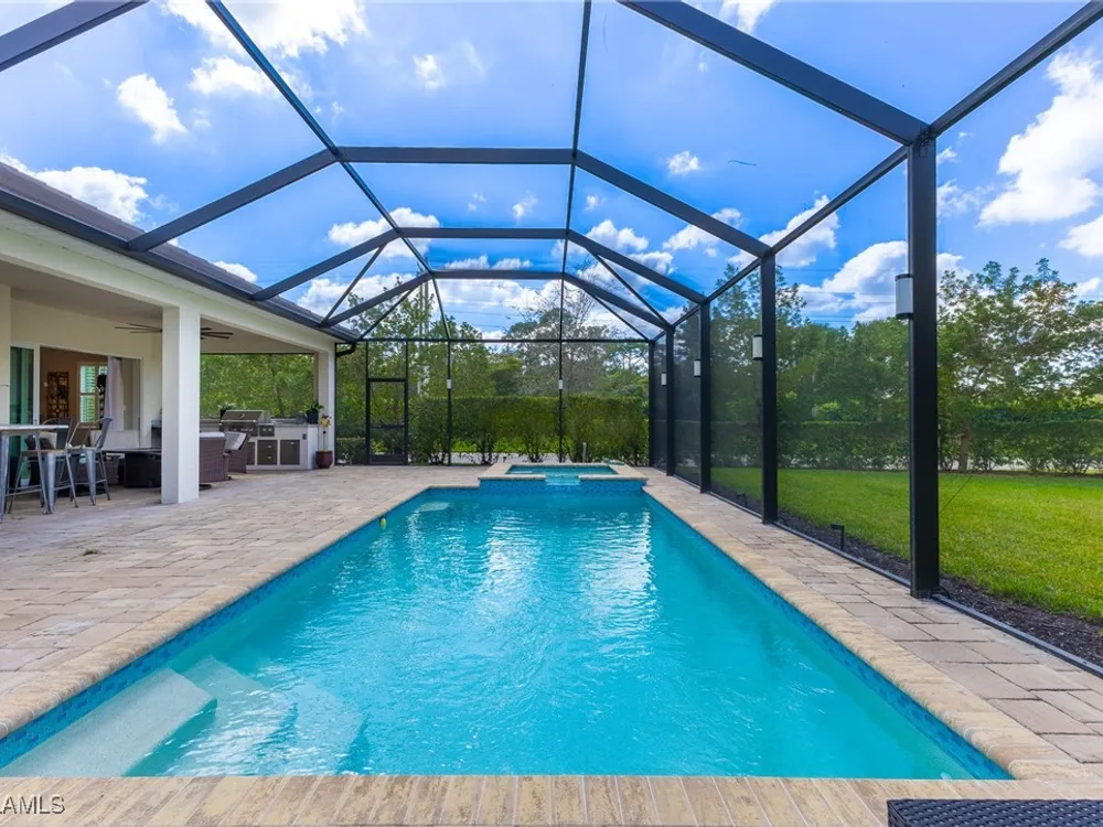 Discover the epitome of Florida living with this newer Bright Meadow model. This home already has the HURRICANE WINDOWS AND DOORS to give you the added security wanted plus it's not located in a flood zone, saving you thousands of dollars. This exquisite home boasts an inviting curb appeal starting with the desired extended driveway, an oversized three car garage and plus lush landscaping, setting the stage for the elegance that awaits inside. Once you step through the front door you'll be embraced by the spacious, open airy concept , where the natural light welcomes you and you'll discover why living in Florida is all the rave. The heart of this home features a gourmet kitchen, equipped with modern Stainless Steel appliances, ample counter space, an sizable center island, a custom walk-in pantry with its own counter bar with an added electrical outlet, making this kitchen perfect for culinary enthusiasts and entertaining family and guests. This home offers the Florida open concept that flows seamlessly into a spacious family room with Trey Ceilings, a designated eat in dining room with picturesque windows adjacent to the kitchen plus another flex space that anyone could be used as an office, workout room or another guest space, making this living area ideal for family gatherings or cozy dinners with friends. Once you open up the pocket sliding doors you'll expand your overall living area as it will lead you to the outside oasis with the expansive lanai, where you can relax by the sparkling blue pool/spa, or host a BBQ with the newer built in grill and outdoor kitchen, all while enjoying the tranquil views of nature and soaking up the Florida sun. When you are ready to call it a night, you'll love the retreat to the luxurious primary suite, featuring a spacious layout, with built in walk-in closets, a spa-like en-suite bathroom complete with dual vanities and a large modern walk in shower. The split bedroom floor plan has two additional bedrooms and a guest bathroom offers ample space for family or friends, ensuring everyone enjoys their own private sanctuary. Verandah is renowned for its Two Championship Golf Courses, Beautiful Landscaping, 9 miles of walking/jogging scenic trails, eight new pickleball courts, clay tennis courts, Bocce Ball, Free Kayak Rental for the Orange River, a Community Lap Pool, Massage Rooms, Fitness Center, a Dog Park, Two Restaurants, a clubhouse, and recreational facilities. This home is not just a residence; it's a lifestyle, providing the perfect blend of tranquility and community.
