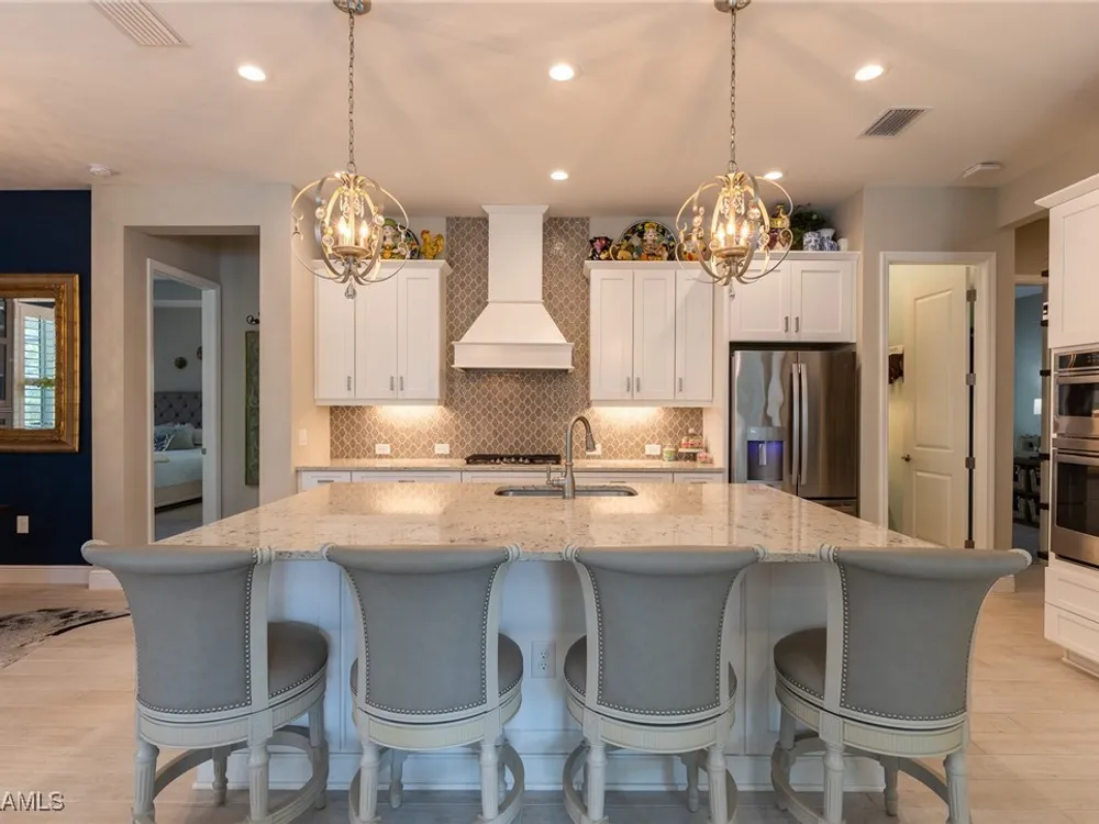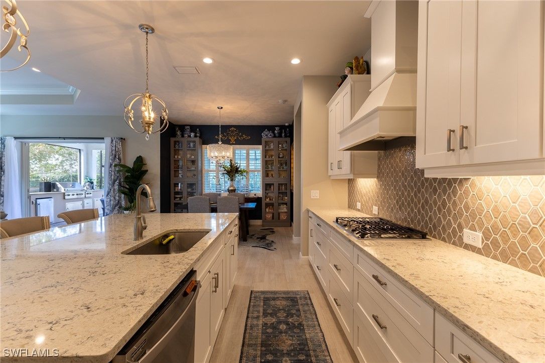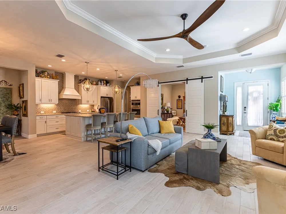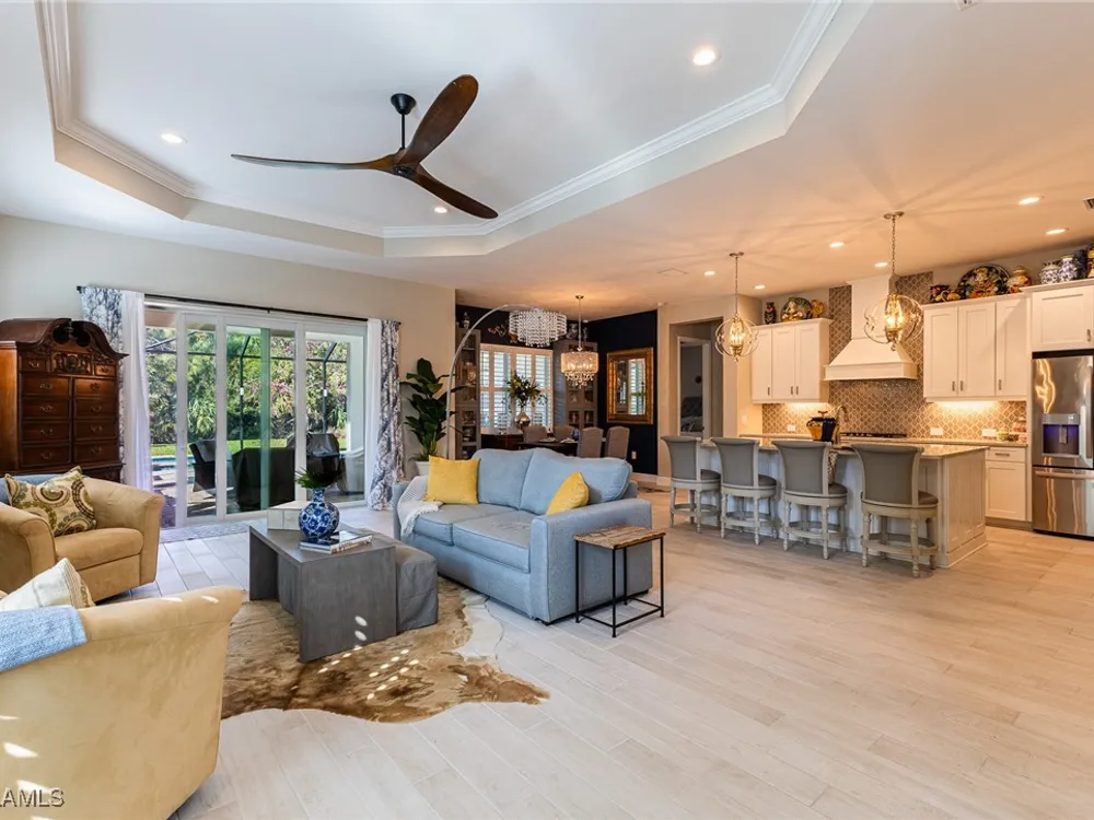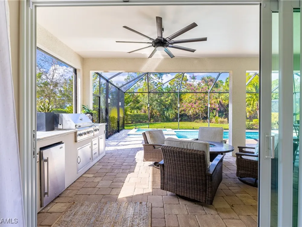 Discover the epitome of Florida living with this newer Bright Meadow model. This home already has the HURRICANE WINDOWS AND DOORS to give you the added security wanted plus it's not located in a flood zone, saving you thousands of dollars. This exquisite home boasts an inviting curb appeal starting with the desired extended driveway, an oversized three car garage and plus lush landscaping, setting the stage for the elegance that awaits inside. Once you step through the front door you'll be embraced by the spacious, open airy concept , where the natural light welcomes you and you'll discover why living in Florida is all the rave. The heart of this home features a gourmet kitchen, equipped with modern Stainless Steel appliances, ample counter space, an sizable center island, a custom walk-in pantry with its own counter bar with an added electrical outlet, making this kitchen perfect for culinary enthusiasts and entertaining family and guests. This home offers the Florida open concept that flows seamlessly into a spacious family room with Trey Ceilings, a designated eat in dining room with picturesque windows adjacent to the kitchen plus another flex space that anyone could be used as an office, workout room or another guest space, making this living area ideal for family gatherings or cozy dinners with friends. Once you open up the pocket sliding doors you'll expand your overall living area as it will lead you to the outside oasis with the expansive lanai, where you can relax by the sparkling blue pool/spa, or host a BBQ with the newer built in grill and outdoor kitchen, all while enjoying the tranquil views of nature and soaking up the Florida sun. When you are ready to call it a night, you'll love the retreat to the luxurious primary suite, featuring a spacious layout, with built in walk-in closets, a spa-like en-suite bathroom complete with dual vanities and a large modern walk in shower. The split bedroom floor plan has two additional bedrooms and a guest bathroom offers ample space for family or friends, ensuring everyone enjoys their own private sanctuary. Verandah is renowned for its Two Championship Golf Courses, Beautiful Landscaping, 9 miles of walking/jogging scenic trails, eight new pickleball courts, clay tennis courts, Bocce Ball, Free Kayak Rental for the Orange River, a Community Lap Pool, Massage Rooms, Fitness Center, a Dog Park, Two Restaurants, a clubhouse, and recreational facilities. This home is not just a residence; it's a lifestyle, providing the perfect blend of tranquility and community.