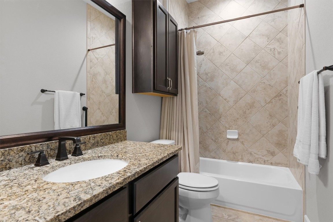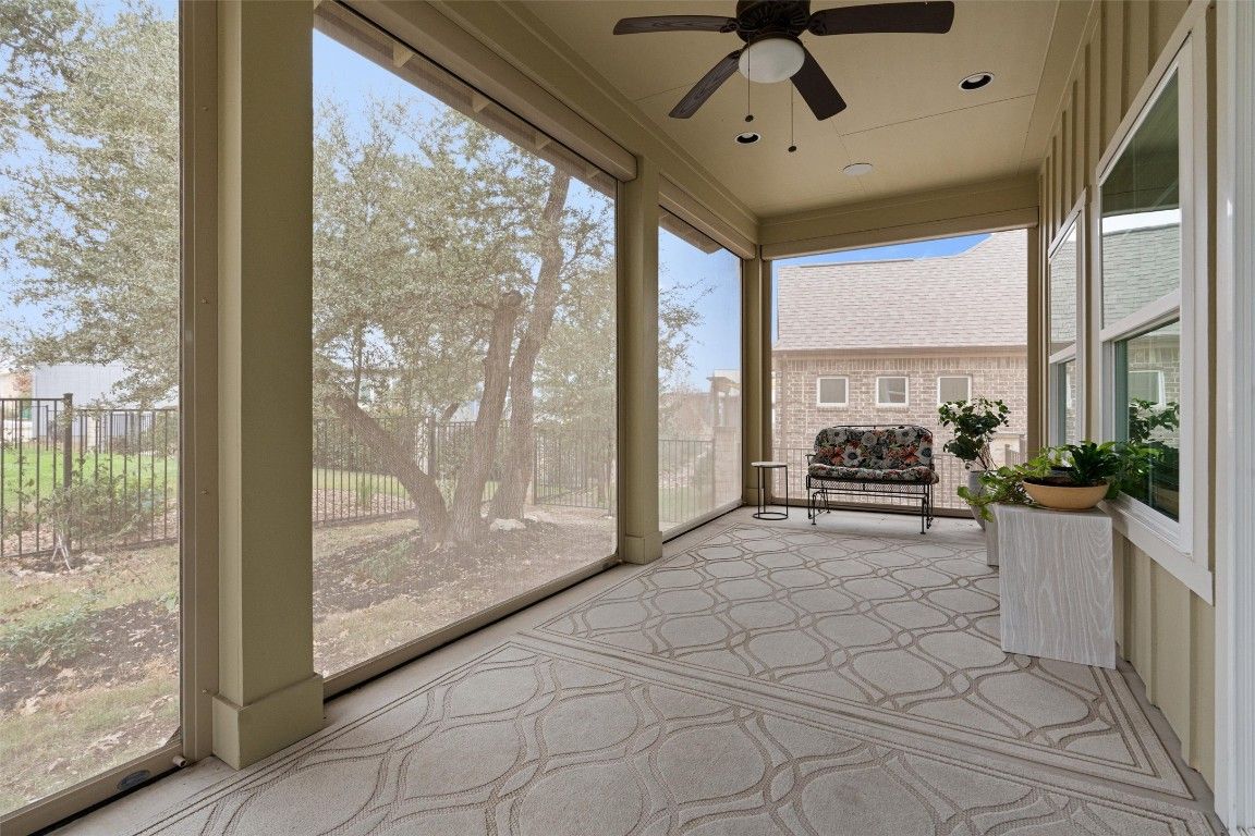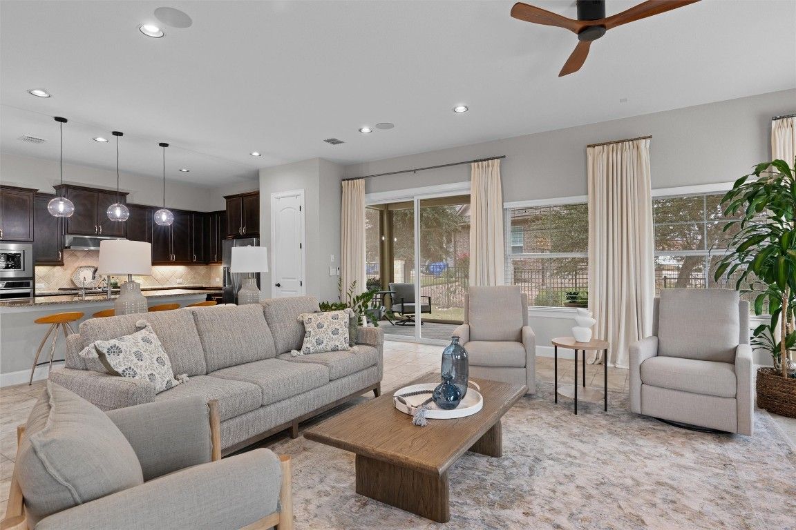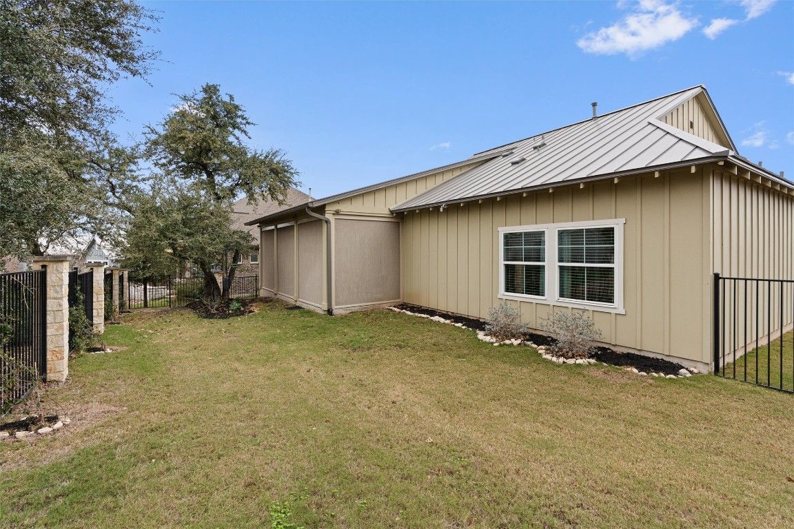 Modern Farmhouse design with a METAL Roof & whole home Generac generator! Classic covered front porch, spacious open floor plan, easy living and/or entertaining. Large breakfast bar and dining room adjacent to the kitchen. Tile flooring and recent Luxury Vinyl floors. Expansive kitchen counter space & cabinets, under-cabinet lighting, breakfast bar with under-counter seating, reverse-osmosis system under kitchen sink, nice laundry room with storage, high ceilings & large covered patio with automatic solar shades for shade & privacy. Nice fully-fenced backyard with some trees and plenty of space for your dogs to run or for a large garden! This home has the farmhouse exterior with contemporary interior features, the best of both designs!. Refrigerator & washer/dryer stays as well as draperies. Lots of windows for natural light. This home has curb appeal & is close to all Kissing Tree amenities.