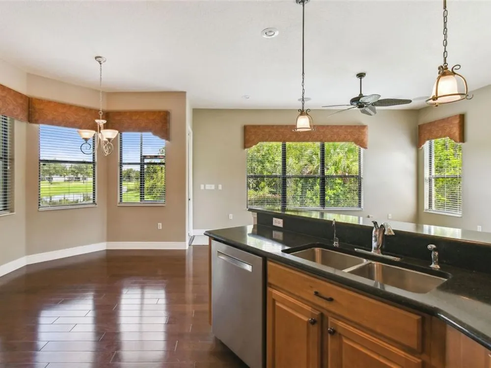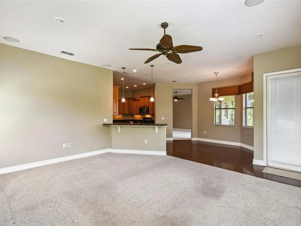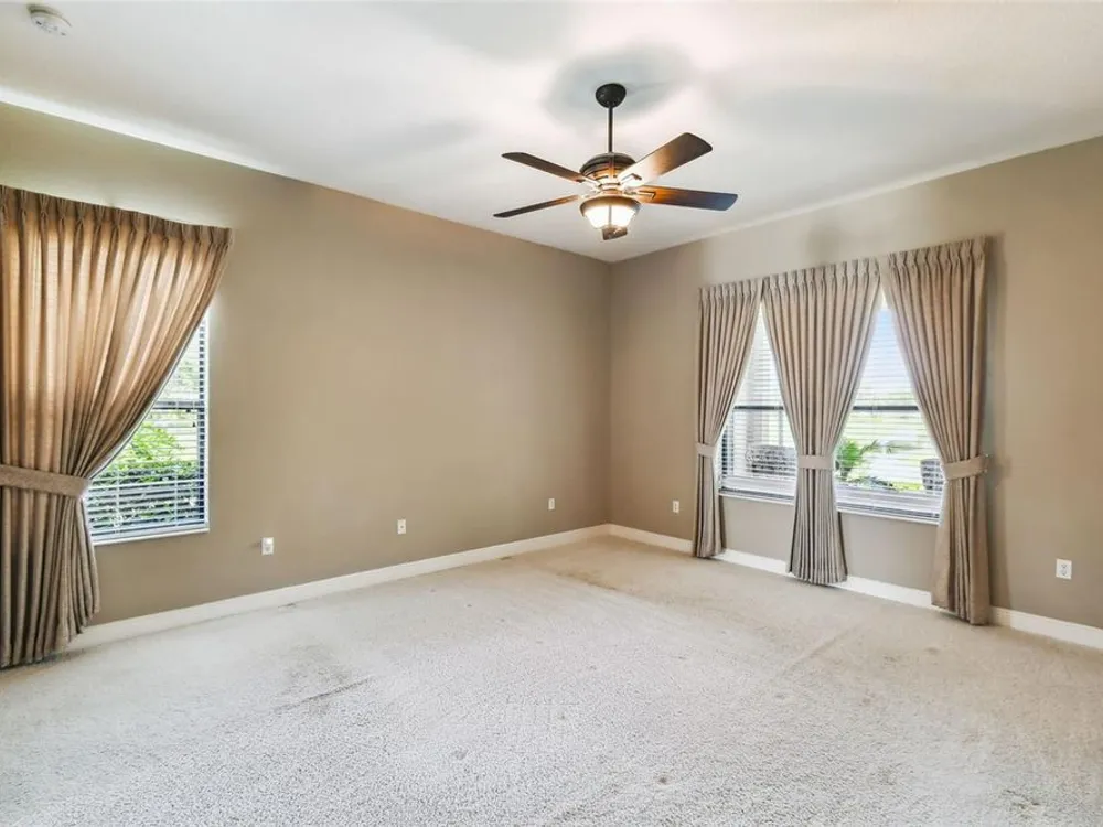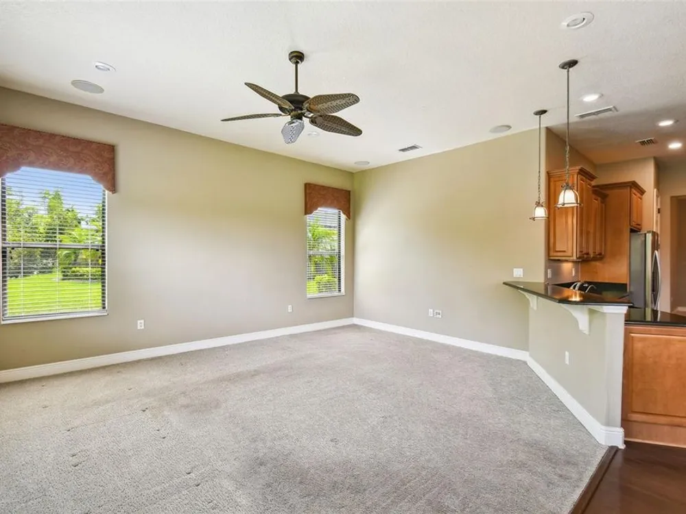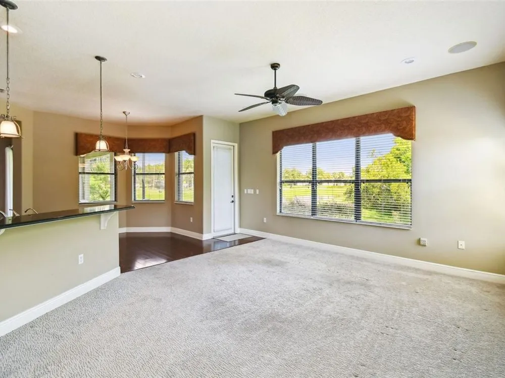 - Ceiling Fan(s), Eat-in Kitchen, High Ceilings, Kitchen/Family Room Combo, Living/Dining Room, Split Bedrooms, Stone Counters, Thermostat, Walk-In Closet(s), Window Treatments