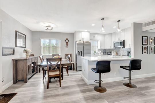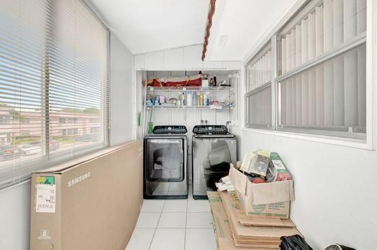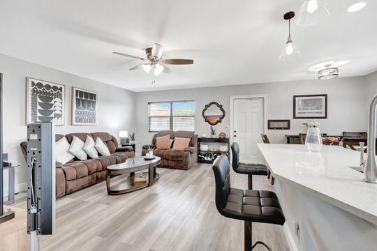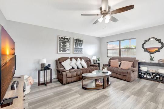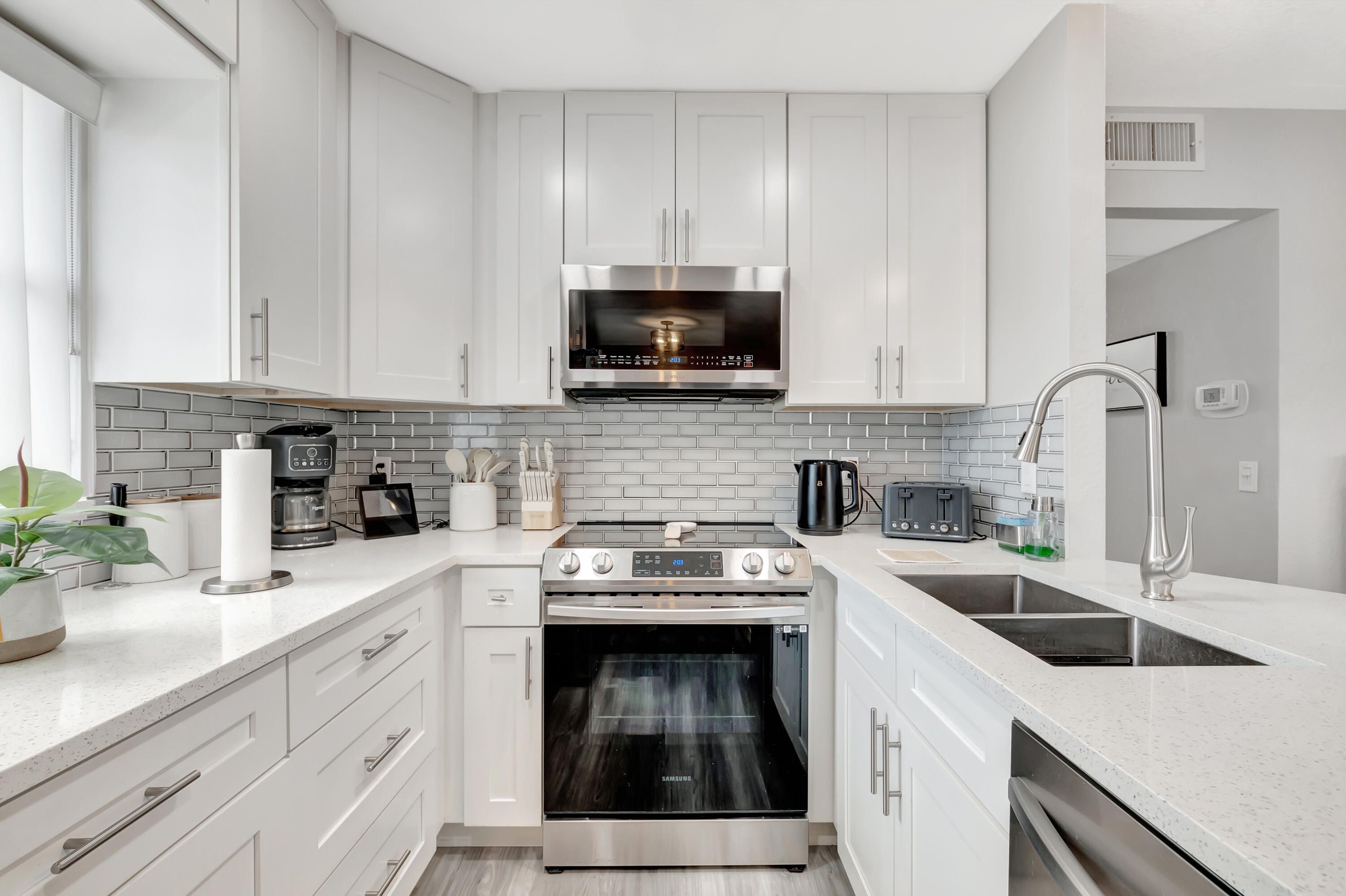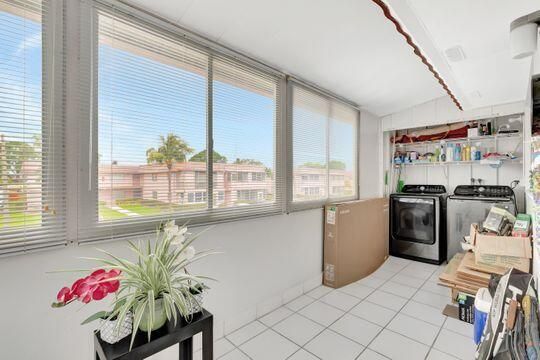 Charming 2 Bedroom/ 2 Bathroom delightful second floor end unit offers comfortable convenient living in a resort-style setting. Bright and airy layout that is an open floor plan with laminate flooring throughout. The entire unit has a modern remodel with white shaker cabinets, sleek quartz counter tops, tile backsplash, and stainless steel appliances. The unit has a scenic water view and an enclosed patio with a full size washer and dryer. The A/C was replaced in 2024.The community offers multiple club houses and pools. It also has tennis and pickle ball courts, a fitness center, spa, sauna, and golf courses. There are also restaurant venues, weekly live theater, arts and crafts library, and courtesy buses. This is a 55+ community.