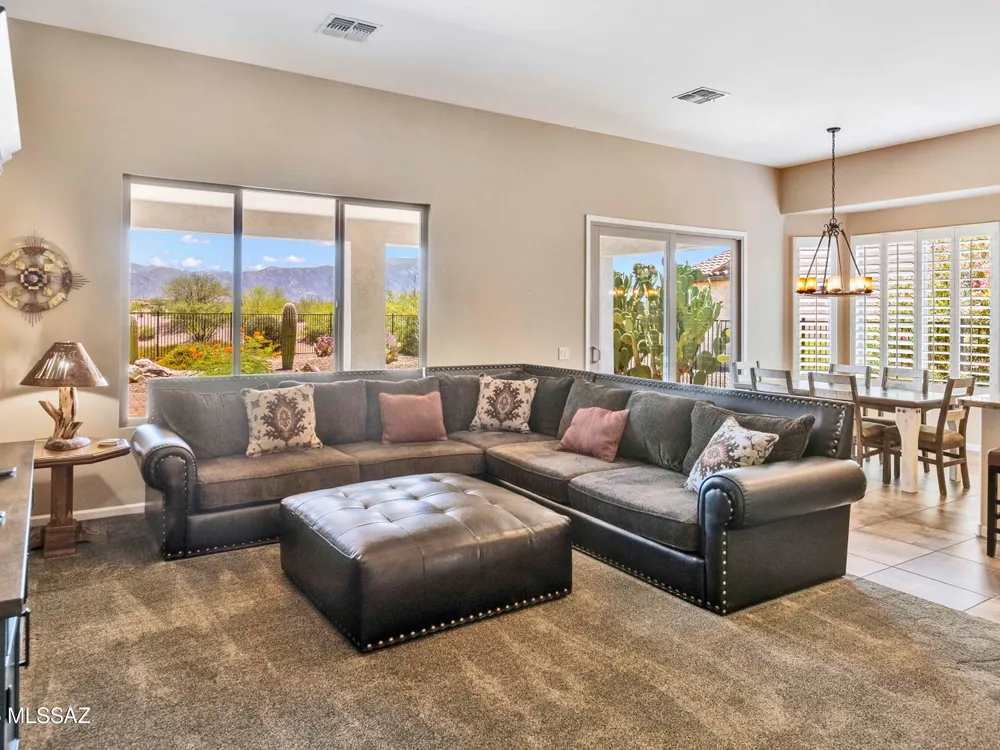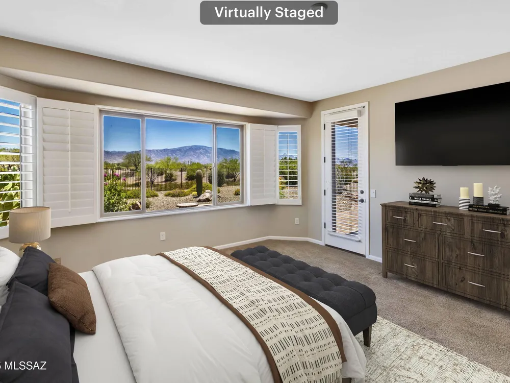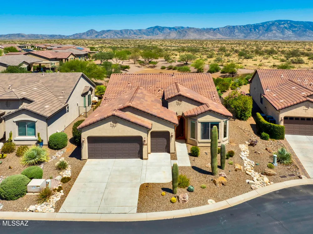 Majestic Catalina mountain views steal the spotlight at this elevated 1,869 sq. ft. DOLCE Model--nestled within SaddleBrooke Ranch. From the moment you step inside, soaring 11-foot ceilings frame wide-open vistas that bring Mt Lemmon in! This beautiful 2-bedroom, 2.5-bath home features an open-concept layout. Den/office could be converted to a 3rd bedroom.The Great Room transitions seamlessly into a beautiful Kitchen, adorned with a decorative backsplash, sleek quartz counters, stainless steel appliances, and an inviting island with counter seating. Both bedrooms offer private en-suite baths for comfort and relaxation. The Primary Suite features a walk-in closet and a spa-inspired bath with dual sinks, accompanied by a luxurious tile-surround walk-in shower with a coordinated backsplash.