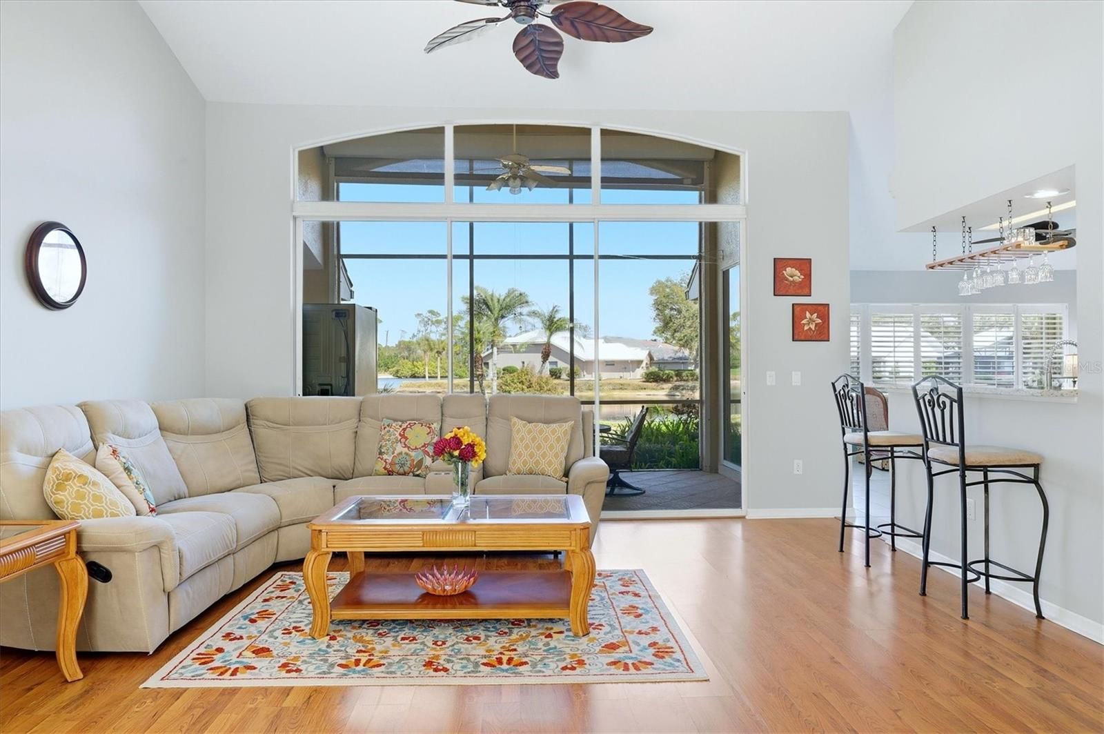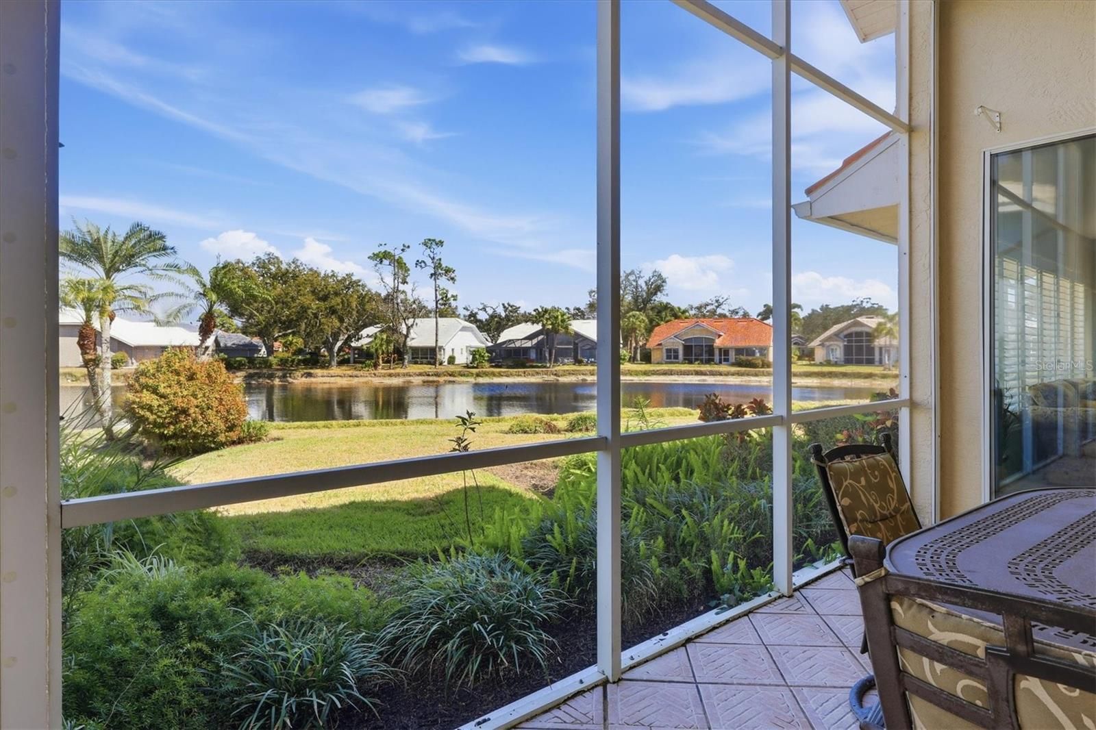 Premium Corner Lot Waterfront Home with Stunning Golf Views! Enjoy breathtaking long views of the tranquil pond and the 6th green from this beautifully maintained home on a premium oversized corner lot in Riverwood’s desirable Stonebridge neighborhood. Offering exceptional privacy and plenty of space to add a private pool, this 2 bed/2 bath residence features soaring cathedral ceilings, a split bedroom layout, and an oversized 2 car garage. Multiple sliding doors open to the extended lanai, creating a true indoor outdoor living experience with stunning water and golf course vistas. The kitchen boasts new stainless steel appliances and granite countertops, while both bathrooms include dual vanities. The master suite offers dual closets and peaceful views. Stylish tile and laminate flooring, plantation shutters, and full hurricane protection—including electric Kevlar lanai shutters—add to the home's appeal. Major updates include a new roof (2020), new A/C (2020), and new water heater (2023). Offered turnkey furnished for immediate enjoyment. Riverwood residents enjoy resort style amenities—pools, tennis, pickleball, fitness, activity centers, and dog parks. Optional memberships offer access to the Riverwood Golf Club and the Private Beach Club on Manasota Key. Conveniently located near beaches, boating, dining, and shopping, this home delivers the perfect blend of natural beauty and an exceptional Florida lifestyle.