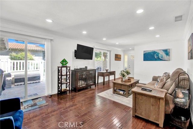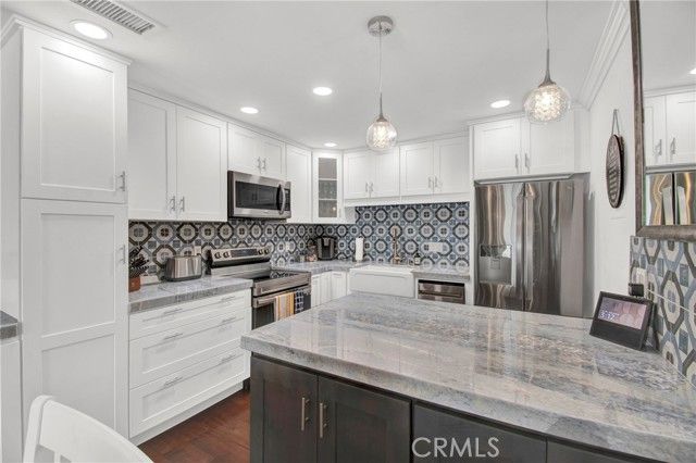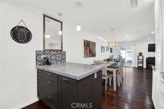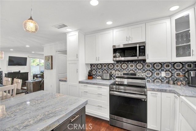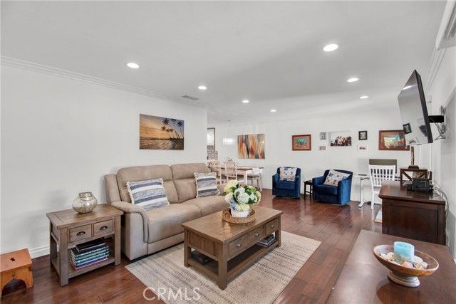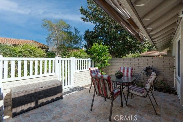 WHEN ONLY THE BEST WILL DO! This end unit, 2 bedroom, 2 remodeled baths, Ventura model, shows like a model. Beautiful, large living room & dining room with crown moldings to Accent the smooth ceilings. Dual pane windows, indirect lighting throughout and hardwood floors. TOTALLY REDESIGNED KITCHEN! Every conceivable upgrade! Stainless steel appliances, quartz countertops with a dynamic backsplash! pendant lighting! And much more! sliding glass door opens to the large patio with newer tile flooring & an awning for shade. Relax & enjoy entertaining & relaxing. This is an end unit with none above or below. Central Air Conditioning & full sized wash dryer closet. Laguna Woods offers a 27 hole golf course with a beautiful restaurant to enjoy! Driving range, tennis courts, pickleball courts, volleyball, 2 fitness centers, lawn bowling, equestrian center, library, state of the art theater, 5 pools & over 200 clubs! hurry, this one won't last