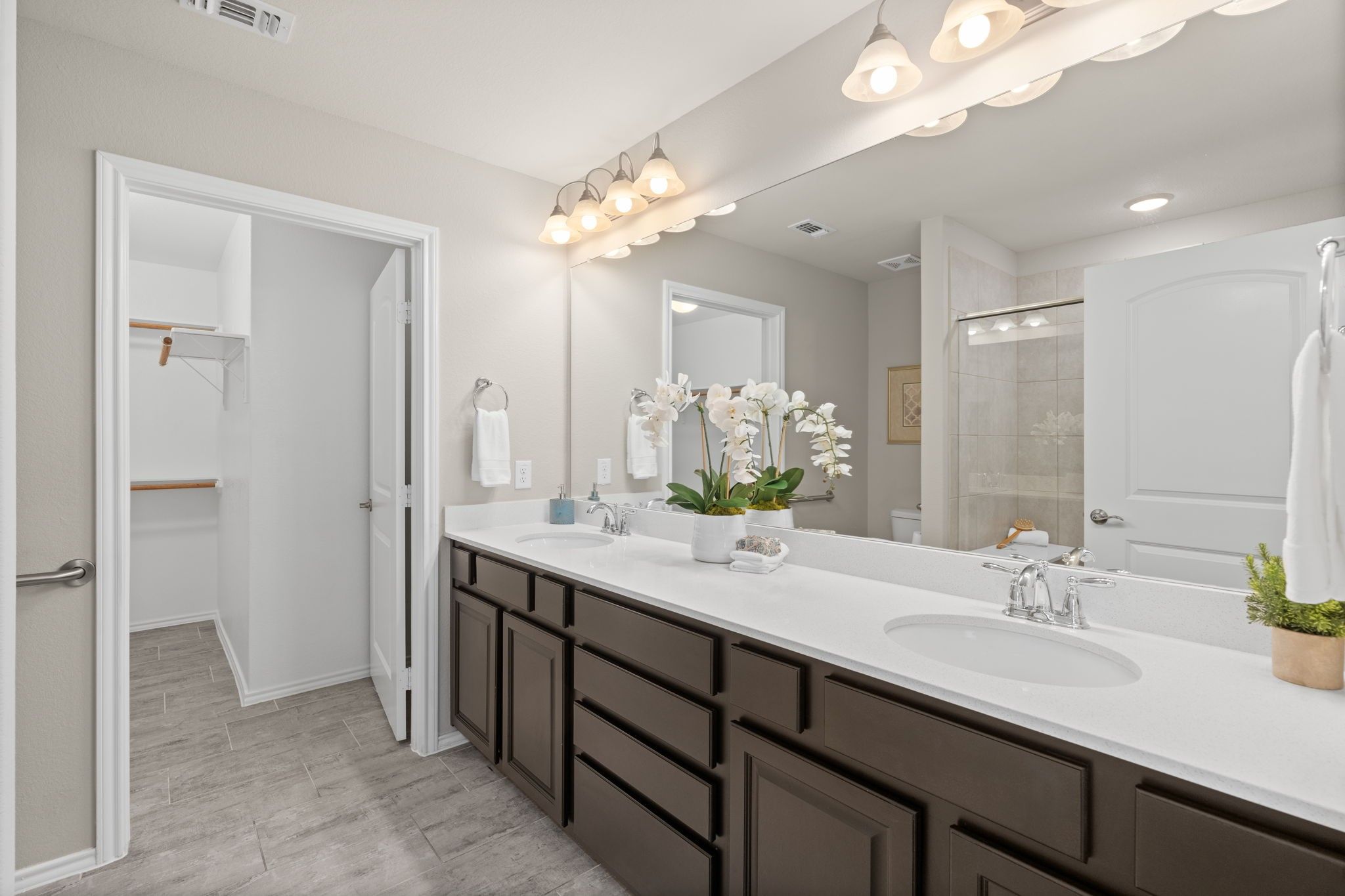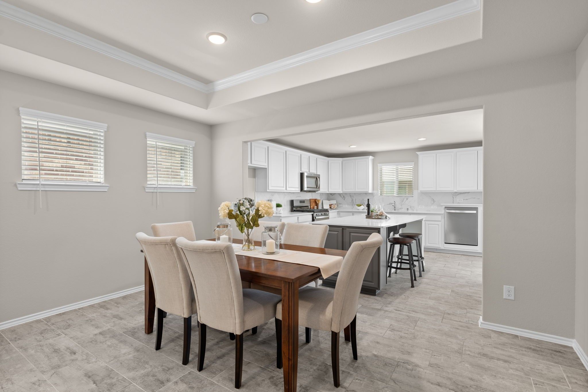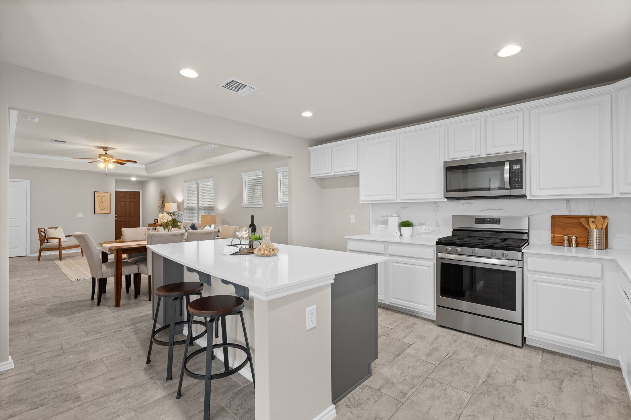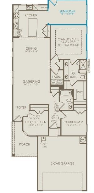 Upgrades Galore! 3BR/2BA + Sunroom in vibrant 55+ Del Webb! Home shines w/structural upgrades including 4-ft garage extension, 3rd BR tray ceiling, & sunroom. Upgraded brick-and-stone exterior enhances curb appeal & sets the tone for what’s inside. Step through entryway into gathering room accented by tray ceiling w/crown molding. Open layout flows seamlessly into dining area & chef’s kitchen. Upgraded kitchen is a culinary dream featuring crisp white cabinetry w/pull-outs, spacious island, granite countertops, and SS appliances. Wood-look tile floors throughout (no carpet!) create a warm, elegant, and durable design. Retreat to the owner’s suite with tiled walk-in shower & bench, dual sinks, and generous walk-in closet. A versatile 3rd bedroom can serve as a guest room or study. Relax in the bright sunroom or on the extended patio with a cool glass of lemonade. Bonus: 4-ft garage extension, full sprinklers, gutters, and stylish finishes complete this thoughtfully upgraded