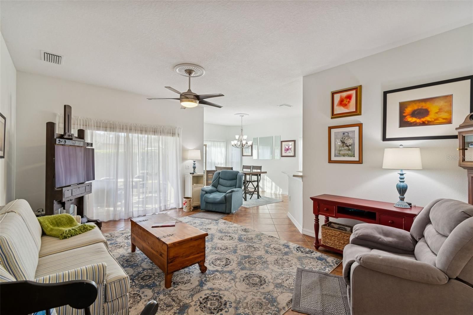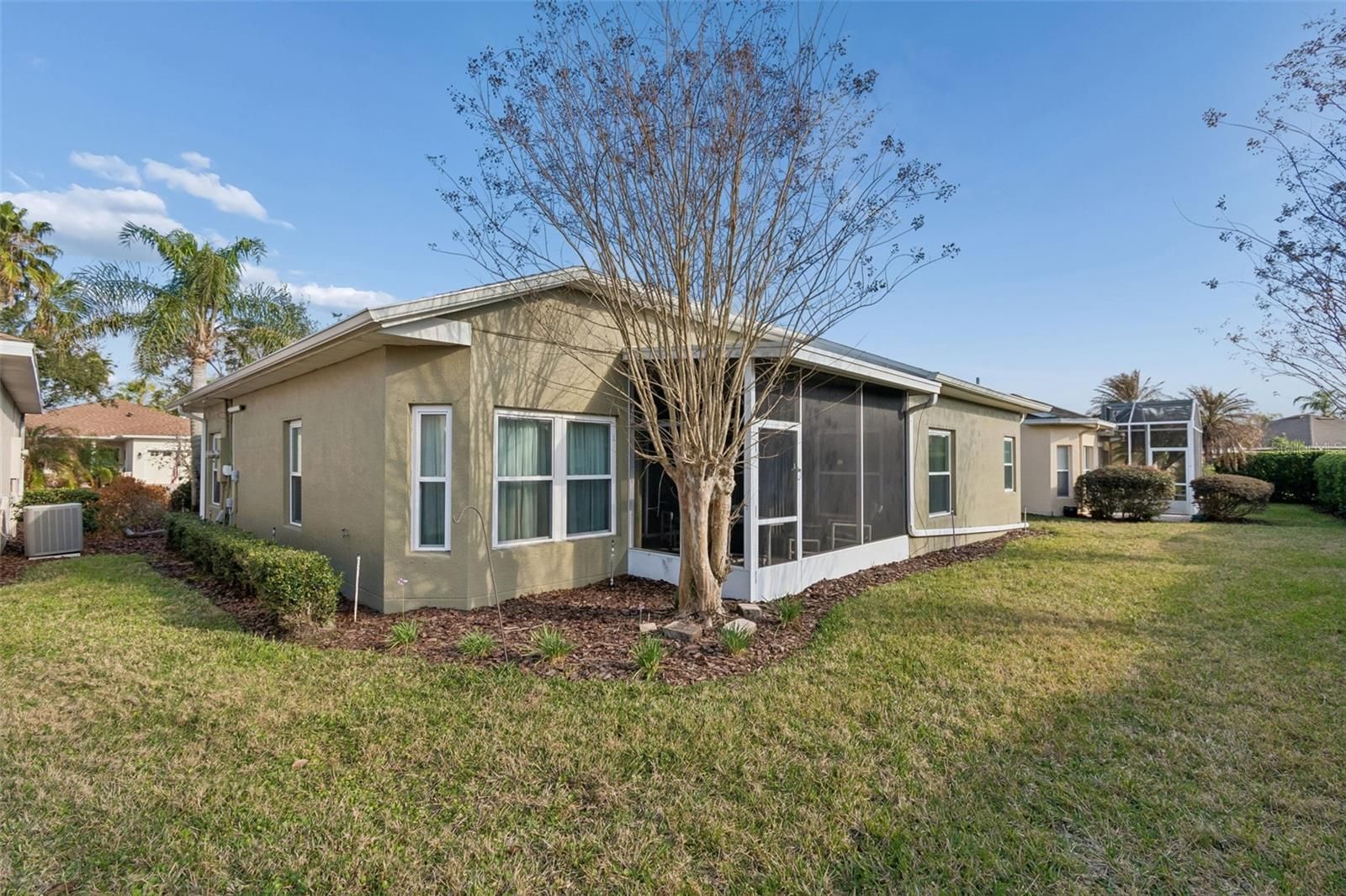Beautifully maintained Harmony Model offering 2 bedrooms, 2 bathrooms, plus a dining room and den/study, ideally located just moments from the Village Center amenities. This inviting home welcomes you with a screened front porch and elegant leaded glass entry door, setting the tone for the quality and comfort found throughout. Step inside to a bright, open living area featuring diagonal ceramic tile throughout the entire home—NO carpet anywhere—for a clean, modern look and easy maintenance. The living room is enhanced with a ceiling fan and sliding glass doors that open to the screened lanai, creating a seamless indoor-outdoor flow that’s perfect for relaxing or entertaining. The completely remodeled kitchen (2023) is a standout, boasting a stylish tile backsplash, abundant cabinetry, generous counter space, and a cozy breakfast nook—ideal for casual dining or morning coffee. A formal dining room provides additional space for hosting family and friends. The primary suite is a true retreat, featuring a comfortable sitting area, private sliders to the lanai, a large walk-in closet, and an en-suite bathroom with dual vanities, a garden tub, and a walk-in shower with built-in seat. The guest bedroom and guest bathroom are thoughtfully positioned on the opposite side of the home, offering privacy for visitors. A versatile den/study includes a built-in desk and shelving, along with a Murphy bed, making it perfect as a home office, hobby room, or additional guest space. Step outside to the screened lanai and enjoy peaceful outdoor living, with a backyard large enough to add a fence—ideal for furry family members. Additional highlights include a 2-car garage with ample storage and a dedicated plug for an electric golf cart (golf cart available for purchase). Major updates provide peace of mind, including Roof (2017), HVAC (2023), Water Heater (2024), and a new refrigerator. This move-in-ready home combines thoughtful upgrades, flexible living spaces, and a prime location close to amenities—perfect for enjoying an active and relaxed lifestyle. Solivita is a premier 55+ community, offering residents an exceptional lifestyle with state-of-the-art amenities. Enjoy a fully equipped fitness center, dance and aerobics studios, and an impressive array of recreational options including 14 heated swimming pools, two heated spas, tennis courts, pickleball courts, shuffleboard, bocce ball, billiards, and an art gallery. The community also features three on-site restaurants and two championship 18-hole golf courses. With a full calendar of activities and events, there’s always something new to explore and enjoy. This home is conveniently located near a hospital and medical office complex, and shopping center. See the Floor Plan and the Shopping Center Map under Public Attachments.