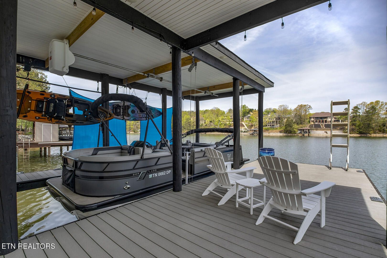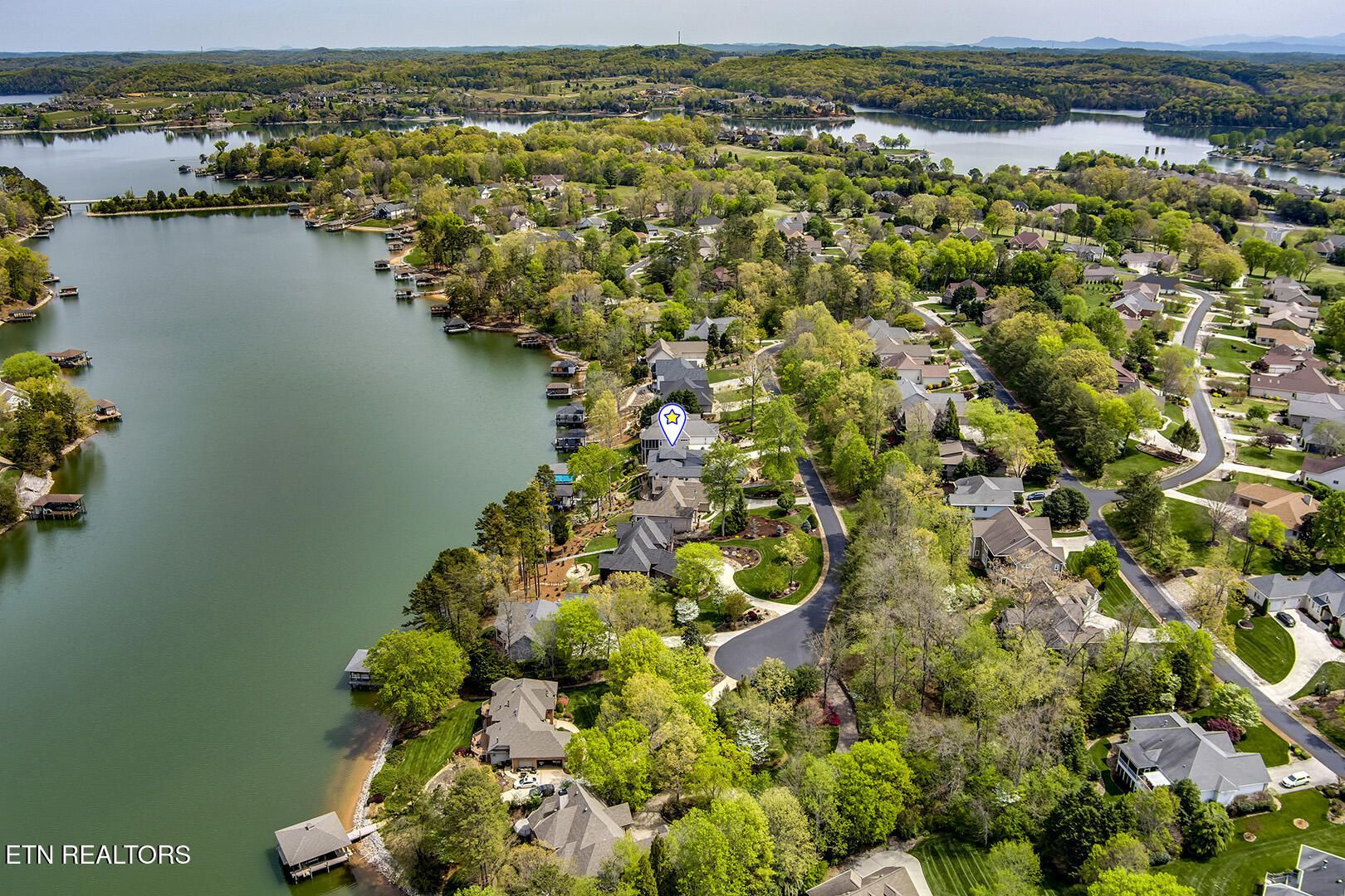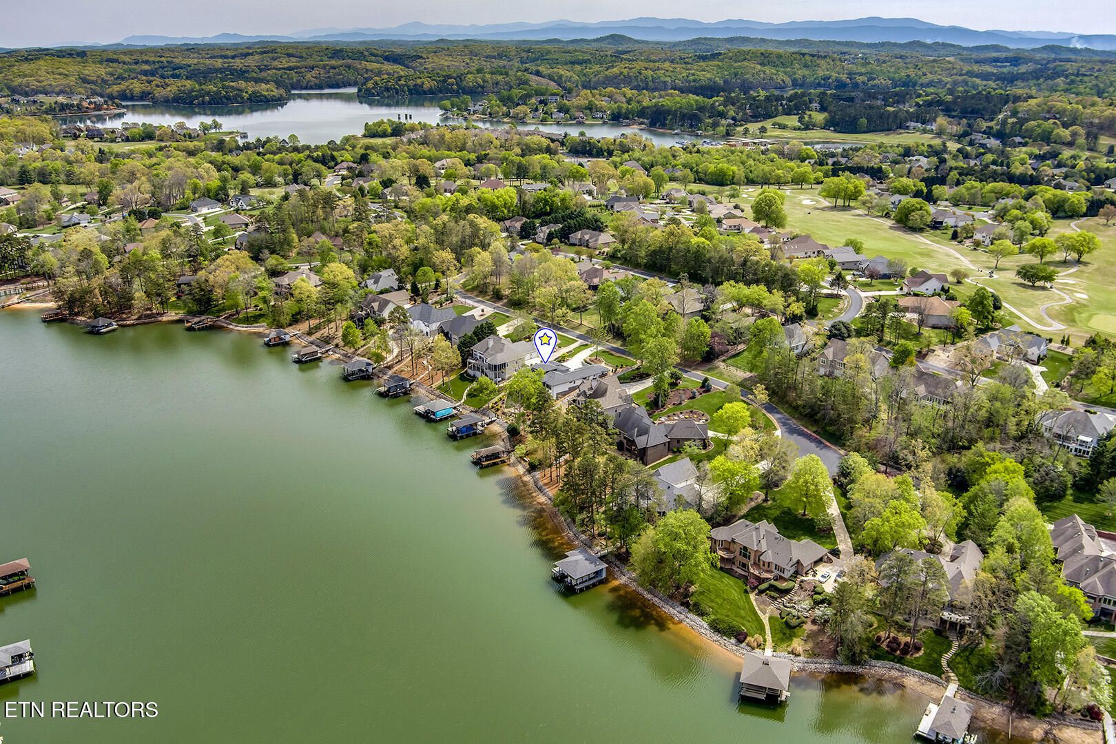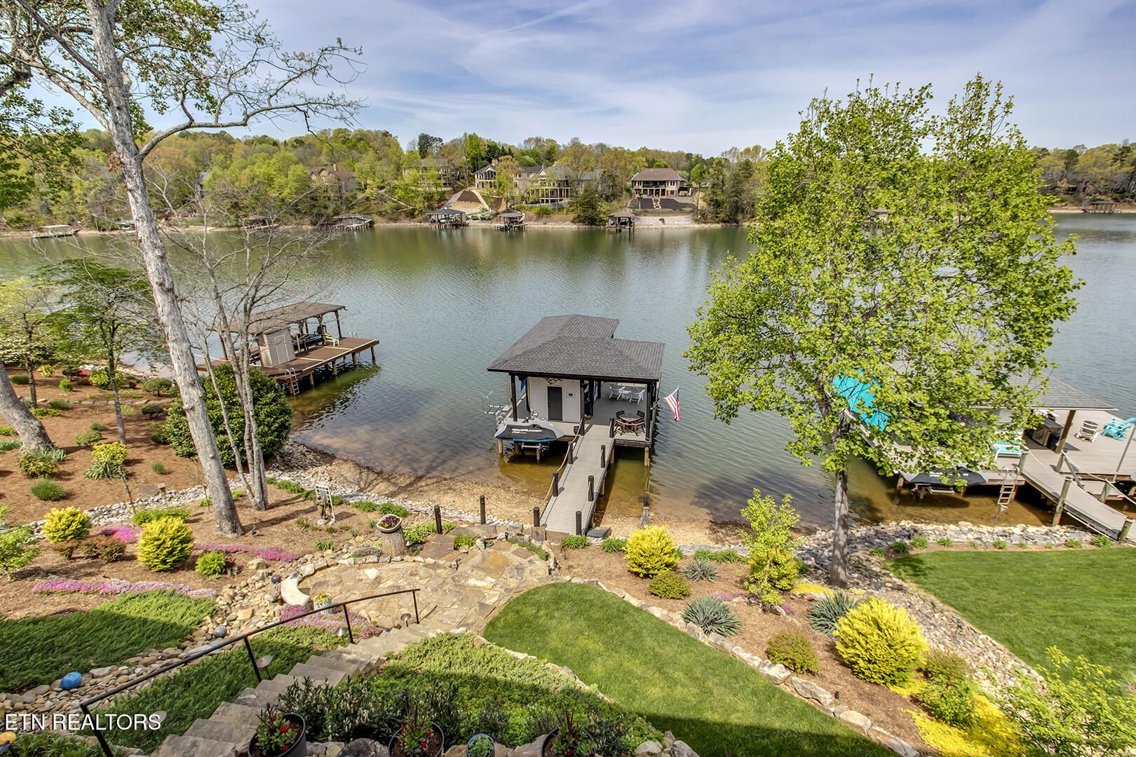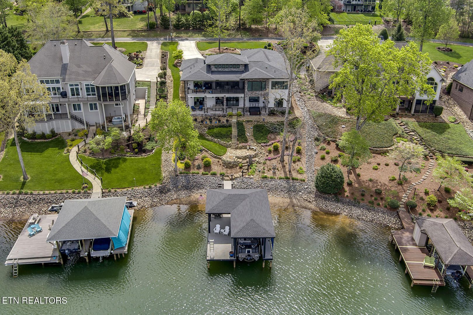 Lakefront Luxury Estate in Tellico Village. Experience the Pinnacle of Lakefront Living in this 2022 Parade of Homes masterpiece, ideally located to showcase breathtaking views of the tranquil Ski Cove in the Tommotley Neighborhood at the sought-after north end of the Village. With over 4,600 square feet of elegant design, this estate brings together expansive entertaining areas and the convenience of main-level zero-threshold living along with elevator access to the walkout lower level. You have Sophisticated Interiors and Main-Level Retreats. Step into an inviting open-concept sanctuary, highlighted by a stunning gas linear fireplace and expansive floor-to-ceiling windows. The main floor is thoughtfully designed with two lavish primary suites and a professional office featuring partner built-in desks. The premier master retreat provides a spa-like ambiance with a custom walk-in shower, heated flooring, and a heated towel rack. The secondary master suite offers a beautiful built-in steam shower. Every bedroom is equipped with a private ensuite bathroom, each finished with high-end tile, fixtures, and hardware. You have Exceptional Kitchens and Entertaining Spaces. The chef's kitchen stands out with its spacious layout, incorporating premium Monogram appliances, a generous walk-in butler's pantry, and ample storage. The lower level is designed for entertaining, featuring a second full kitchen and bar with a distinctive flip-out window for effortless indoor-outdoor service. The home is wired for sound and includes a central vacuum system and geothermal heating and cooling, ensuring a comfortable, low-maintenance environment suitable for any gathering. Outdoor Amenities and Lake Access. Outdoors, professionally landscaped and lighted grounds guide you to a first-class private dock. Designed for the ultimate lake lifestyle, the dock is equipped with a slip and lift for a 23-ft boat, dedicated jet ski and kayak lifts, and more. The oversized garage is meticulously organized with built-in cabinets and a spacious utility sink. This home was Crafted for Excellence. From designer finishes to deep-water access, every aspect of this Tellico Village estate is designed for those who seek the very best in life.