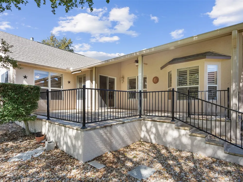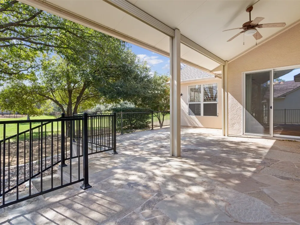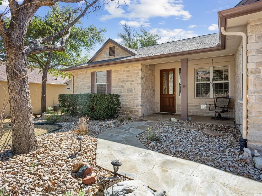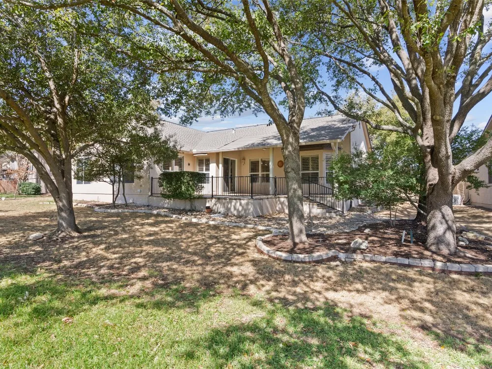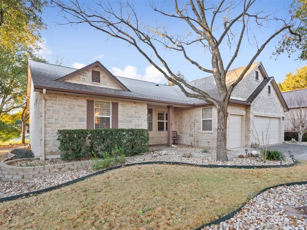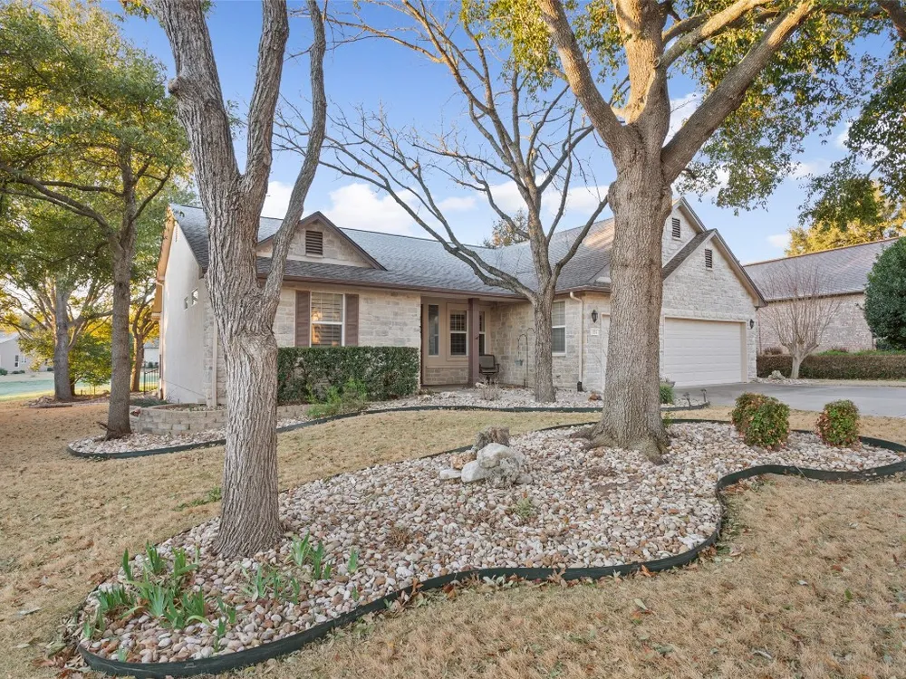 Prime Location! This beautifully updated Del Webb Salado floor plan is ideally located near Sun City amenities and key spots like Williams Drive, Scott & White Clinic, Walgreens, and more. Set on a spacious lot with fantastic curb appeal, the home is surrounded by mature trees and landscaping, and offers coveted privacy with no neighbors directly behind, thanks to the peaceful green space. As you approach the home, a stone walkway leads to a charming porch, welcoming you into a space filled with warmth and elegance. The large windows bathe the home in natural light, offering soothing views of the extended patio and expansive green space beyond. The living room boasts a custom built-in feature, perfect for showcasing your television and special decor or collectibles. The the gourmet kitchen, updated with granite countertops, stainless steel appliances, a removable island with wainscoting, cabinet pull-outs, and a stylish stone backsplash, opens up to the cozy hearth room complete with a fireplace - ideal for those chilly winter nights. In the primary bathroom, you'll find dual vanities with quartz countertops, additional storage, and a beautifully tiled glamour shower. The traditional floor plan is adorned with acacia wood floors or tile throughout, with carpet in all the bedrooms, and plantation shutters, making this the perfect home for elegant living both indoors and out. The third garage stall is the perfect spot for the golf cart or work shop.