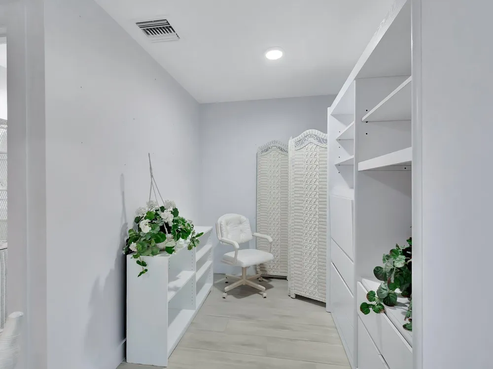 - Built-in Shelving, Cathedral Ceiling(s), Entry Level Living Area, Entrance Foyer, Kitchen Island, Pantry, Pull Down Attic Stairs, Skylights, Split Bedrooms, Walk-In Closet(s), Home Office, Family Room, Storage, Family/Dining Room, Eat-in Kitchen, Separate/Formal Dining Room, Impact Glass, Separate Shower