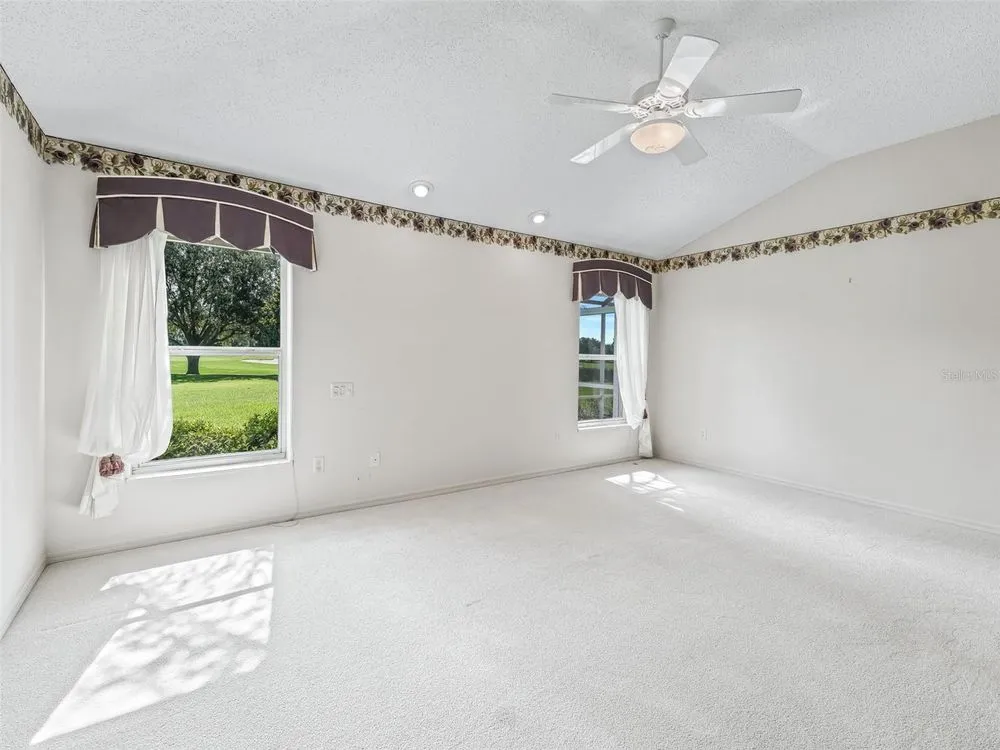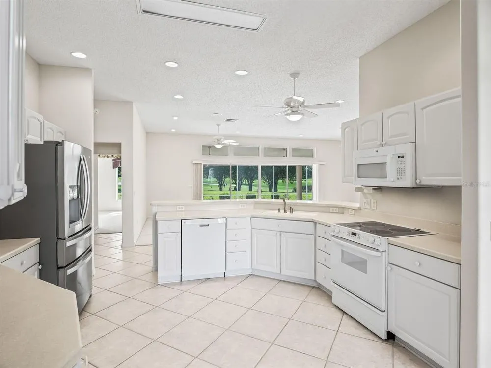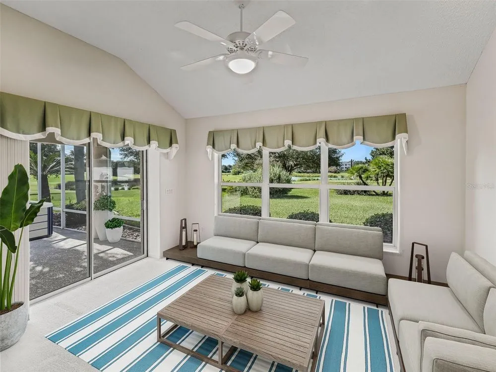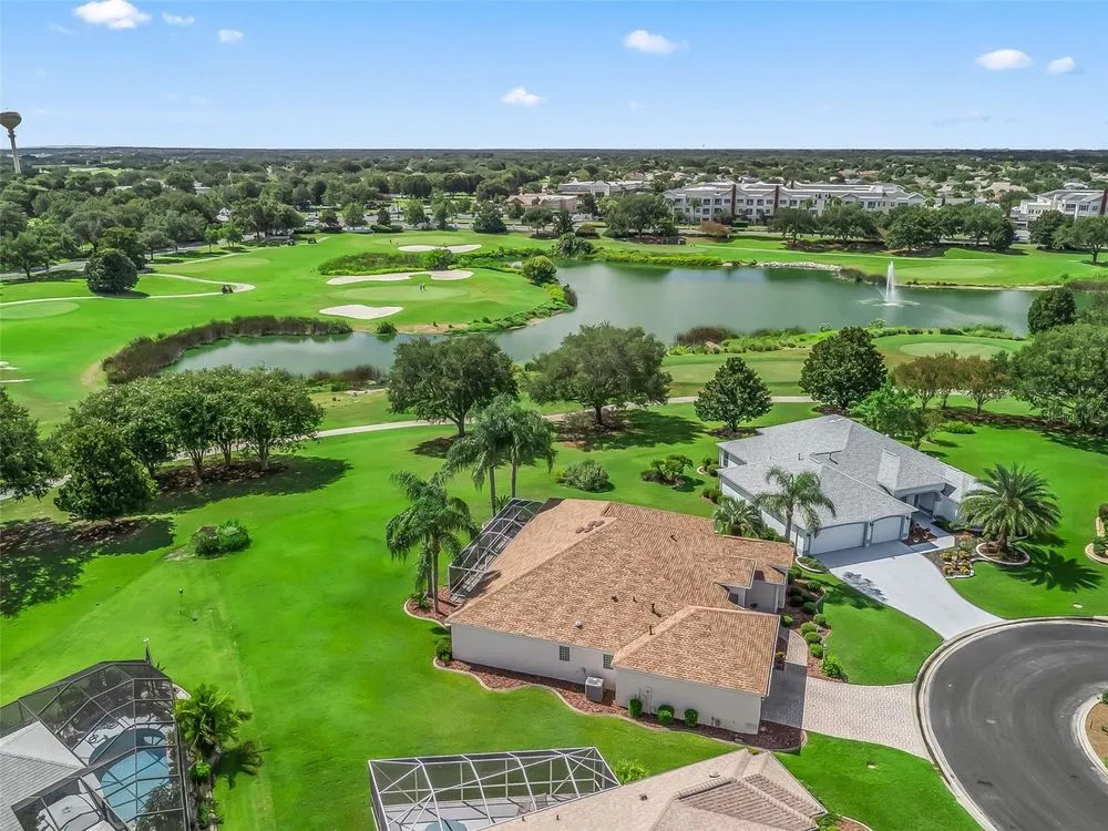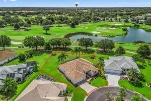 One or more photo(s) has been virtually staged. CUSTOM Magnolia Model with PANORAMIC GOLF & WATER VIEWS – AND PRIVACY! Must See! NO BOND! A designer home customized with PREMIER features with ROOM FOR A POOL! Welcome to this stunning home nestled on an oversized lot at the end of a quiet CUL-DE-SAC. Enjoy breathtaking views of the golf course and water from every room in the rear of the home—all while being less than a minute from shopping, dining, and essential amenities. Curb appeal abounds with a PAVER STONE drive/walkway and lush TROPICAL landscaping. Step inside to discover a thoughtfully designed open-concept layout featuring 12’ ceilings, BULLNOSE corners, and TRANSOM windows above QUAD sliding glass doors (retractable), flooding the living space with natural light. This unique home includes a SOUNDPROOF MEDIA ROOM with ELEVATED flooring, a split-bedroom floor plan with FLEXIBLE 3rd bedroom/office PLUS a sunroom/den with separate access to the lanai. A 2024 roof with a GOLD PLAN 25/50 Year Warranty provides peace of mind! The 3-zoned AC system, SOLAR tubes, and AIR FILTRATION SYSTEM allow sunlight and clean fresh air throughout. The chef’s kitchen features an EAT-IN area, large breakfast BAR with judges paneling, CORIAN countertops, abundant cabinetry with pull-out shelves, a Whirlpool French door refrigerator, GE Profile range & microwave, Kenmore dishwasher, and seamless sink. The primary en-suite is a private retreat with HIS & HER WALK-IN closets, DUAL sinks, makeup area, WALK-IN shower, and an oversized linen closet. Guests and family will enjoy generously sized bedrooms and a full bath with a shower/tub combo. The spacious and extended lanai features a large screened birdcage with a covered seating area—perfect for entertaining or relaxing while enjoying serene views. ADDITIONAL HIGHLIGHTS - New 2024 Rheem Water Heater, EXPANDED 2-Car Garage with BUILT-IN Workbench Areas, Recessed Lighting and Slider Light Switches, Large Hall Closet, and a Beautiful Mix of Diagonal Tile and Newer Carpet. This home truly combines luxury, comfort, and functionality in a premium location. Ask for the detailed feature sheet and schedule your private tour today—this one won’t last! Convenient and less than a minute from Highway 466 where all shopping, banking, and amenities are located!
