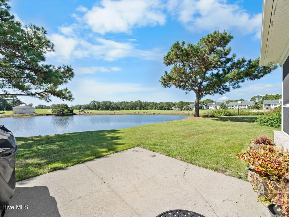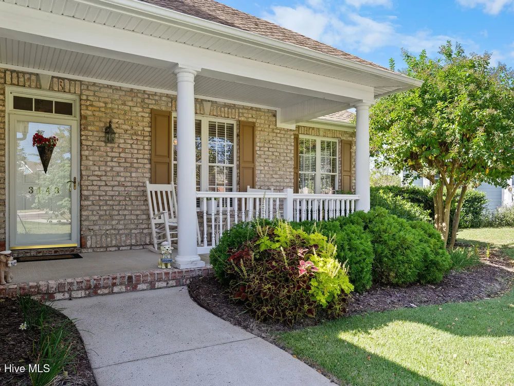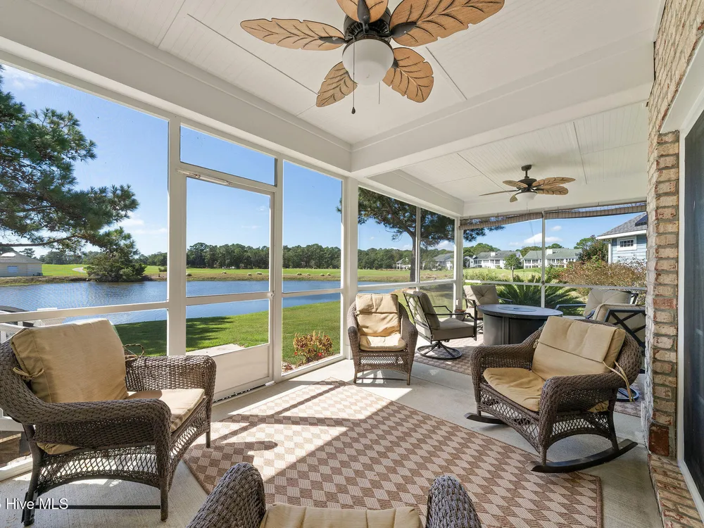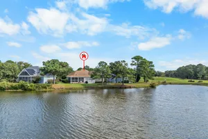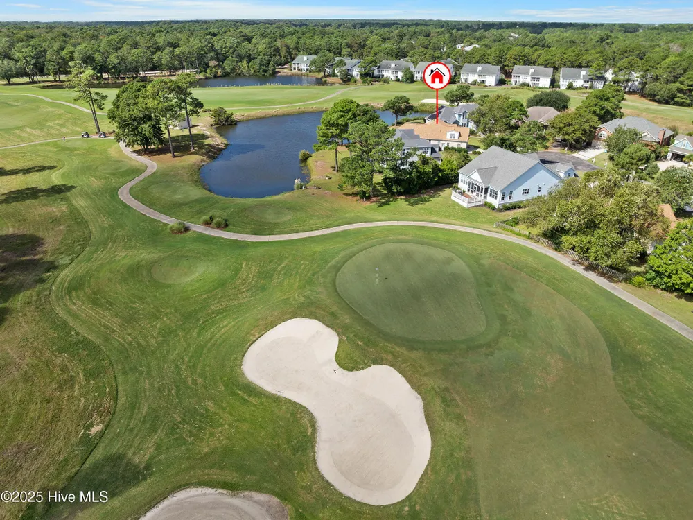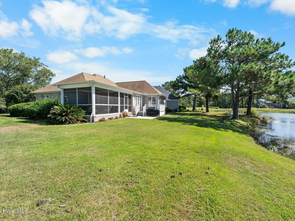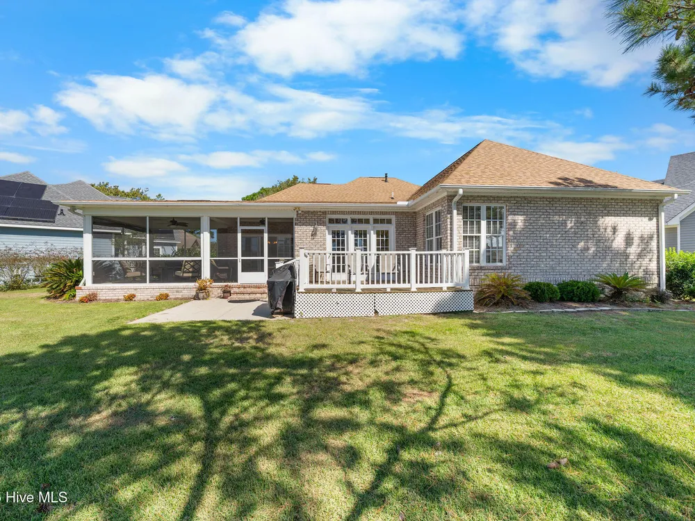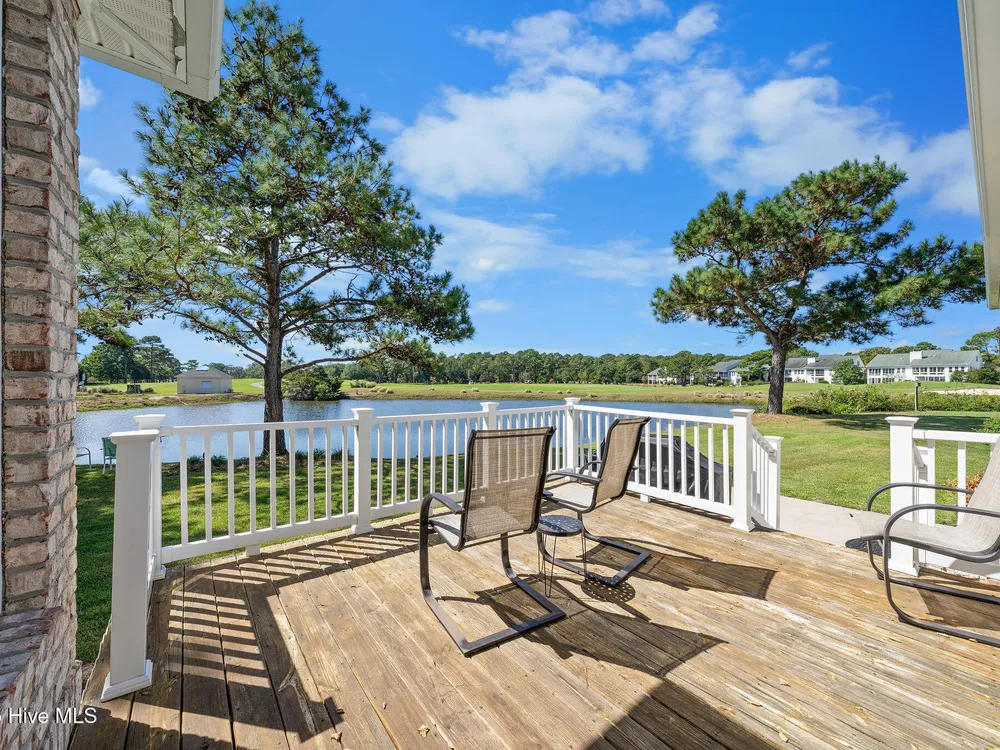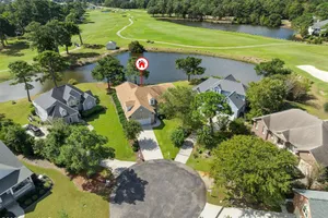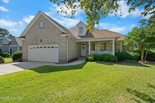 This classic all-brick home is located at the end of a private cul-de-sac enjoying expansive pond views and fairway views of the golf holes 1 and 9 of the Founders course in St. James Plantation. This 2600 heated square foot residence experiences the ultimate southern rear exposure and features 3 spacious bedrooms, study, bonus room, and three full bathrooms, offering a perfect blend of formal and casual spaces for entertaining and relaxing. The home is surrounded by neat, low-maintenance landscaping, adding to its charm and curb appeal. The Founders Club just a short distance away, offering an outdoor pool, tennis courts, golf practice areas, and beautiful clubhouse overlooking the marsh savannah of Beaver Creek. Follow the brick steps onto the rocking chair front porch and step through the front door framed by sidelights into a welcoming foyer. You'll find custom millwork wainscoting and durable engineered hardwood floors. Just off the foyer is a formal dining room which is the perfect area for larger friend/family gatherings. The great room features a gas fireplace with a mantle, custom built-in cabinets and shelving to the right. The great room is connected to the sunroom overlooking breathtaking views which opens to the deck. From the screened in porch experience panoramic pond views with the lush golf course beyond. Enjoy the mild Carolina weather and picturesque views from either the deck or concrete patio. The kitchen offers wood cabinetry, a center island, stainless steel appliances, a built-in desk, and a light-filled breakfast nook. Here, a 3 panel sliding glass door offers views of the pond, making it the perfect place to enjoy your morning coffee or casual meals. Just beyond the kitchen privately tucked away is a study/den. The owner's suite provides plenty of room and is flooded by natural light and pond/golf views. Double doors lead to an ensuite bathroom, complete with a dual sink vanity, make-up station, a walk-in shower, and large soaking tub. The