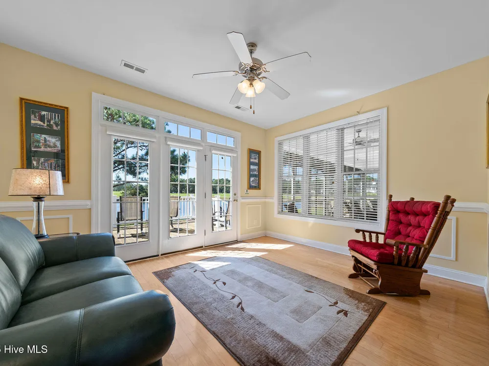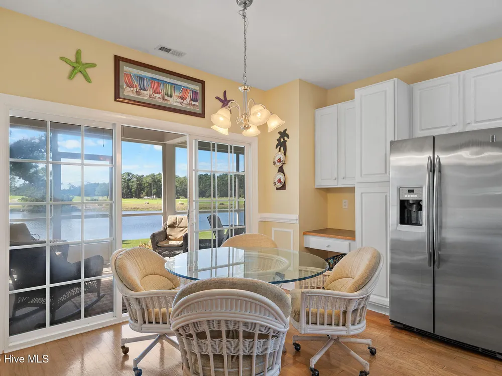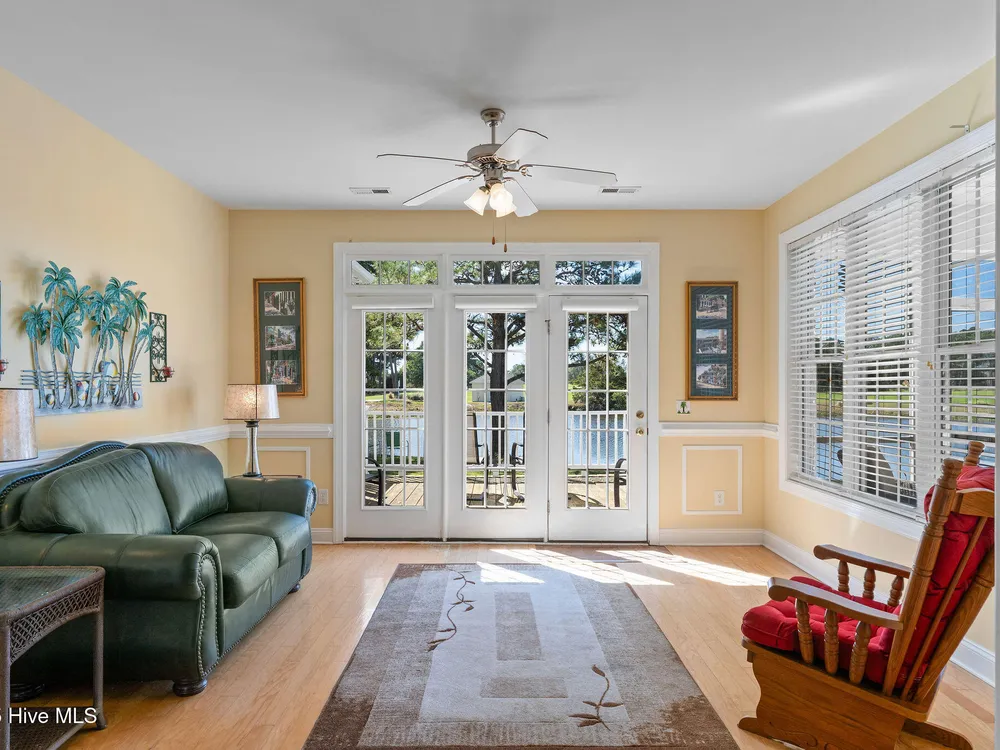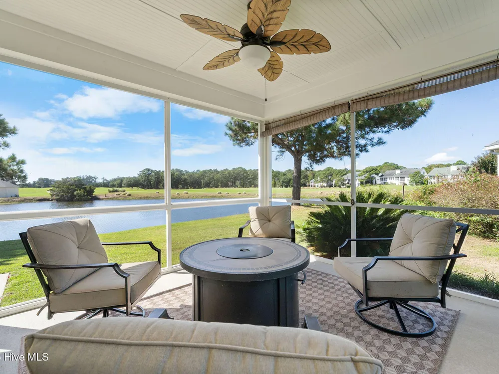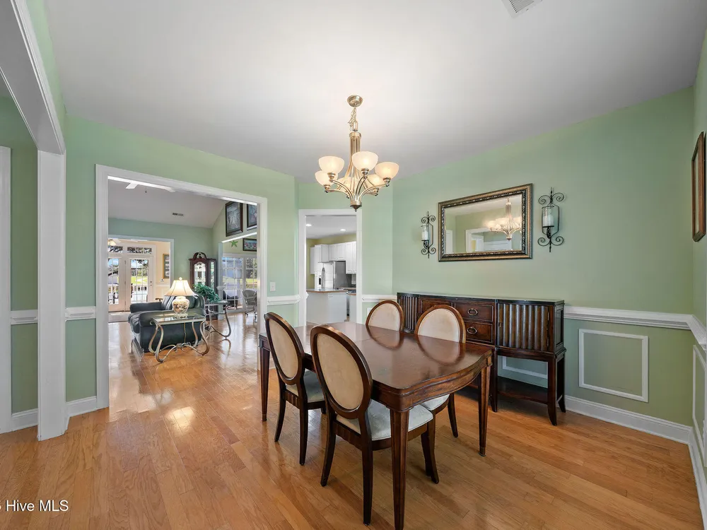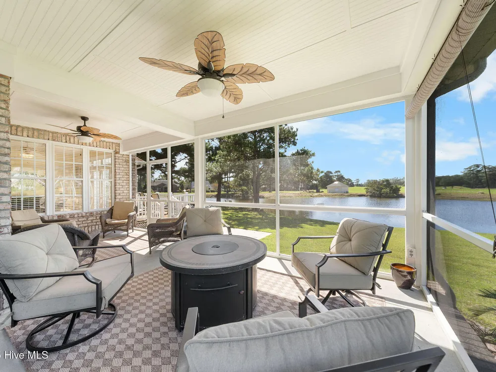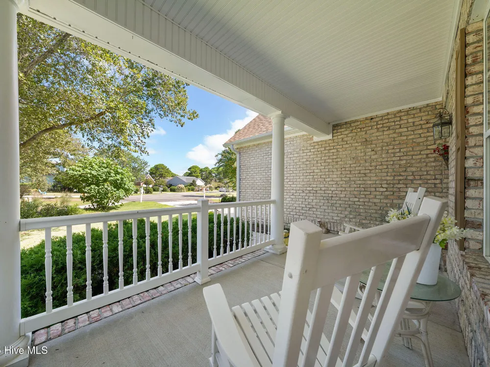 This classic all-brick home is located at the end of a private cul-de-sac enjoying expansive pond views and fairway views of the golf holes 1 and 9 of the Founders course in St. James Plantation. This 2600 heated square foot residence experiences the ultimate southern rear exposure and features 3 spacious bedrooms, study, bonus room, and three full bathrooms, offering a perfect blend of formal and casual spaces for entertaining and relaxing. The home is surrounded by neat, low-maintenance landscaping, adding to its charm and curb appeal. The Founders Club just a short distance away, offering an outdoor pool, tennis courts, golf practice areas, and beautiful clubhouse overlooking the marsh savannah of Beaver Creek. Follow the brick steps onto the rocking chair front porch and step through the front door framed by sidelights into a welcoming foyer. You'll find custom millwork wainscoting and durable engineered hardwood floors. Just off the foyer is a formal dining room which is the perfect area for larger friend/family gatherings. The great room features a gas fireplace with a mantle, custom built-in cabinets and shelving to the right. The great room is connected to the sunroom overlooking breathtaking views which opens to the deck. From the screened in porch experience panoramic pond views with the lush golf course beyond. Enjoy the mild Carolina weather and picturesque views from either the deck or concrete patio. The kitchen offers wood cabinetry, a center island, stainless steel appliances, a built-in desk, and a light-filled breakfast nook. Here, a 3 panel sliding glass door offers views of the pond, making it the perfect place to enjoy your morning coffee or casual meals. Just beyond the kitchen privately tucked away is a study/den. The owner's suite provides plenty of room and is flooded by natural light and pond/golf views. Double doors lead to an ensuite bathroom, complete with a dual sink vanity, make-up station, a walk-in shower, and large soaking tub. The