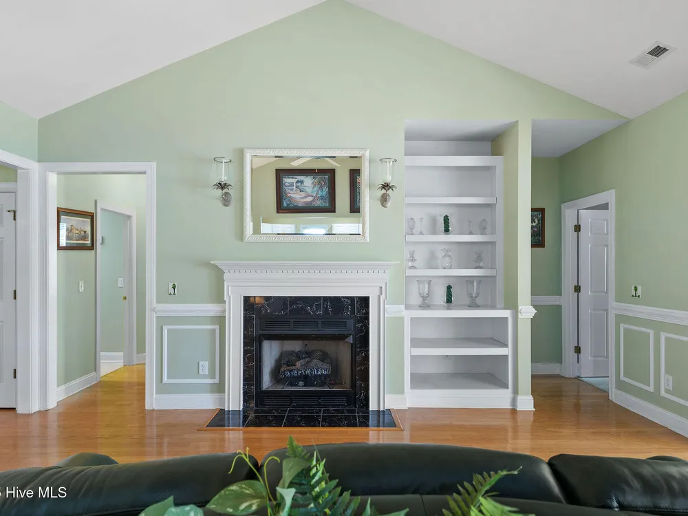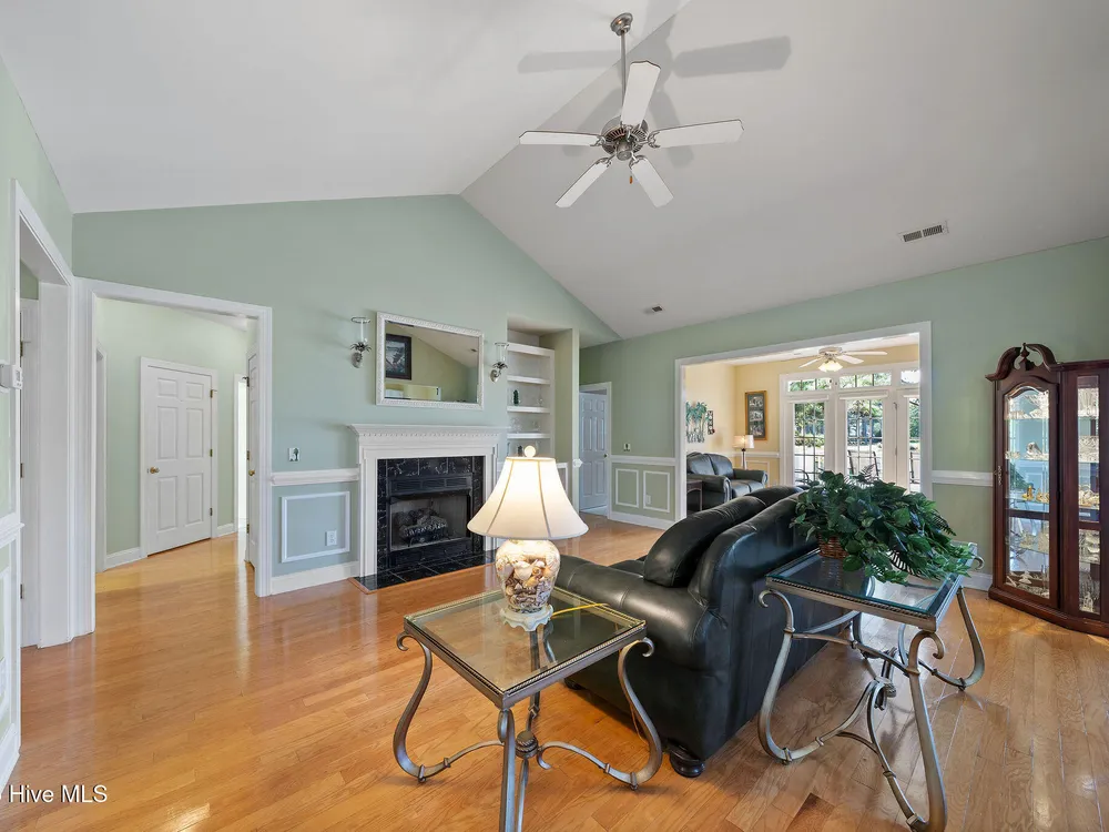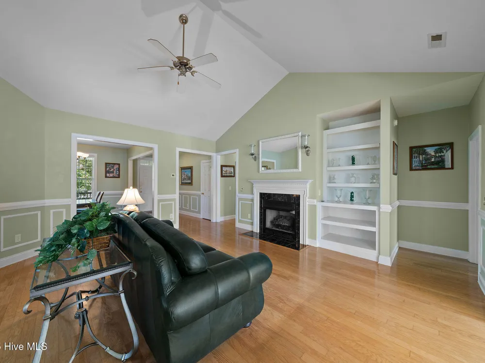 - Blinds/Shades, Walk-in Shower, Walk-In Closet(s), High Ceilings, Kitchen Island, Ceiling Fan(s), Bookcases