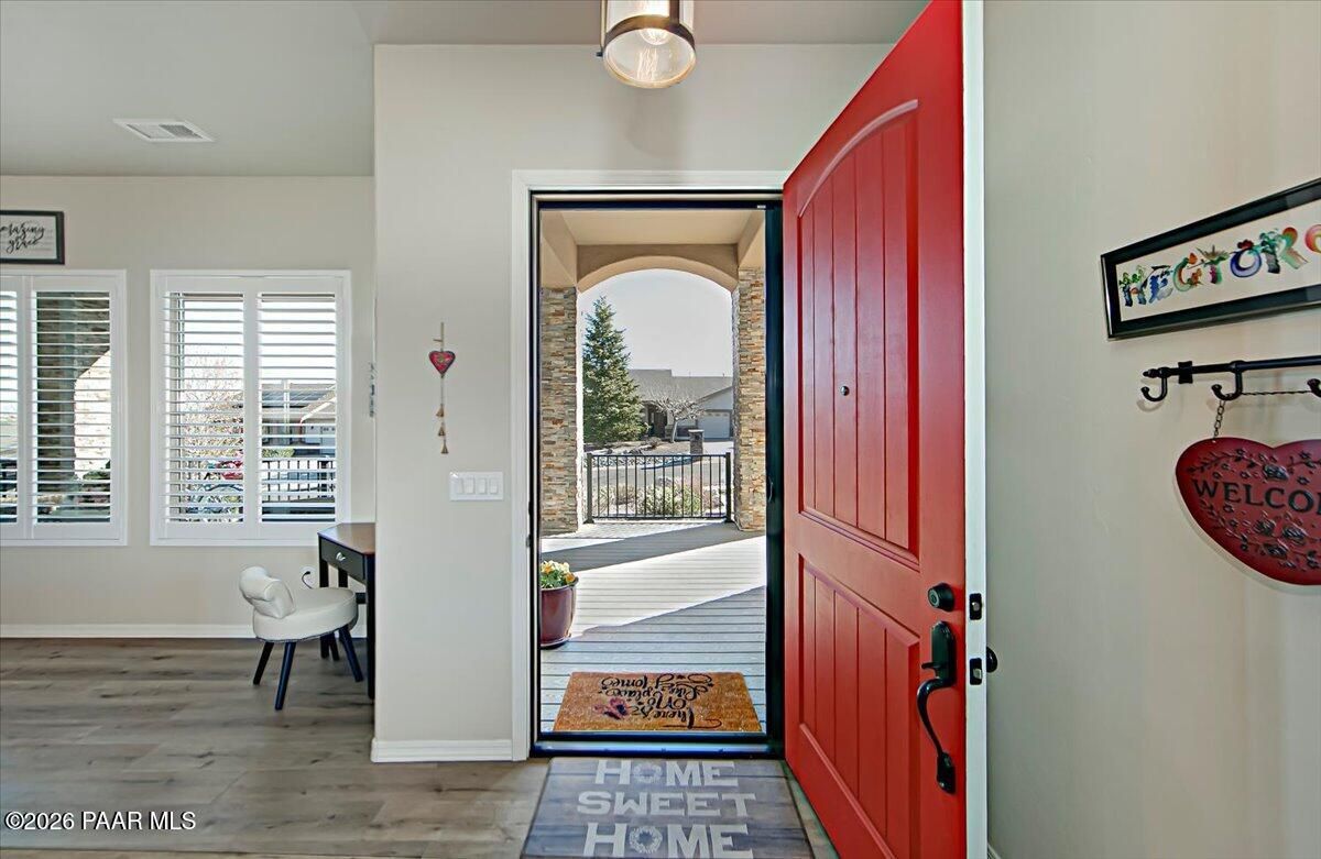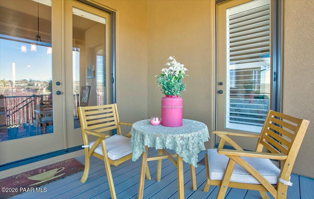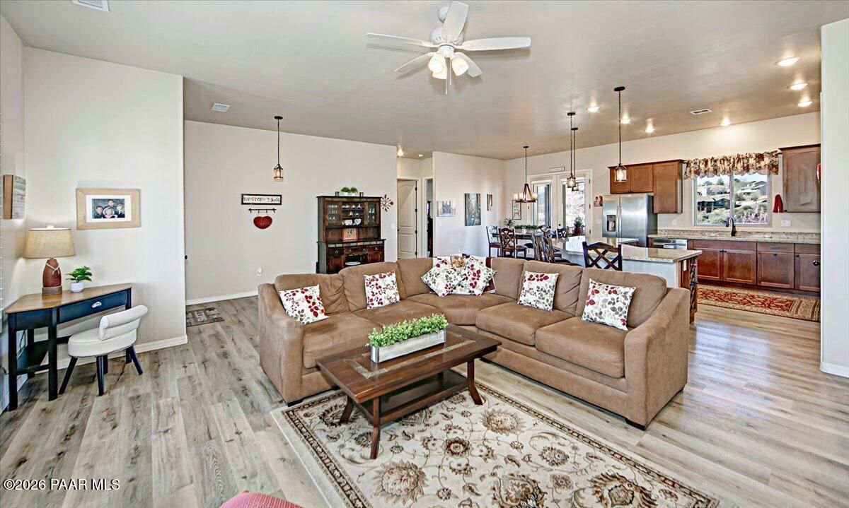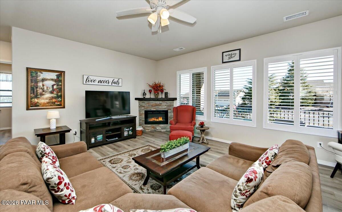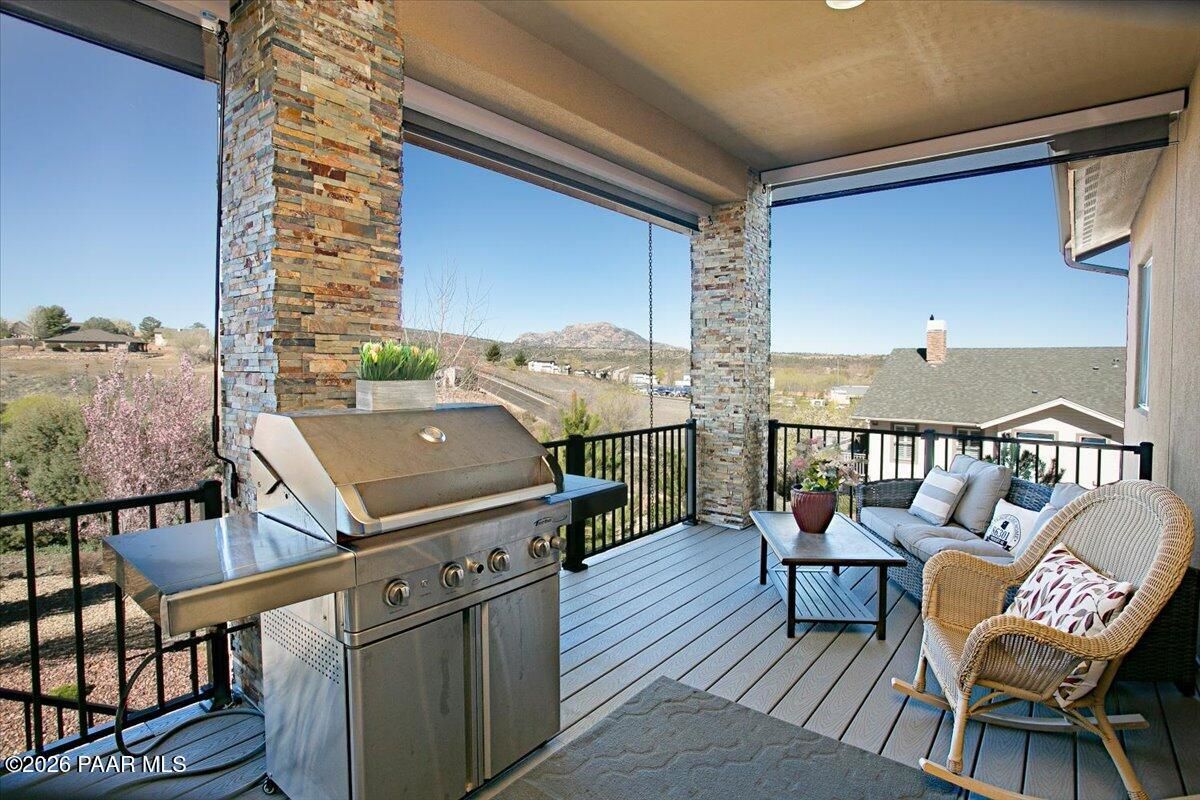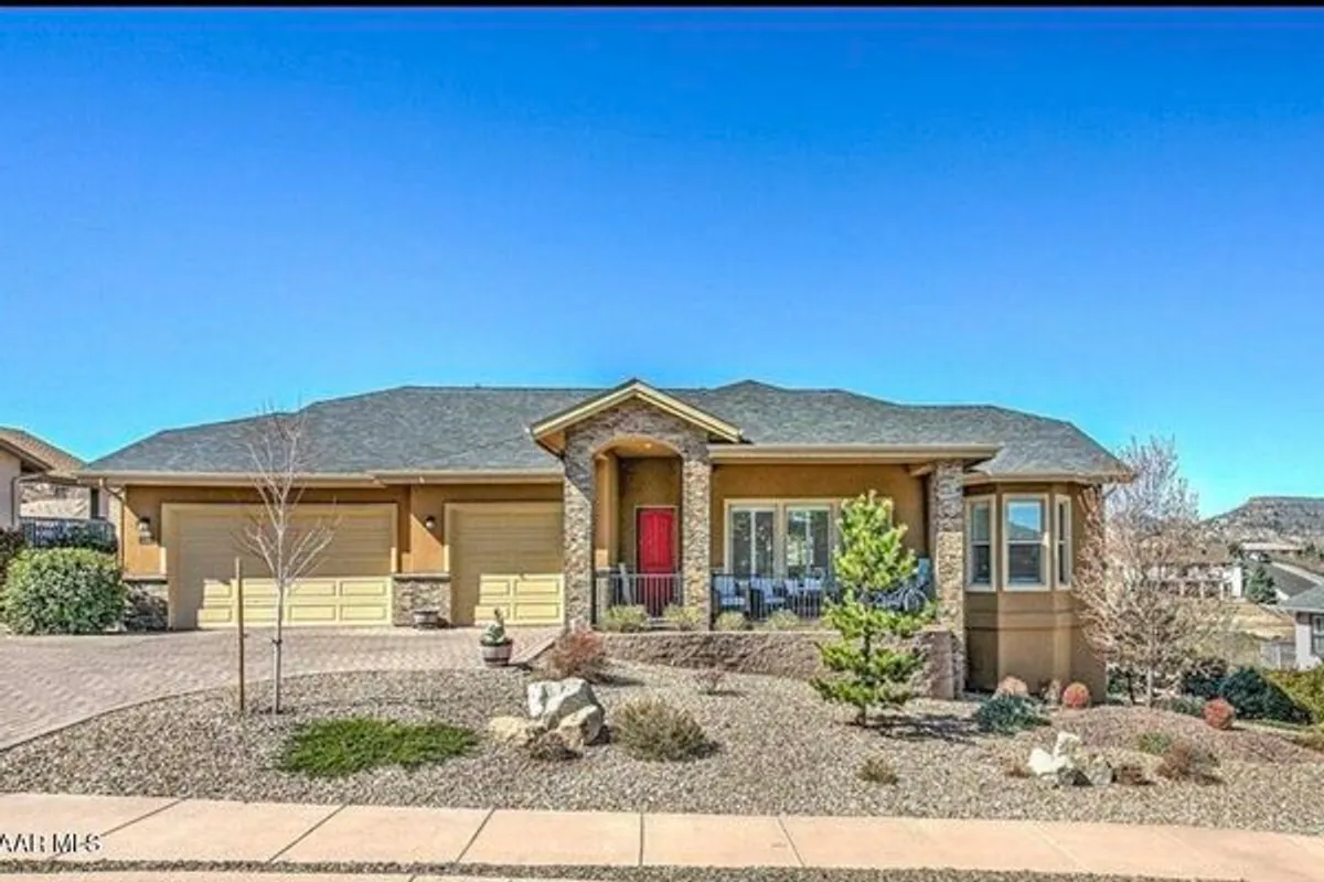 If you have always wanted the perfect Prescott Lakes home with a view of Granite Mountain, your wait is over. This single level, open floor plan home delights inside and out. A spacious front porch deck welcomes you in and the great room provides a comfy setting for family and friends with a fireplace, warm toned laminate flooring, and impressive ceiling height design. Kitchen island invites plenty of seating and allows the ''chef'' to be part of the action with efficient granite counter workspace. Easy access in the dining area to the back deck to enjoy al fresco dining and that stunning Granite Mountain view. Primary bedroom is spacious with a walk-in closet and french door access to the deck. Ensuite has dual vanity sinks and a walk-in shower. Split design provides privacy for guests with two bedrooms and hall bathroom.Beautiful, mature landscaping and backyard space for gardening provide a year around nature setting. Plenty of storage in the crawl space. Prescott Lakes Club is thriving with pickleball, tennis, an outdoor pool, plus workout, club dining and so much more.