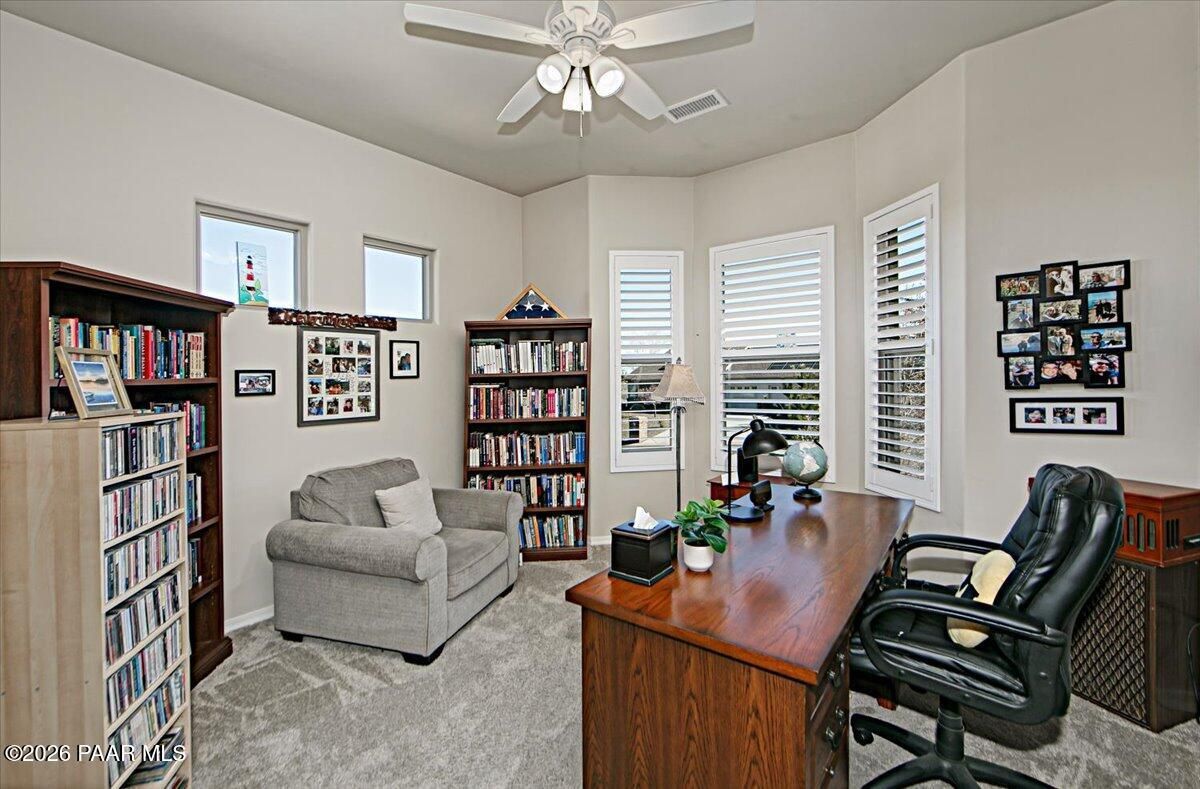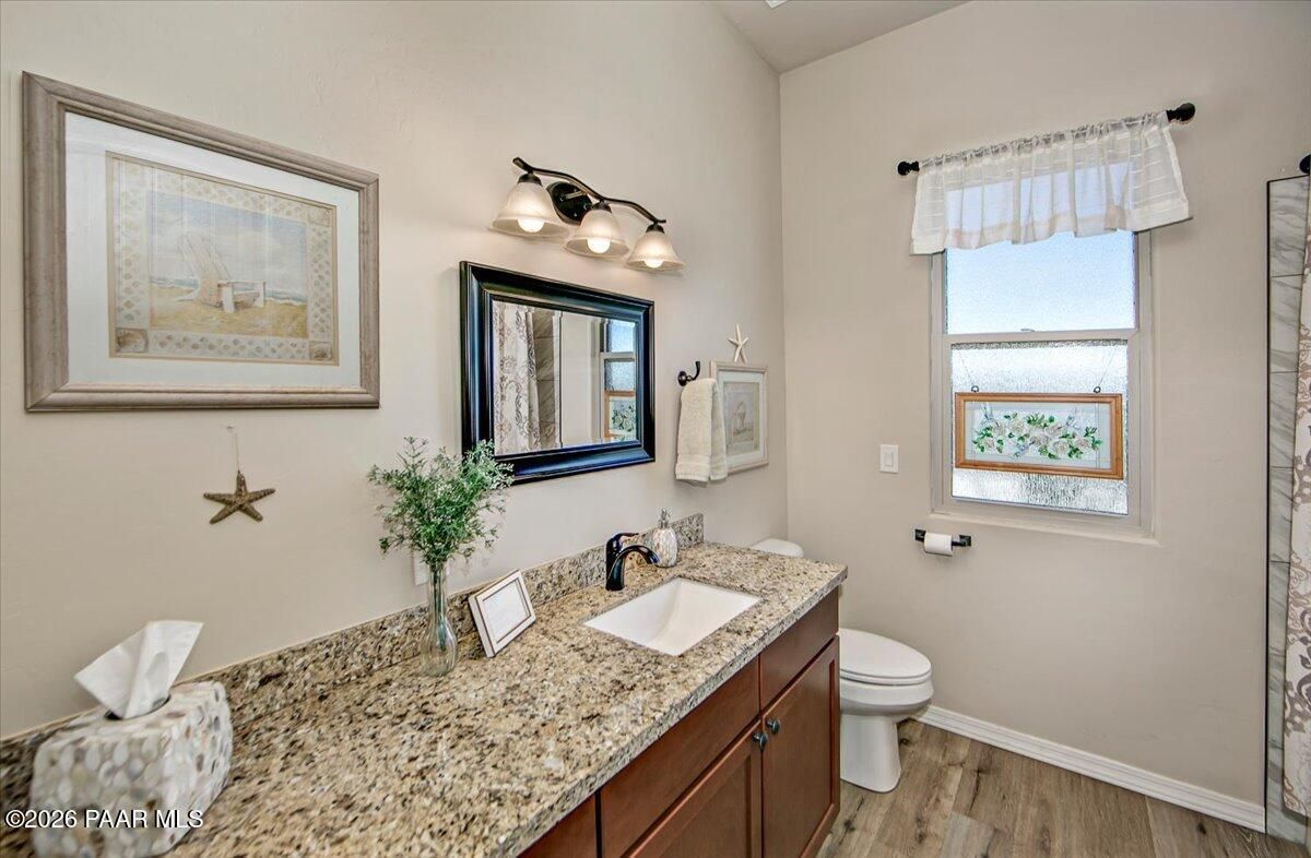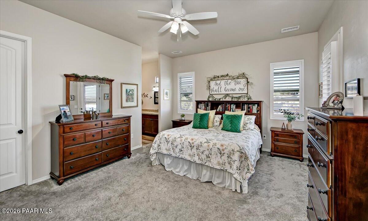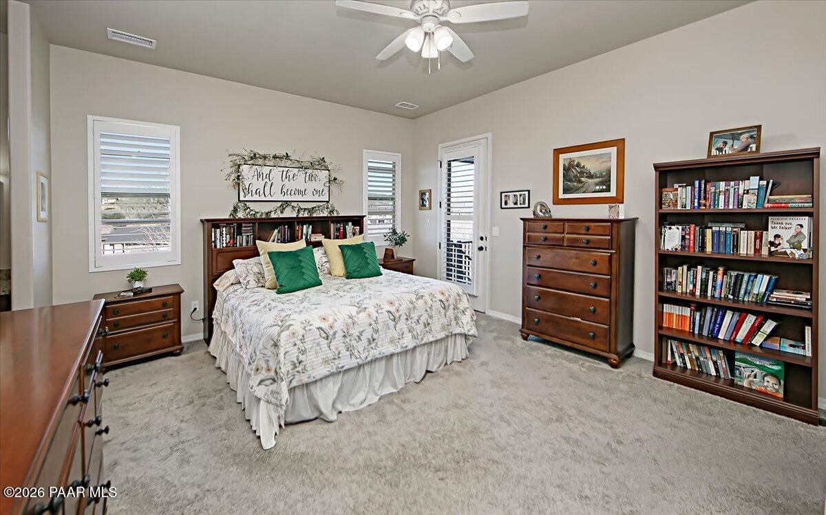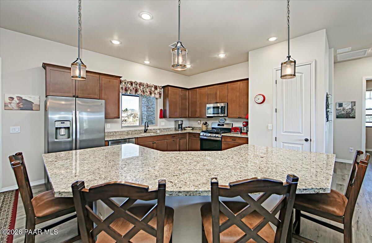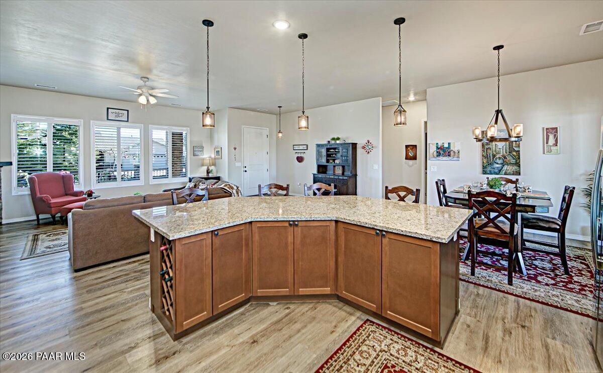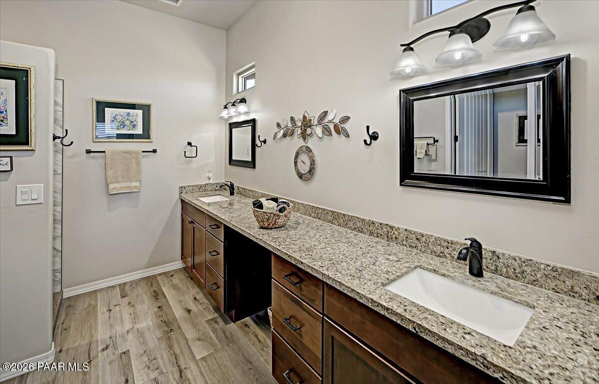 If you have always wanted the perfect Prescott Lakes home with a view of Granite Mountain, your wait is over. This single level, open floor plan home delights inside and out. A spacious front porch deck welcomes you in and the great room provides a comfy setting for family and friends with a fireplace, warm toned laminate flooring, and impressive ceiling height design. Kitchen island invites plenty of seating and allows the ''chef'' to be part of the action with efficient granite counter workspace. Easy access in the dining area to the back deck to enjoy al fresco dining and that stunning Granite Mountain view. Primary bedroom is spacious with a walk-in closet and french door access to the deck. Ensuite has dual vanity sinks and a walk-in shower. Split design provides privacy for guests with two bedrooms and hall bathroom.Beautiful, mature landscaping and backyard space for gardening provide a year around nature setting. Plenty of storage in the crawl space. Prescott Lakes Club is thriving with pickleball, tennis, an outdoor pool, plus workout, club dining and so much more.