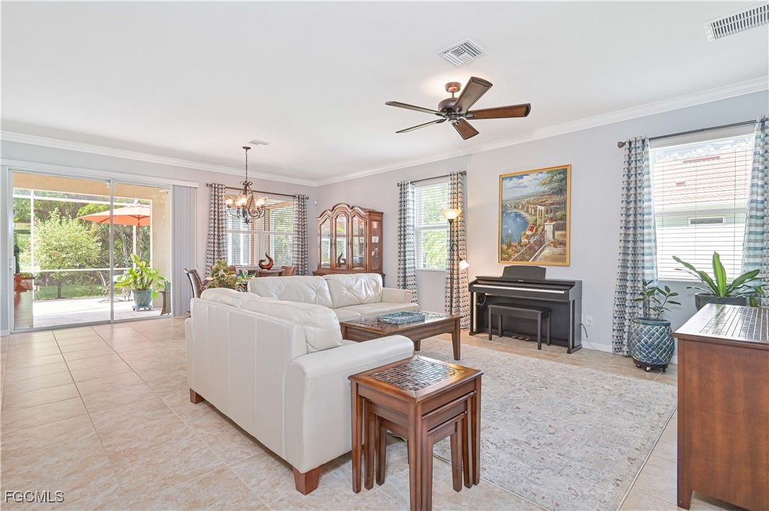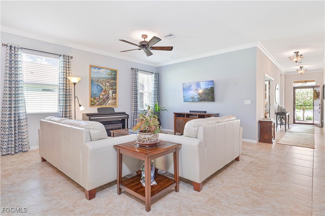 GOLF CART INCLUDED!!! Welcome to your dream home in the Fabulous 55+ community in Cascades at River Hall featuring a large 65’ wide lot for more privacy and space between you and your neighbors. This stunning single-family home boasts 2 bedrooms, 2 bathrooms, den, a spacious 2-car garage and extended lanai with electrical for a hot tub. The interior features a modern office space, stainless steel appliances, a laundry tub, and grab bars in the tub/shower/toilet room for added safety and convenience. The kitchen is equipped with pantry closet shelving/drawers, lower cabinet pull-out drawers, a new fridge, newer induction range and newer microwave. Crown molding and ceiling fans can also be found throughout the home creating a cozy and inviting atmosphere. Enjoy the luxury of a homeowner-owned Kinetico whole house water softening system. For added security, the home is equipped with a Ring doorbell and ADT security system with monitored smoke alarms. The home also includes enhanced hurricane-protection with roll-down Kevlar screens in the lanai and accordion window shutters. The garage offers overhead storage and extra outlets including electrical for a portable generator. The exterior features brick pavers, gutters, downspouts all around, and a widened driveway for convenience. Don't miss out on this incredible opportunity to own a meticulously maintained home with all the upgrades you could ever want!