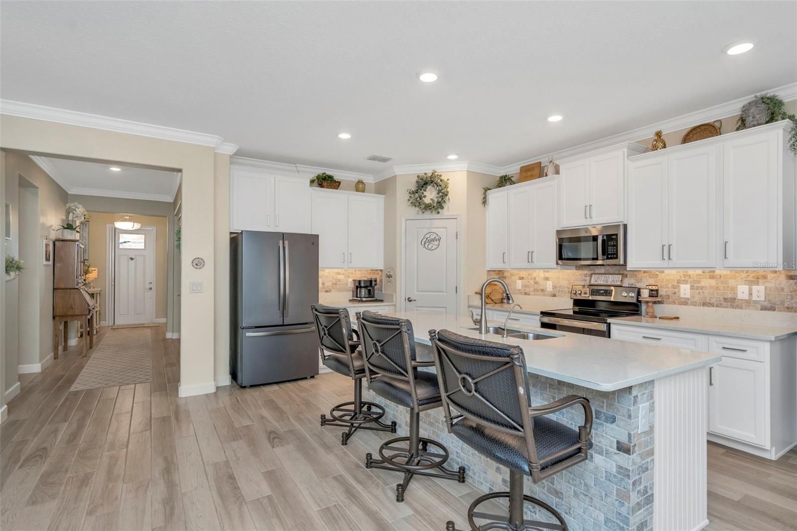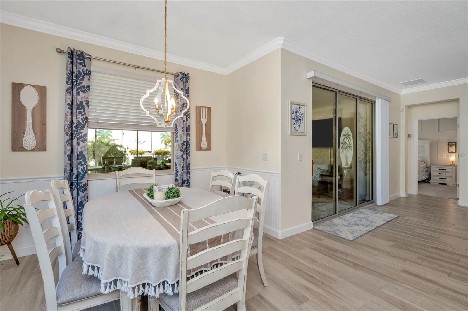 Luxury Florida Living, Elevated for the Active Lifestyle Welcome to a lifestyle defined by comfort, connection, and coastal-inspired luxury in this beautifully appointed home located within one of Florida’s most desirable active adult (55+) communities. Thoughtfully designed for effortless living and refined entertaining, this residence blends upscale finishes with resort-style amenities—right outside your door. One of the home’s standout features is the enclosed, screened extended lanai, elegantly finished with custom pavers and designed as a true outdoor living destination. Complete with a mounted television and ample space for dining and lounging, this private retreat is ideal for alfresco meals, game-day gatherings, or relaxed evenings under the Florida sky—all overlooking a fully fenced, private backyard, offering both serenity and seclusion. Inside, the open-concept living areas are light-filled and welcoming, seamlessly connecting indoor comfort with outdoor enjoyment. Whether hosting friends or savoring quiet mornings, every space has been thoughtfully curated for ease, style, and functionality. The plush and spacious primary suite serves as a private sanctuary, thoughtfully designed with both luxury and convenience in mind. The spa-inspired primary bath features a split dual vanity with generous counter space and a dedicated sit-down makeup area, a private water closet, and an extra-large custom tile and glass walk-in shower that delivers a true resort-style experience. The primary closet offers a seamless pass-through connection to the laundry room, adding everyday ease and thoughtful flow to the home’s design. The home’s open-concept floor plan is elevated by carefully selected finishes, including stone countertops, designer wainscoting accents, a marble tile backsplash, and tile flooring throughout the main living areas, creating a clean, cohesive, and timeless aesthetic ideal for both daily living and entertaining. Beyond the home, residents enjoy a resort-style clubhouse featuring a sparkling pool, modern fitness center, on-site restaurant and bar, plus pickleball and tennis courts that encourage an active, social lifestyle. A golf-cart-friendly path leads directly to the breathtaking 15-acre Mirada Lagoon, where crystal-clear waters and sandy beaches create a one-of-a-kind Florida experience—without ever leaving the community. Conveniently located near shopping, dining, healthcare, and everyday essentials, this home offers the perfect balance of privacy, luxury, and lifestyle. This is more than a home—it’s your next chapter of living well, living active, and living beautifully in Florida.