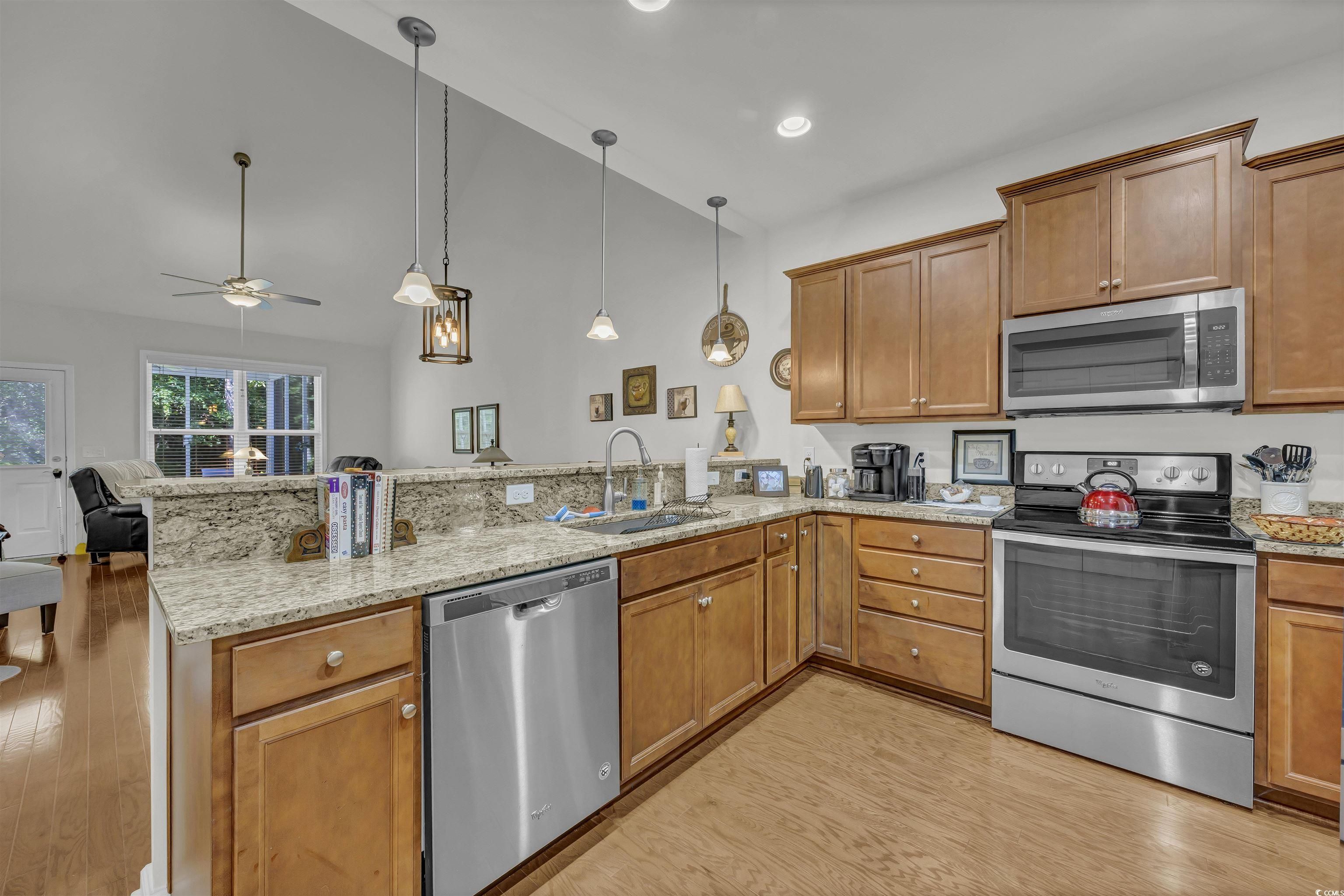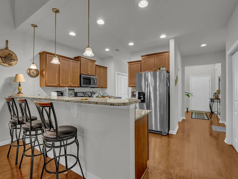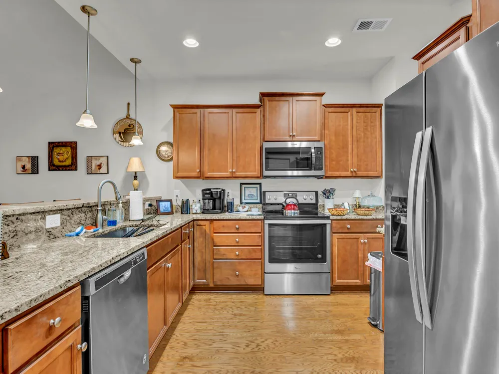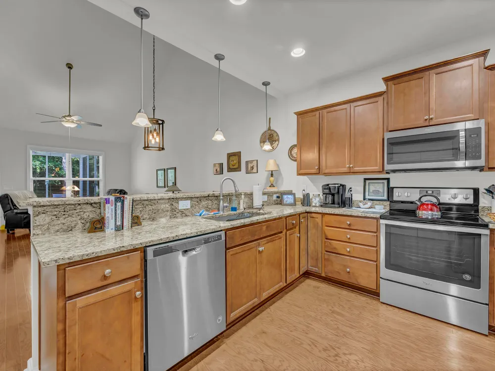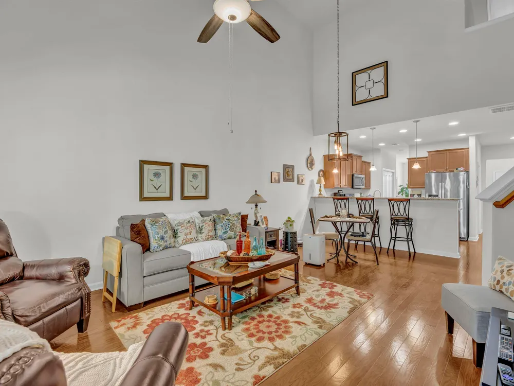 Step through the double-entry foyer of 315 Bulkhead Bend and feel instantly at home in this beautifully maintained condo nestled in the Beacon Towne community. The warm laminate wood flooring guides you past a formal dining room that features a new light fixture, setting the tone for stylish gatherings. The living room and kitchen area provide open living concept space. The kitchen impresses with Whirlpool stainless steel appliances, granite countertops, pendant lighting, and a bar-height counter perfect for casual meals. Vaulted ceilings expand the main living area, and the home is being sold partially furnished (minus the bistro table and personal items, 2 tvs), making it move-in ready. Step out onto the screened porch for peaceful outdoor moments to enjoy the backyard setting. A spacious primary suite featuring tray ceilings, Bassett furniture, blinds, double vanity, walk-in shower, tile flooring, linen closet, and walk-in closet. Upstairs, you'll find a cozy loft area, guest bath with vanity bench and tub/shower combo, and Updates include a new HVAC (2024), garbage disposal, shower head, and flushed water heater (2024). Additional features: stainless appliances include Fridge, washer, dryer. HOA maintains landscaping—including pressure washer and lawn maintenance. Rental-friendly with a 30-day minimum. Living in Calabash and Carolina Shores, NC, offers a relaxed coastal lifestyle with all the charm of small-town living and the convenience of nearby amenities. Known as the “Seafood Capital of the World,” Calabash boasts an incredible culinary scene, especially for seafood lovers. The town is also just minutes from Sunset Beach, providing easy access to sun, sand, and water activities like kayaking and paddleboarding. With a potential for lower cost of living than national averages, Calabash is appealing by seeking affordability without sacrificing quality of life. Carolina Shores, just next door, shares the same peaceful ambiance with beautiful golf courses, scenic neighborhoods, and easy access to shopping and medical care. Both towns offer a close-knit community vibe, making them ideal for those looking to enjoy coastal Carolina living with a blend of tranquility, recreation, and charm.