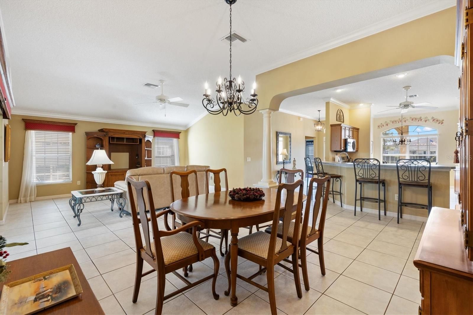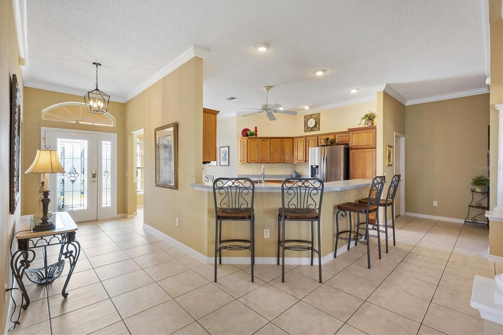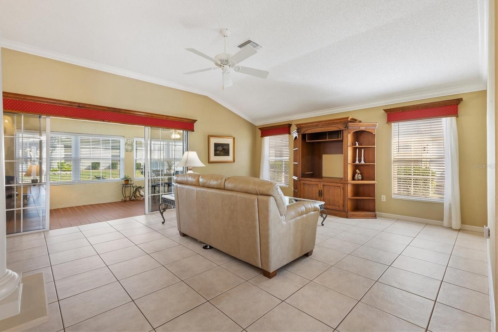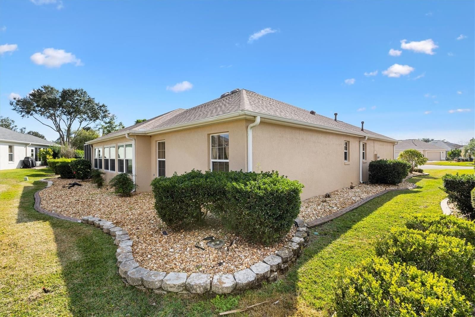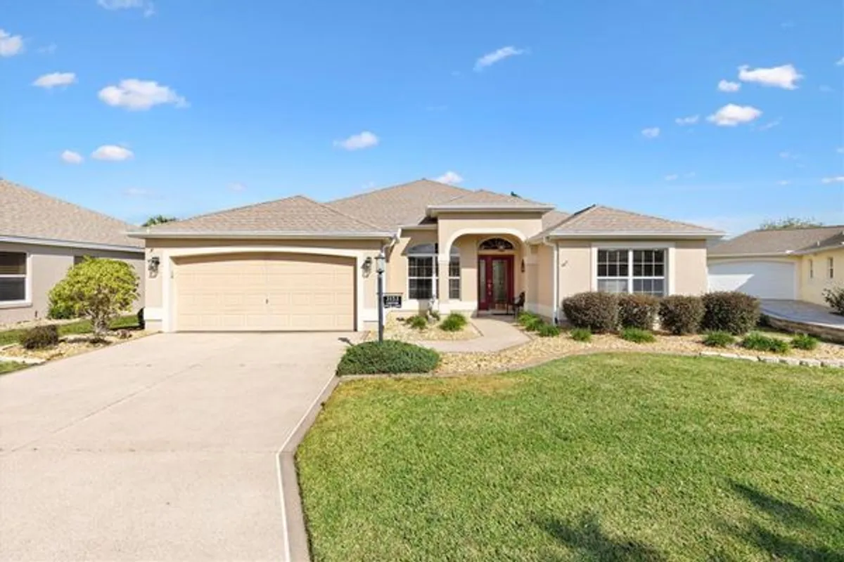 Block with Stucco Gardenia Designer Home • Bond Paid • 2023 Roof • Enclosed Lanai Plus Screen Enclosure • Gas Kitchen • Furnished as Shown • Polo Ridge Cul de Sac Location near Golf and Recreation. This well maintained 3 Bedroom, 2 Bathroom Gardenia Designer Home is tucked away on a quiet Cul-de-sac in the desirable Village of Polo Ridge in The Villages, Florida, offering the convenience of furnishings, and a prime central location. From the moment you arrive, the decorative driveway and attractive curb appeal set the tone for the quality and care found throughout the home. Inside, the open and airy floorplan centers around a large kitchen with stainless steel appliances including a gas range that overlooks the main living and dining areas, creating an ideal layout for everyday living and entertaining. Crown molding, window blinds add to the appeal of this home and is offered with furnishings, as shown in photos, making it easy to move right in. The Primary Suite is generously sized and features two closets, dual sinks, and a step-in shower. The inside laundry room includes cabinetry for added storage and convenience. Enjoy Florida living year-round with an enclosed lanai that opens into a screen enclosure, providing a protected outdoor space for relaxing or entertaining. Additional features include a 2023 roof, 2025 water heater, 2017 HVAC system with April Aire filter, whole home water filtration system, garage refrigerator, and pull-down attic storage in the garage. The location is just as appealing, with convenient access to Saddlebrook Softball Fields at approximately 0.5 mile, the Neighborhood Postal Station at approximately 0.4 mile, Hawkes Bay Executive Golf Course at approximately 0.3 mile, Saddlebrook Recreation Center at approximately 0.5 mile, The Villages Polo Fields at approximately 0.5 mile, and Southern Trace Shopping, Dining, Medical, and More at approximately 1 mile. This Gardenia home offers an exceptional opportunity to enjoy everything The Villages lifestyle provides in a quiet setting close to recreation, golf, shopping, and everyday conveniences.