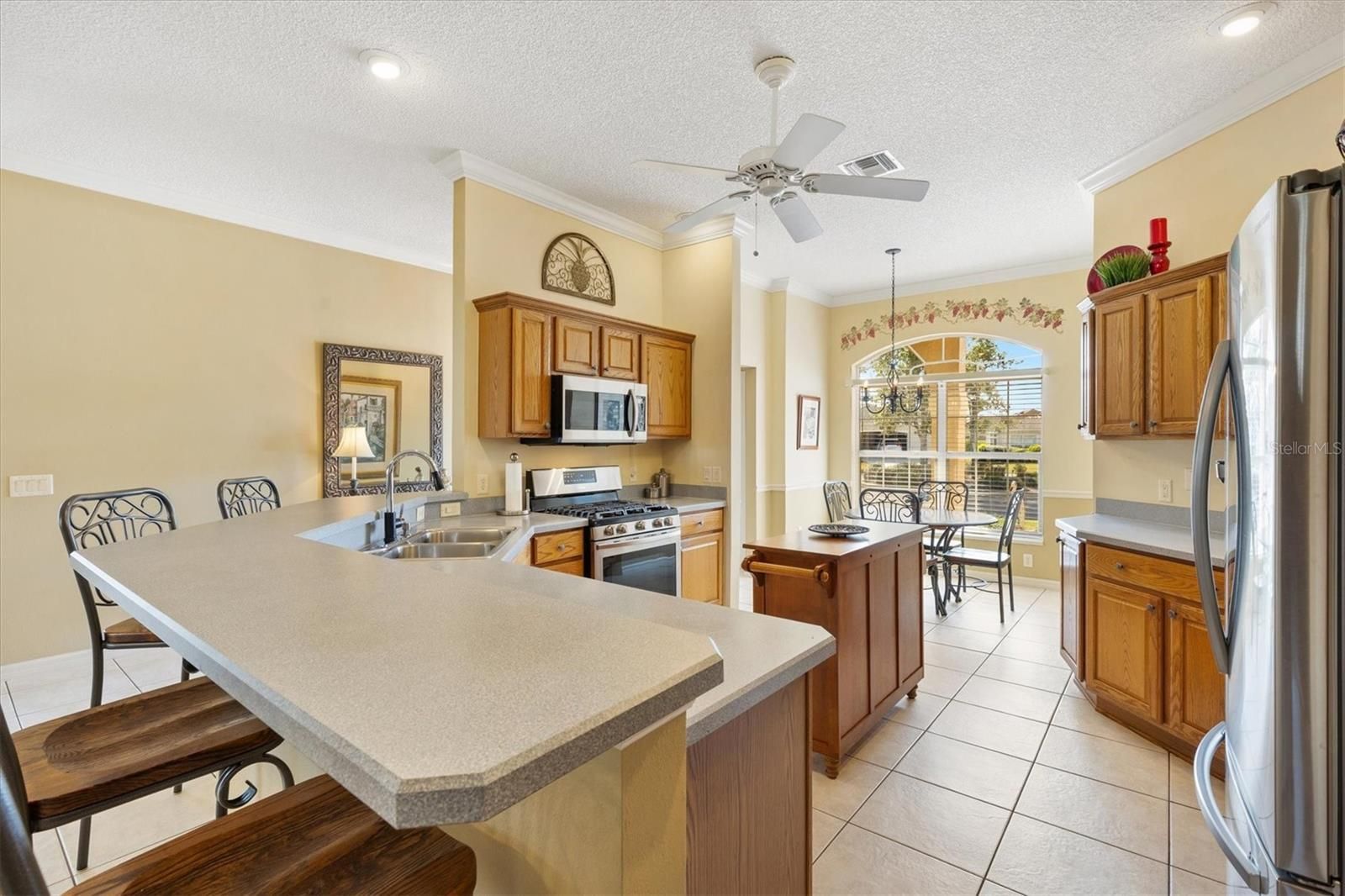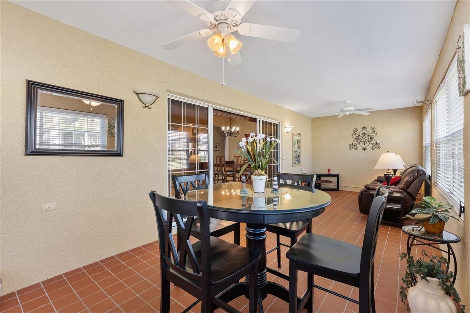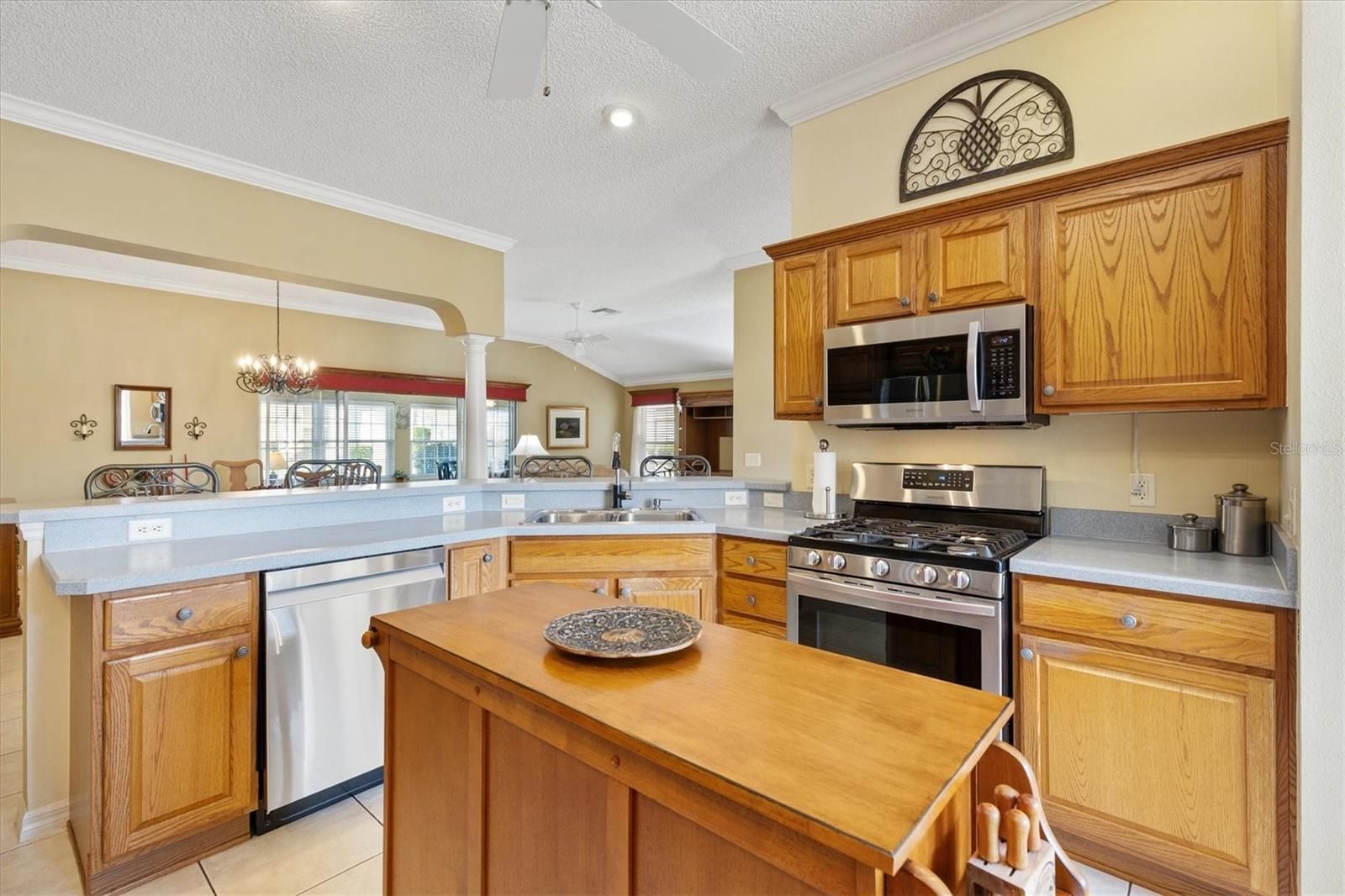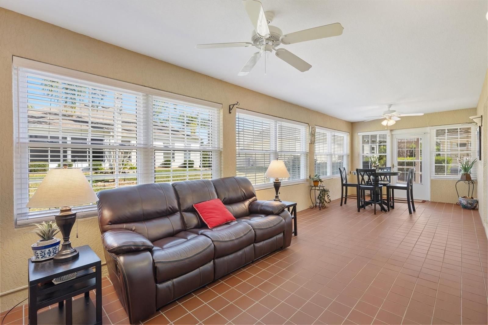 Block with Stucco Gardenia Designer Home • Bond Paid • 2023 Roof • Enclosed Lanai Plus Screen Enclosure • Gas Kitchen • Furnished as Shown • Polo Ridge Cul de Sac Location near Golf and Recreation. This well maintained 3 Bedroom, 2 Bathroom Gardenia Designer Home is tucked away on a quiet Cul-de-sac in the desirable Village of Polo Ridge in The Villages, Florida, offering the convenience of furnishings, and a prime central location. From the moment you arrive, the decorative driveway and attractive curb appeal set the tone for the quality and care found throughout the home. Inside, the open and airy floorplan centers around a large kitchen with stainless steel appliances including a gas range that overlooks the main living and dining areas, creating an ideal layout for everyday living and entertaining. Crown molding, window blinds add to the appeal of this home and is offered with furnishings, as shown in photos, making it easy to move right in. The Primary Suite is generously sized and features two closets, dual sinks, and a step-in shower. The inside laundry room includes cabinetry for added storage and convenience. Enjoy Florida living year-round with an enclosed lanai that opens into a screen enclosure, providing a protected outdoor space for relaxing or entertaining. Additional features include a 2023 roof, 2025 water heater, 2017 HVAC system with April Aire filter, whole home water filtration system, garage refrigerator, and pull-down attic storage in the garage. The location is just as appealing, with convenient access to Saddlebrook Softball Fields at approximately 0.5 mile, the Neighborhood Postal Station at approximately 0.4 mile, Hawkes Bay Executive Golf Course at approximately 0.3 mile, Saddlebrook Recreation Center at approximately 0.5 mile, The Villages Polo Fields at approximately 0.5 mile, and Southern Trace Shopping, Dining, Medical, and More at approximately 1 mile. This Gardenia home offers an exceptional opportunity to enjoy everything The Villages lifestyle provides in a quiet setting close to recreation, golf, shopping, and everyday conveniences.