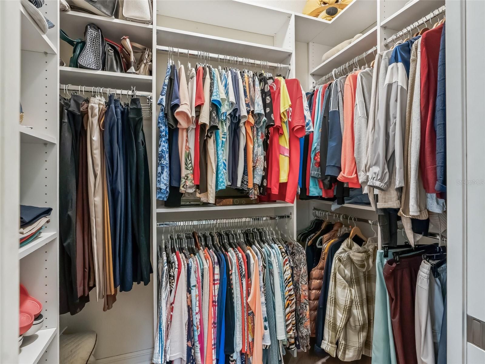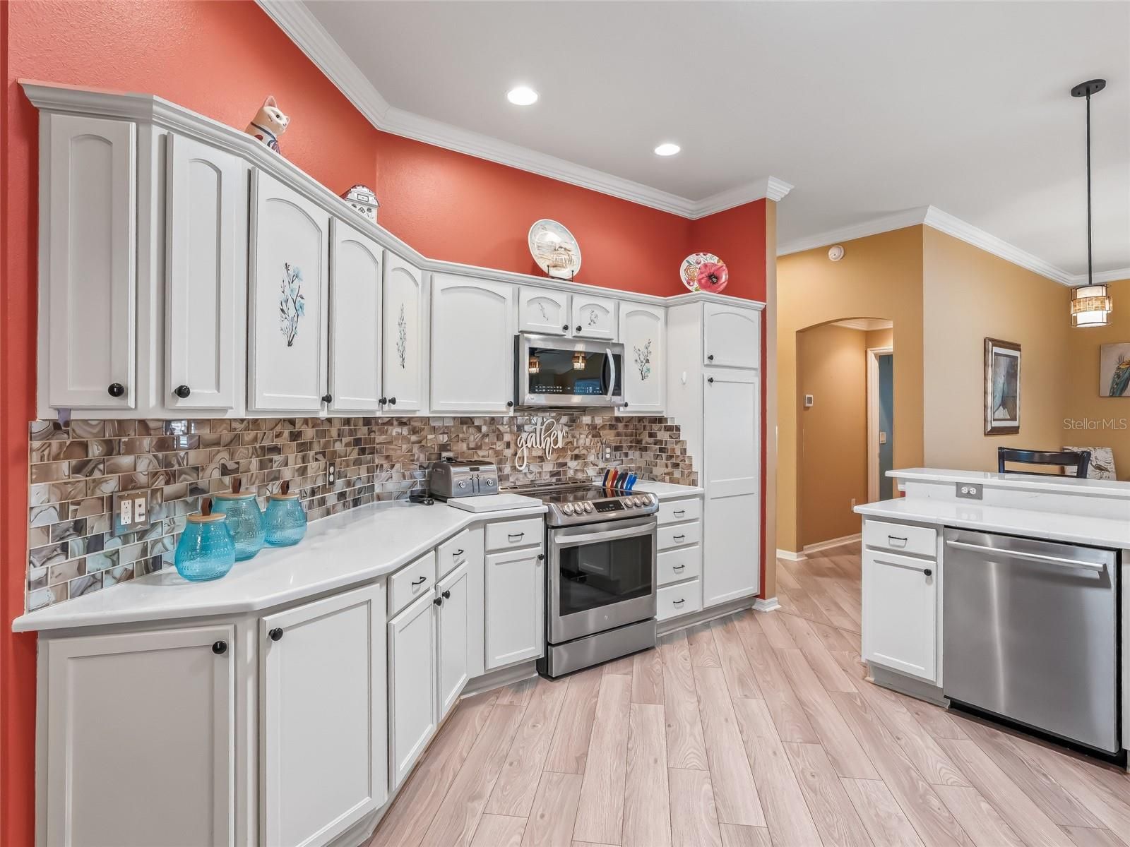 - Ceiling Fan(s), Crown Molding, Eat-in Kitchen, High Ceilings, Open Floorplan, Main Level Primary, Solid Surface Counters, Solid-Wood Cabinets, Split Bedrooms, Thermostat, Walk-In Closet(s), Window Treatments