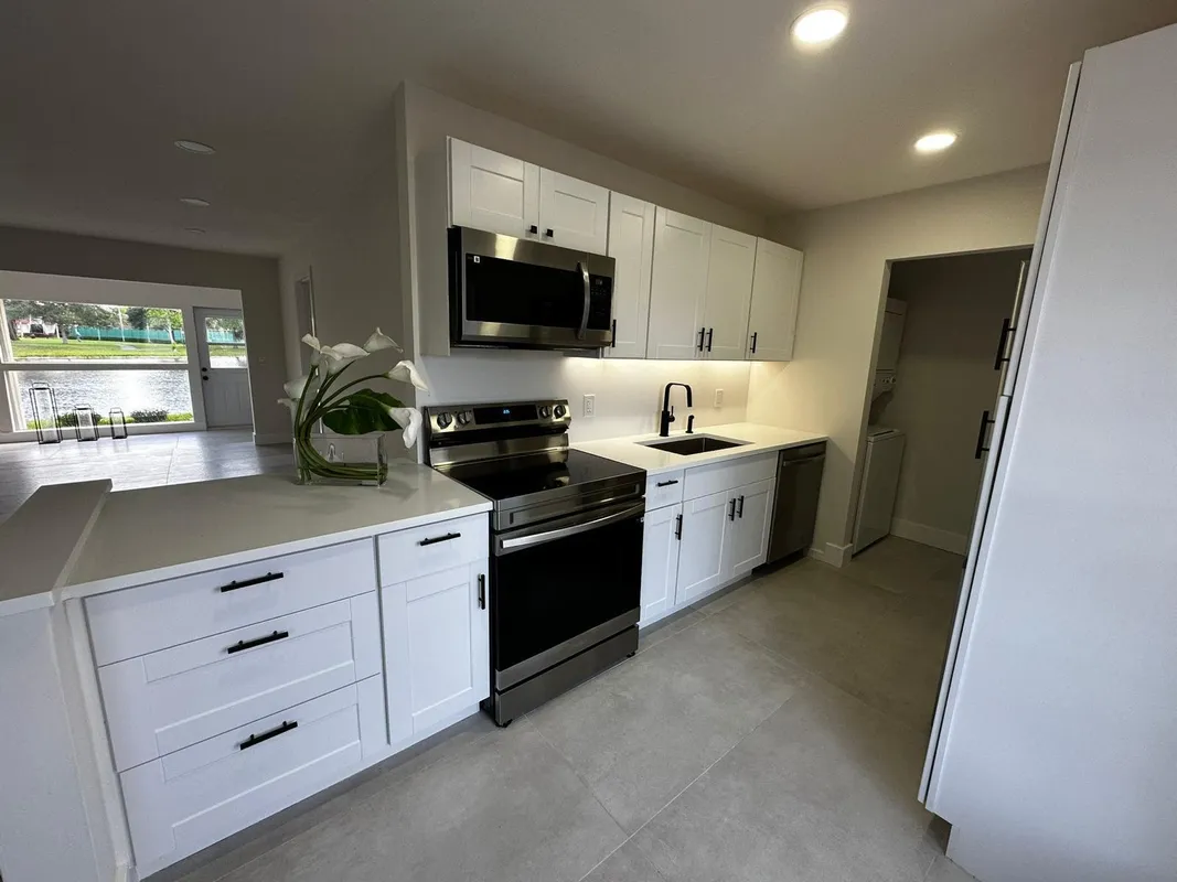STUNNINGLY REMODELED LAKEVIEW VILLACONDO in sought-after 55+ Covered Bridge! This 1 bedroom, 1.5 baths home is move-in ready with a brand-new modern kitchen featuring white shaker cabinets, quartz counters, stainless steel appliances, and sleek black fixtures. The enclosed Florida Room offers serene water views and extra living space. Both bathrooms are fully updated with designer tile and fixtures. Enjoy tile flooring throughout, a new roof (2023), and an in-unit washer and dryer. Covered Bridge provides an active lifestyle with 2 heated pools, tennis courts, shuffleboard, scenic walking paths, a clubhouse, and more. Conveniently located near shopping, dining, and major highways, this low-maintenance home combines style, comfort, and a prime location--submit your offer today!