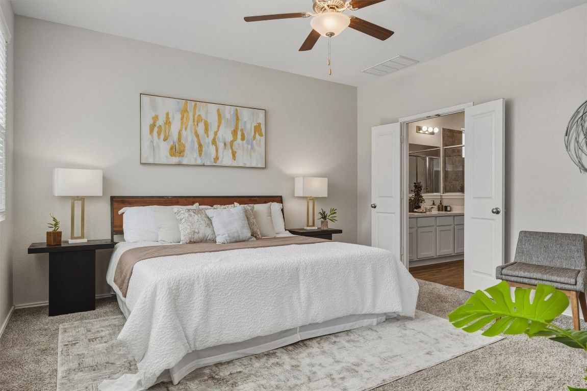 - Ceiling Fan(s), Separate/Formal Dining Room, High Ceilings, Kitchen Island, Multiple Living Areas, Multiple Dining Areas, Main Level Primary, Open Floorplan, Quartz Countertops, Recessed Lighting, Walk-In Closet(s)