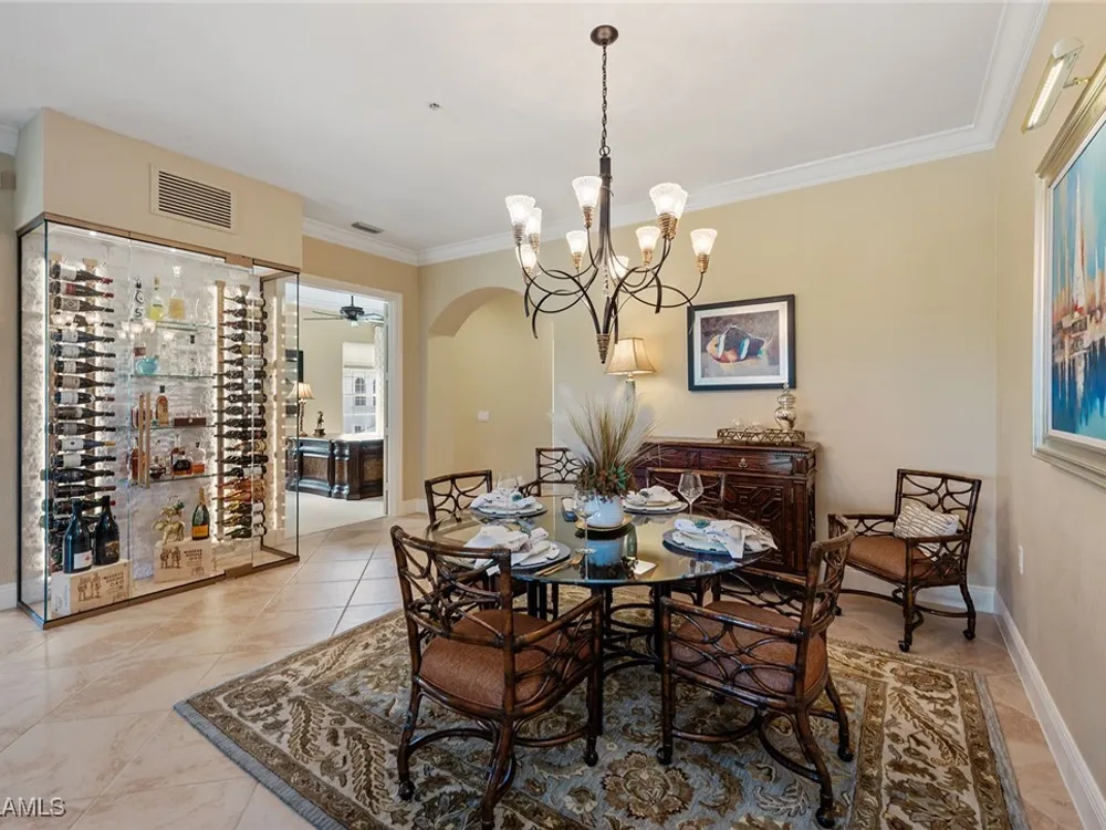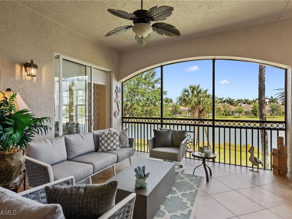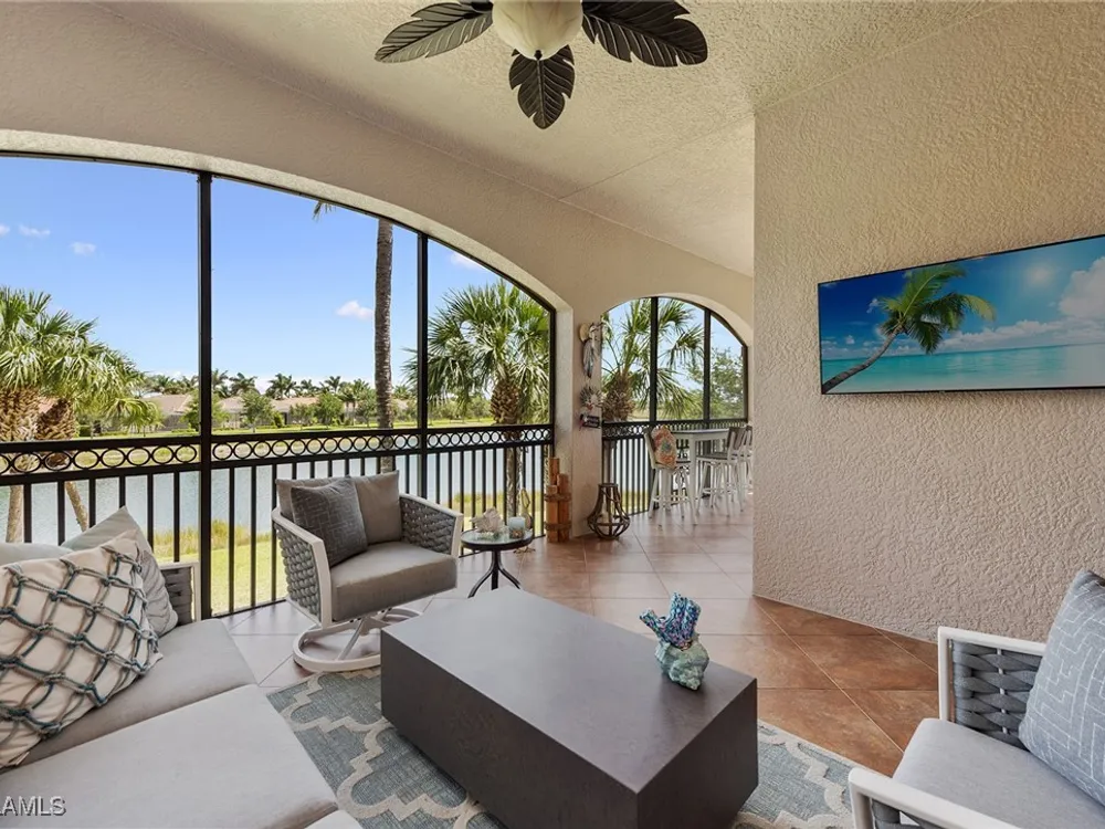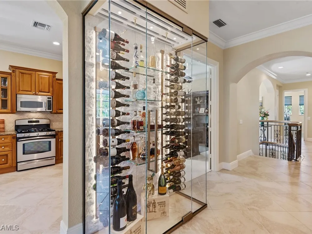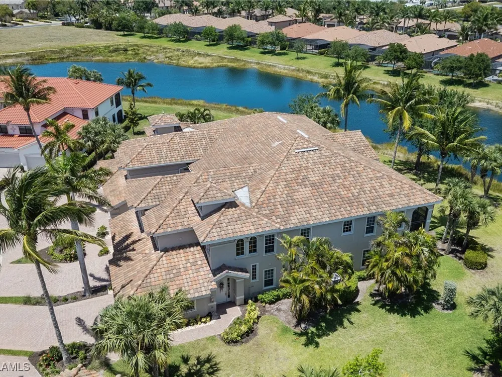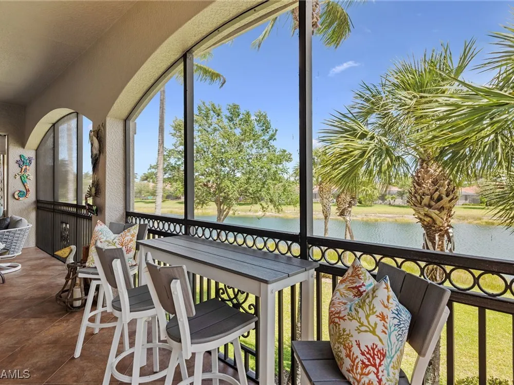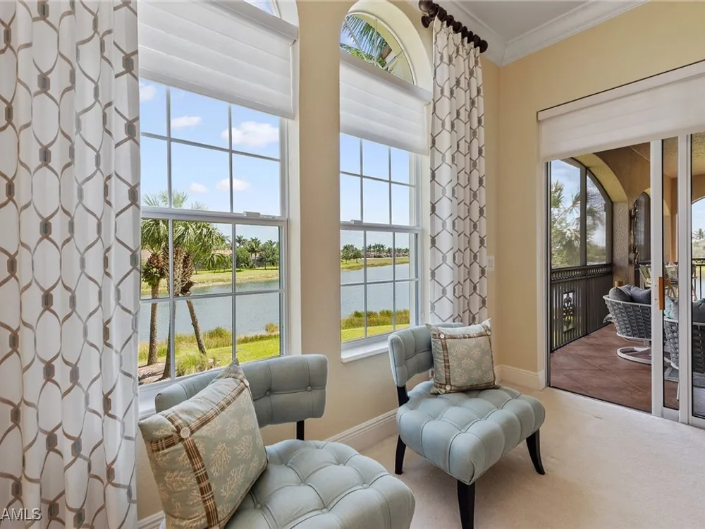 Luxurious second-floor end unit in Serena at Fiddler’s Creek. Welcome to this exquisitely furnished and move-in-ready, three-bedroom plus study, three-bath condominium offering 3,010 square feet of spacious living in the prestigious gated community of Fiddler’s Creek in Naples. In a premium cul-de-sac location, this second-floor end unit offers exceptional privacy and stunning lake views from a large tiled and screened lanai with no neighboring building in sight. Elegantly designed with crown molding, plantation shutters, tile floors, designer lighting, ceiling fans and high-quality finishes throughout. The bright and open layout is ideal for relaxing and entertaining. A custom, lighted, temperature-controlled wine gallery is a show-stopping focal point for wine lovers and entertainers alike. The upgraded kitchen features stainless steel appliances, natural gas cooking, French door refrigerator, pantry, eat-in breakfast nook and upgraded cabinetry. A spacious living area flows seamlessly into the dining and lanai spaces, creating a welcoming, airy atmosphere. Retreat to the luxurious primary suite with two custom walk-in closets, dual vanities, a soaking tub, a separate shower and a makeup counter. The second primary suite is equally impressive, generously sized with its large walk-in closet. A third bedroom and separate study add flexibility for guests or working from home. Additional premium features include a private elevator, wood staircase, two-car garage, tankless hot water heater, laundry room with front-load washer/dryer, sink, and storage cabinets, and full storm protection for peace of mind. Enjoy the unmatched lifestyle of Fiddler’s Creek, a sought-after gated luxury community known for lush landscaping and an active resort lifestyle. Amenities include a spectacular resort-style pool with waterfalls and slides, hot tub, sauna, steam room, and a state-of-the-art fitness center with personal trainers and daily classes. Tennis and pickleball programs are vibrant and active, and dining options include a fine dining restaurant and poolside bar and grill. There is always something to do with a full calendar of events and activities. Optional memberships are available for golf, beach and marina access, including a newly renovated championship golf course and a new clubhouse. Ideally near Marco Island, downtown Naples, beaches, marinas, yacht clubs, shopping, dining, parks, kayaking, paddleboarding and an executive airport. This home is ideal for the discerning buyer seeking comfort, elegance, privacy and luxury.