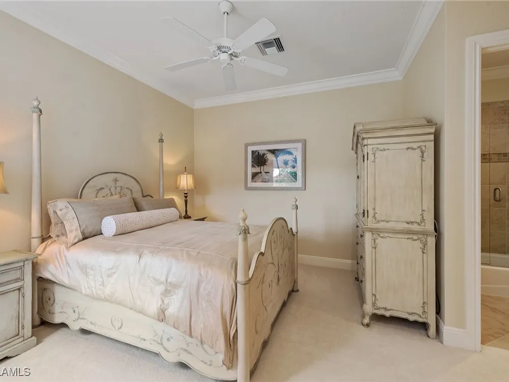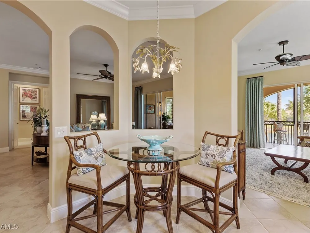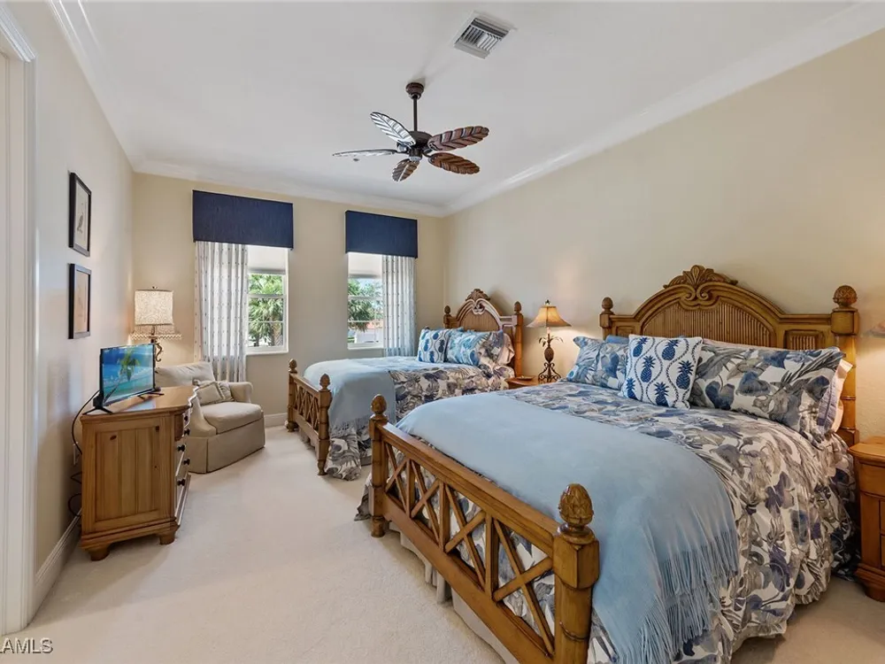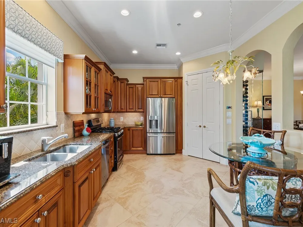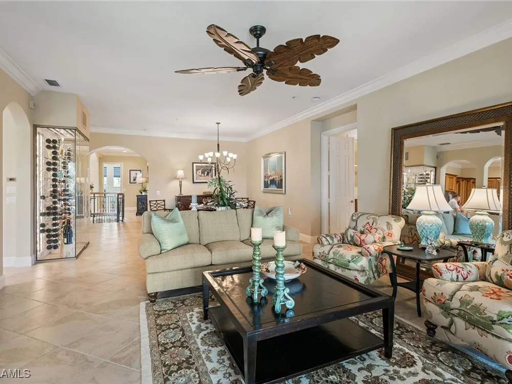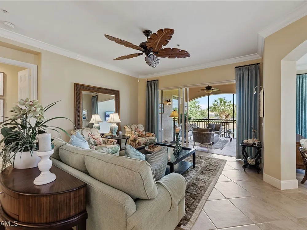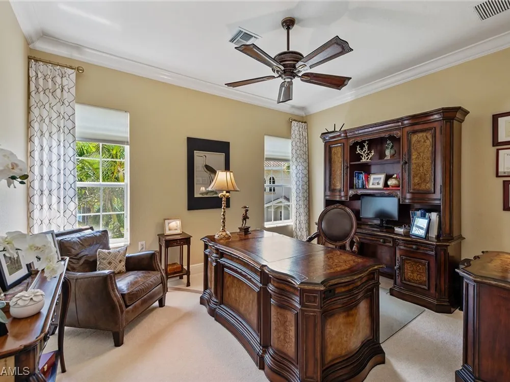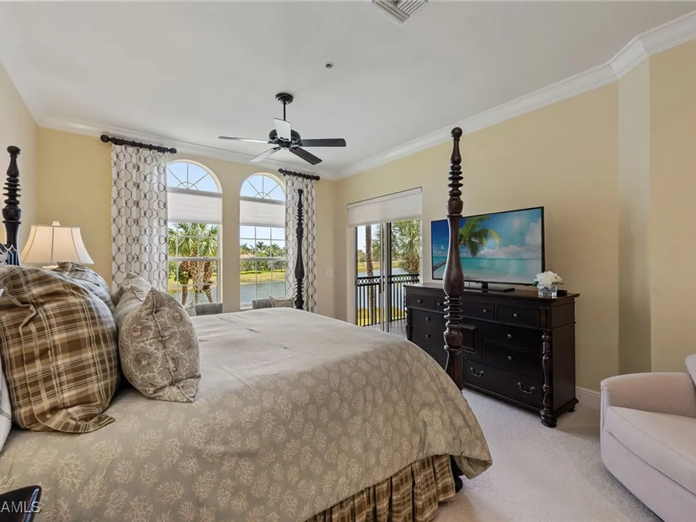 Luxurious second-floor end unit in Serena at Fiddler’s Creek. Welcome to this exquisitely furnished and move-in-ready, three-bedroom plus study, three-bath condominium offering 3,010 square feet of spacious living in the prestigious gated community of Fiddler’s Creek in Naples. In a premium cul-de-sac location, this second-floor end unit offers exceptional privacy and stunning lake views from a large tiled and screened lanai with no neighboring building in sight. Elegantly designed with crown molding, plantation shutters, tile floors, designer lighting, ceiling fans and high-quality finishes throughout. The bright and open layout is ideal for relaxing and entertaining. A custom, lighted, temperature-controlled wine gallery is a show-stopping focal point for wine lovers and entertainers alike. The upgraded kitchen features stainless steel appliances, natural gas cooking, French door refrigerator, pantry, eat-in breakfast nook and upgraded cabinetry. A spacious living area flows seamlessly into the dining and lanai spaces, creating a welcoming, airy atmosphere. Retreat to the luxurious primary suite with two custom walk-in closets, dual vanities, a soaking tub, a separate shower and a makeup counter. The second primary suite is equally impressive, generously sized with its large walk-in closet. A third bedroom and separate study add flexibility for guests or working from home. Additional premium features include a private elevator, wood staircase, two-car garage, tankless hot water heater, laundry room with front-load washer/dryer, sink, and storage cabinets, and full storm protection for peace of mind. Enjoy the unmatched lifestyle of Fiddler’s Creek, a sought-after gated luxury community known for lush landscaping and an active resort lifestyle. Amenities include a spectacular resort-style pool with waterfalls and slides, hot tub, sauna, steam room, and a state-of-the-art fitness center with personal trainers and daily classes. Tennis and pickleball programs are vibrant and active, and dining options include a fine dining restaurant and poolside bar and grill. There is always something to do with a full calendar of events and activities. Optional memberships are available for golf, beach and marina access, including a newly renovated championship golf course and a new clubhouse. Ideally near Marco Island, downtown Naples, beaches, marinas, yacht clubs, shopping, dining, parks, kayaking, paddleboarding and an executive airport. This home is ideal for the discerning buyer seeking comfort, elegance, privacy and luxury.