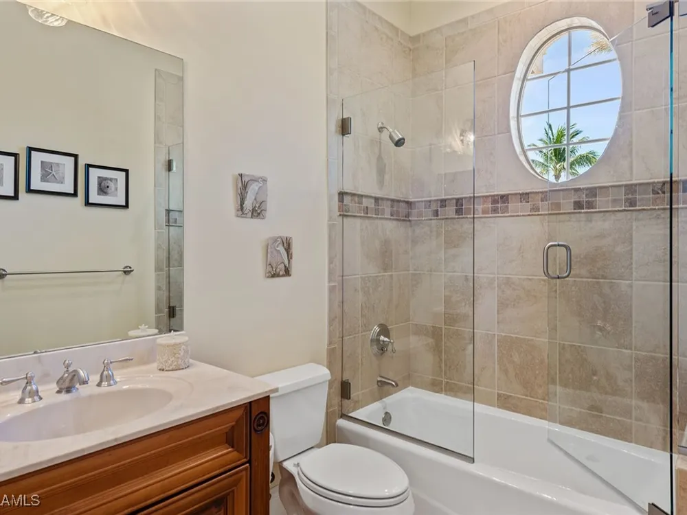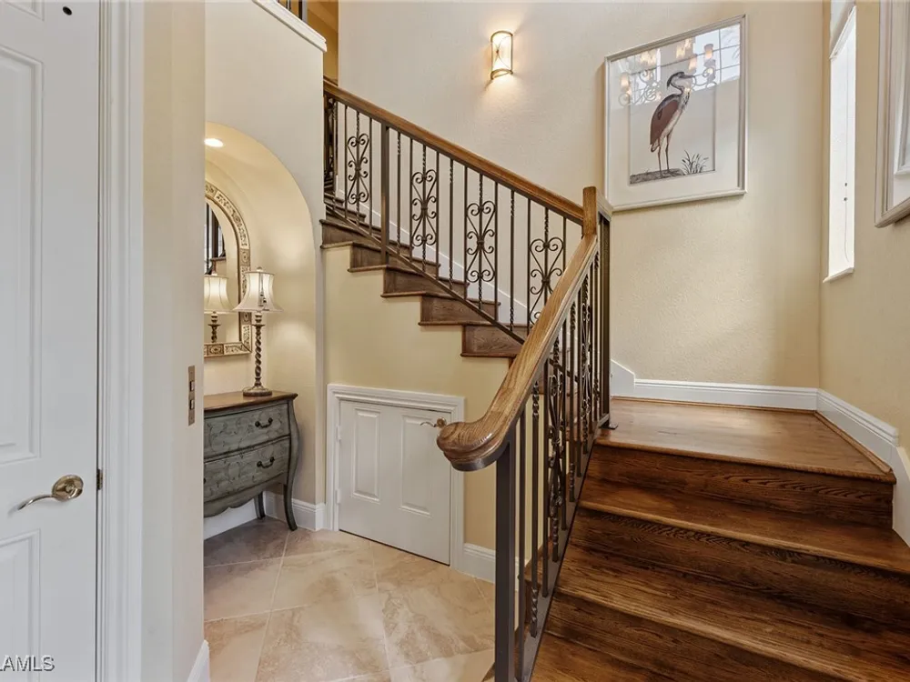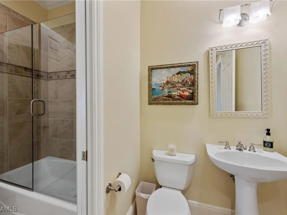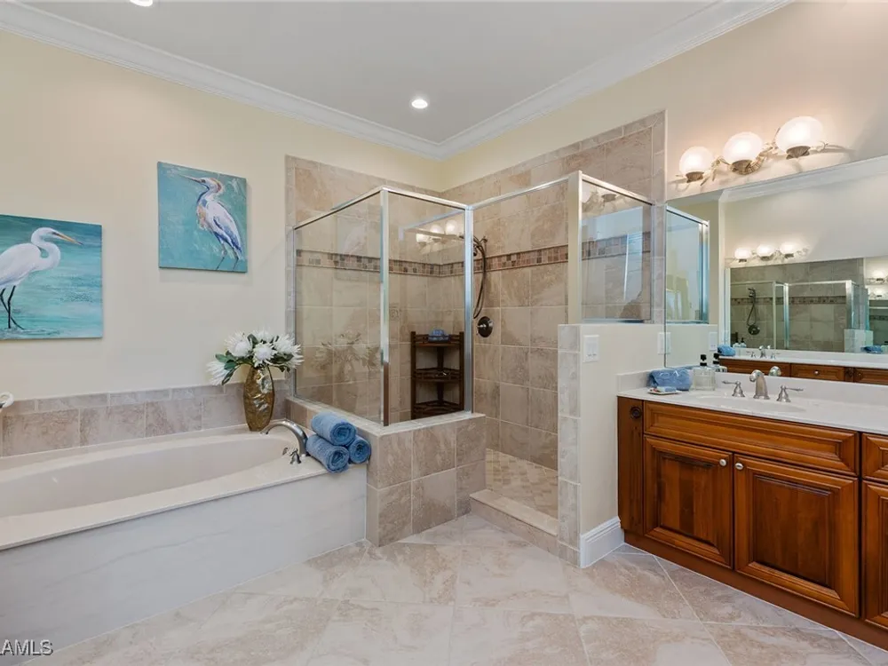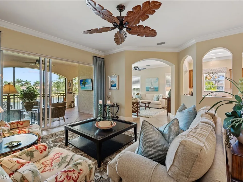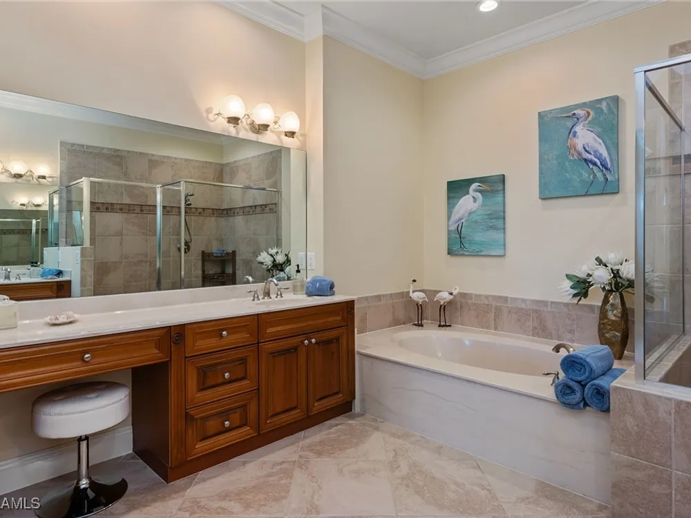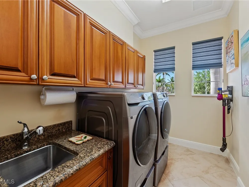 Luxurious second-floor end unit in Serena at Fiddler’s Creek. Welcome to this exquisitely furnished and move-in-ready, three-bedroom plus study, three-bath condominium offering 3,010 square feet of spacious living in the prestigious gated community of Fiddler’s Creek in Naples. In a premium cul-de-sac location, this second-floor end unit offers exceptional privacy and stunning lake views from a large tiled and screened lanai with no neighboring building in sight. Elegantly designed with crown molding, plantation shutters, tile floors, designer lighting, ceiling fans and high-quality finishes throughout. The bright and open layout is ideal for relaxing and entertaining. A custom, lighted, temperature-controlled wine gallery is a show-stopping focal point for wine lovers and entertainers alike. The upgraded kitchen features stainless steel appliances, natural gas cooking, French door refrigerator, pantry, eat-in breakfast nook and upgraded cabinetry. A spacious living area flows seamlessly into the dining and lanai spaces, creating a welcoming, airy atmosphere. Retreat to the luxurious primary suite with two custom walk-in closets, dual vanities, a soaking tub, a separate shower and a makeup counter. The second primary suite is equally impressive, generously sized with its large walk-in closet. A third bedroom and separate study add flexibility for guests or working from home. Additional premium features include a private elevator, wood staircase, two-car garage, tankless hot water heater, laundry room with front-load washer/dryer, sink, and storage cabinets, and full storm protection for peace of mind. Enjoy the unmatched lifestyle of Fiddler’s Creek, a sought-after gated luxury community known for lush landscaping and an active resort lifestyle. Amenities include a spectacular resort-style pool with waterfalls and slides, hot tub, sauna, steam room, and a state-of-the-art fitness center with personal trainers and daily classes. Tennis and pickleball programs are vibrant and active, and dining options include a fine dining restaurant and poolside bar and grill. There is always something to do with a full calendar of events and activities. Optional memberships are available for golf, beach and marina access, including a newly renovated championship golf course and a new clubhouse. Ideally near Marco Island, downtown Naples, beaches, marinas, yacht clubs, shopping, dining, parks, kayaking, paddleboarding and an executive airport. This home is ideal for the discerning buyer seeking comfort, elegance, privacy and luxury.