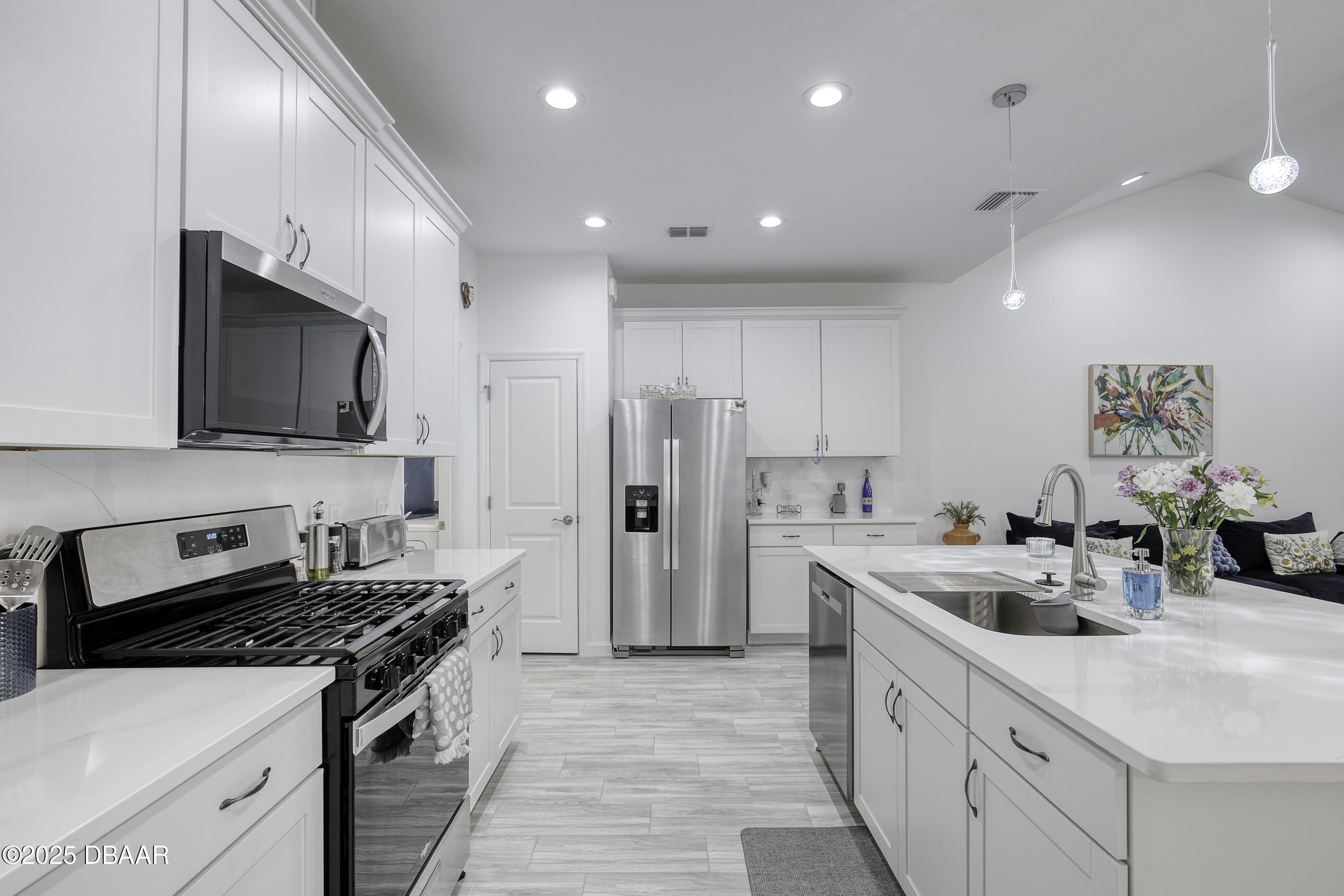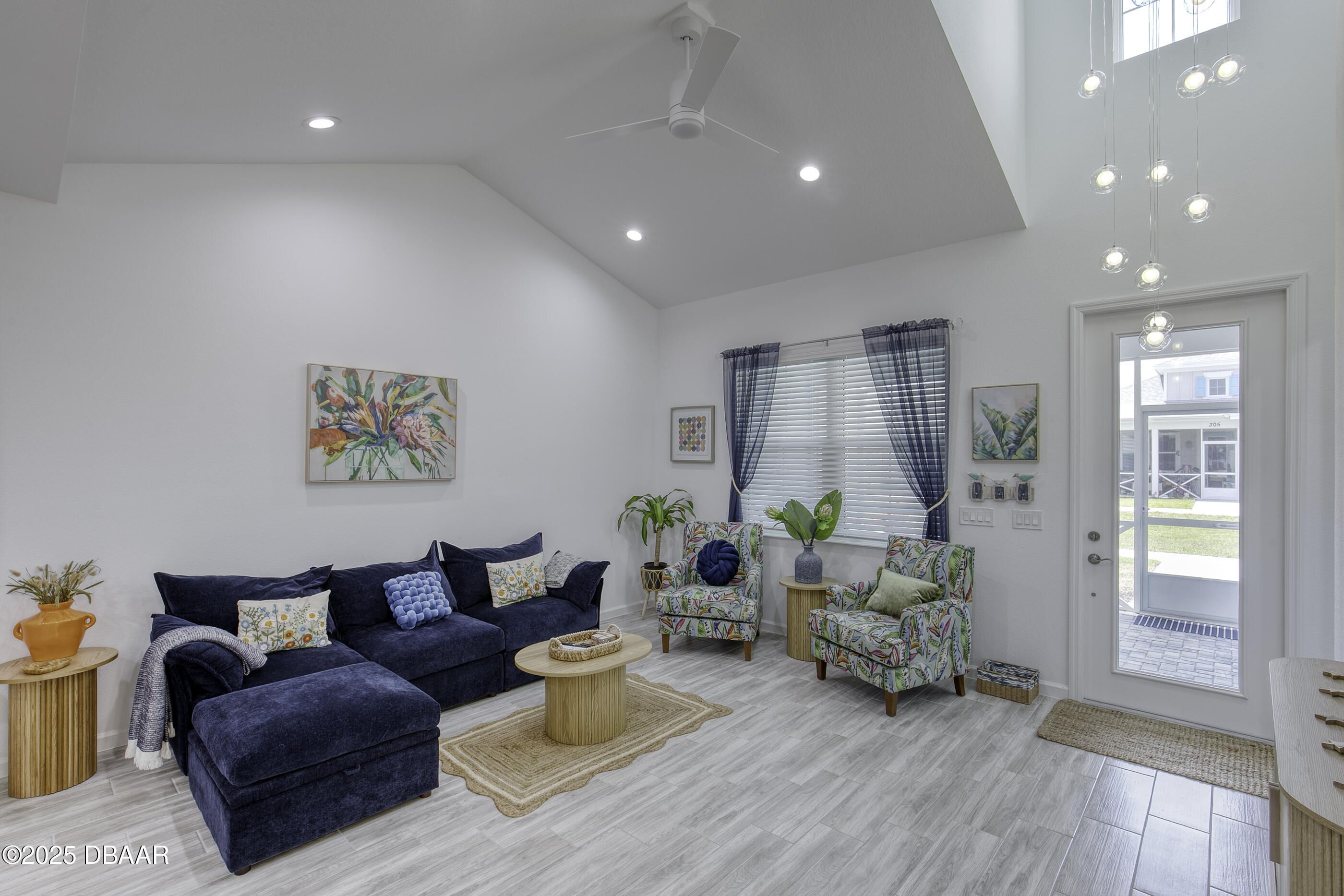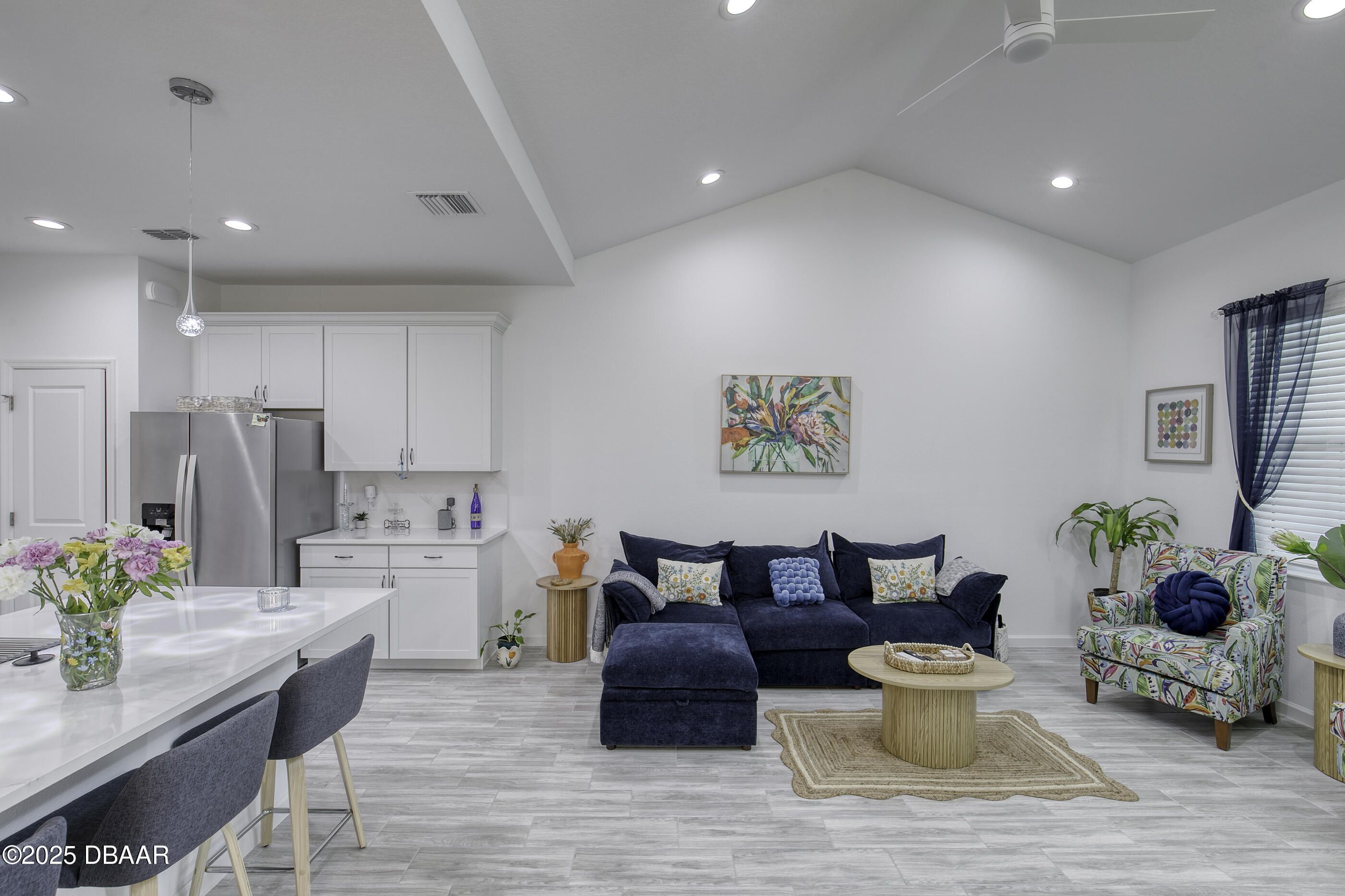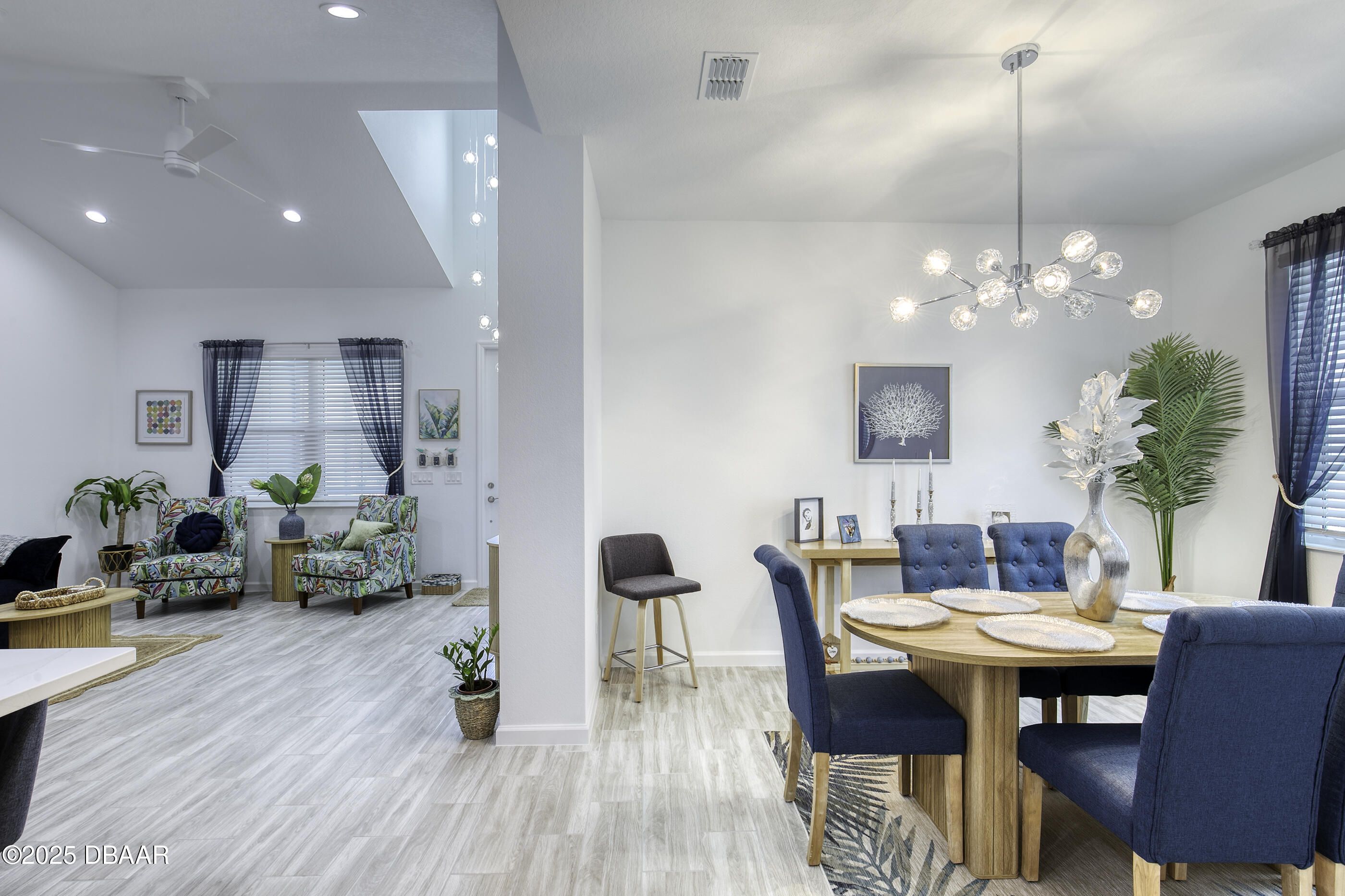 Welcome to your personal oasis in Latitude of Daytona Beach, a highly sought-after 55+ community inspired by the carefree coastal lifestyle. This nearly new Camelia model is less than a year old and showcases an open, airy floor plan with elegant designer finishes throughout. Enjoy durable and stylish plank tile flooring that flows through the entire home, enhanced by recessed lighting, ceiling fans, and gorgeous high-end fixtures. The gourmet kitchen is a showstopper, featuring quartz countertops with a matching backsplash, 42-inch cabinets with crown molding, a gas range, and sleek stainless steel appliances. Custom window treatments add both charm and privacy. The luxurious primary suite offers a peaceful retreat with a spa-inspired bathroom, complete with a center row of cabinetry, high-end quartz counters, and a tiled, glass-enclosed shower. A convenient pocket door separates the suite for added privacy. The guest bath echoes the same upscale finishes with quartz counters and a tiled shower surround. Step outside to the screened porch overlooking a wide open green space, perfect for enjoying serene mornings or breezy evenings. Live the good life with access to a vibrant community town center, where live music fills the air every Friday and Saturday night. Unwind at the stunning tropical lagoon-style resort pool, with live music daily, or enjoy two additional heated pools including a sports pool and an indoor lap pool. Sports lovers will enjoy tennis, pickleball, bocce, and pool volleyball, while furry friends have their own space at the golf cart-friendly dog park. Unleash your creativity in the pottery and woodworking studios, catch a show at the theater, or relax at the Bar & Chill restaurant with neighbors and friends. A private oceanfront beach club, complete with loungers, umbrellas, and a heated pool, adds the perfect coastal touch to this exceptional lifestyle. With lawn care, landscaping, exterior painting, and roof maintenance included, you'll have more time to enjoy everything this beautifully planned community has to offer. Schedule your private tour today and experience the resort-style lifestyle that awaits in Latitude of Daytona Beach! All information recorded in the MLS is intended to be accurate but cannot be guaranteed.