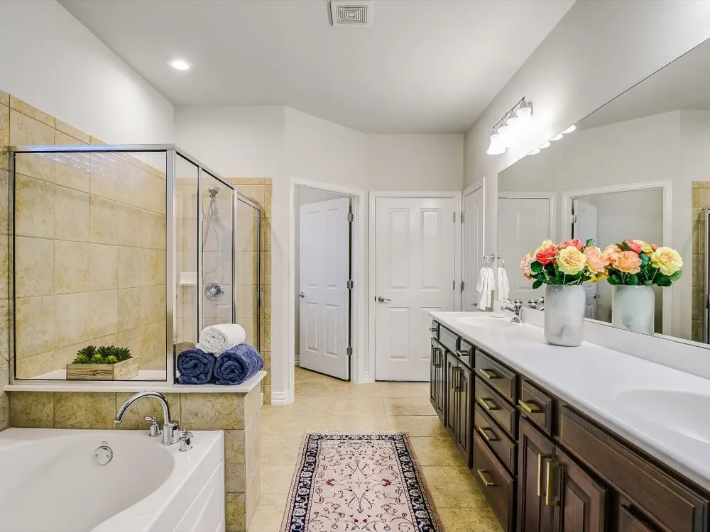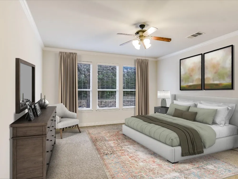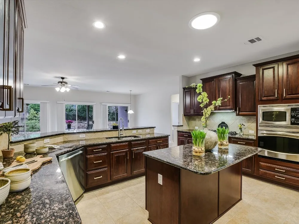 - Breakfast Bar, Ceiling Fan(s), Crown Molding, Separate/Formal Dining Room, Double Vanity, Granite Counters, Kitchen Island, Multiple Living Areas, Multiple Dining Areas, Main Level Primary, Open Floorplan, Recessed Lighting, Storage, Soaking Tub, Walk-In Closet(s)