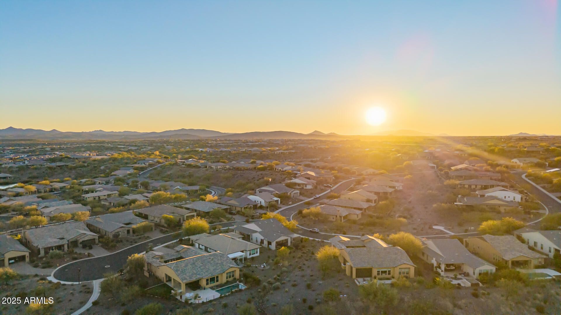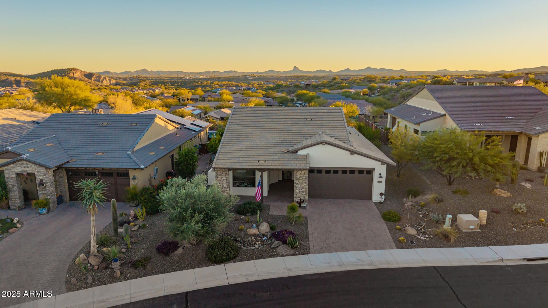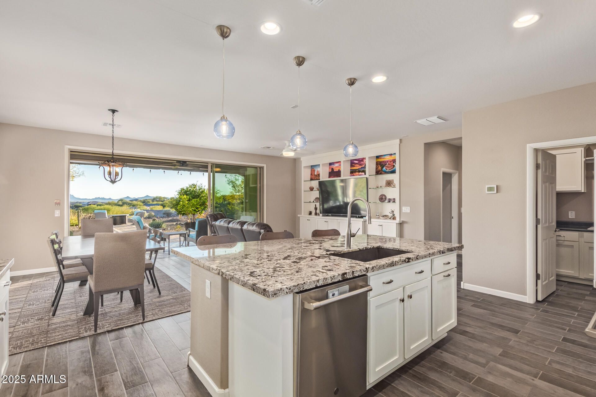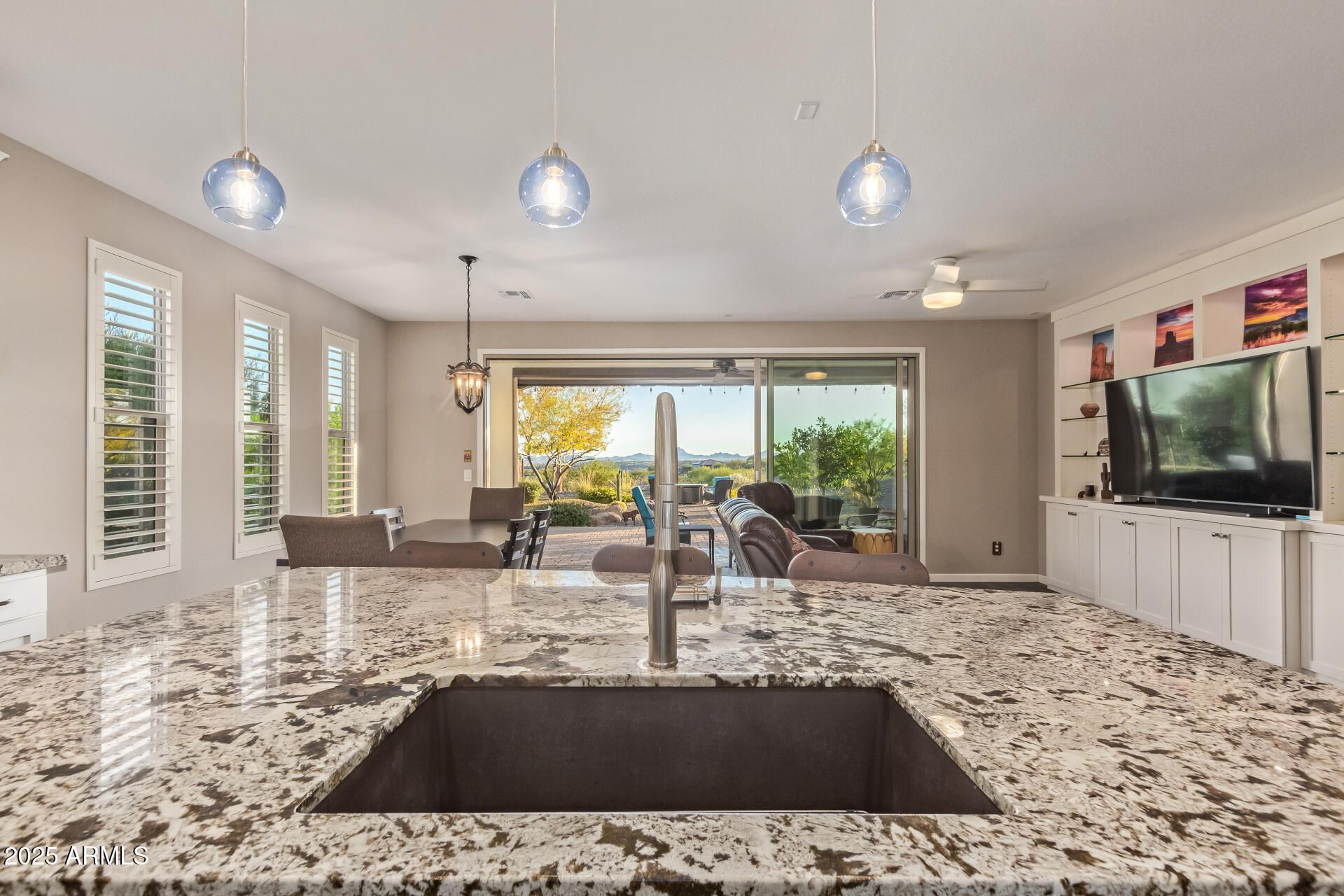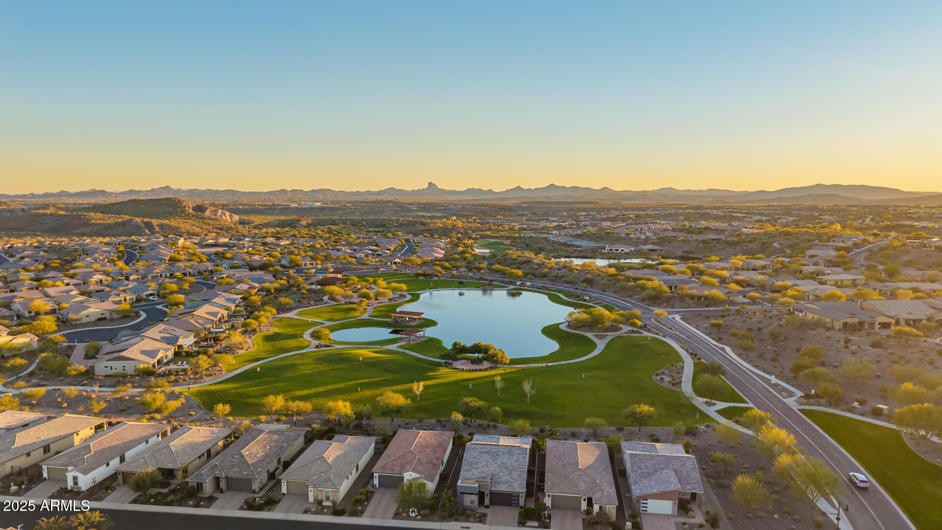 This elevated Juniper model offers everything you've been dreaming of, featuring unobstructed views of iconic Vulture Peak and a lifestyle you will love! The thoughtfully designed split 2-bedroom floor plan showcases an open great room concept ideal for everyday living and entertaining, enhanced by custom built-in shelves and cabinets for both style and functionality. The kitchen is beautifully appointed with honed granite countertops, subway tile backsplash, upgraded cabinets, stainless steel appliances, a gas cooktop, large pantry, and an office nook. Expansive glass wall sliding doors open to a covered patio with a gas firepit, creating seamless indoor-outdoor living and the perfect setting to take in the breathtaking views. The primary suite features dual sinks, a tiled walk-in shower, and a spacious walk-in closet. Enjoy an exceptional community lifestyle with two championship golf courses, spa, pickleball, tennis, fine dining, a resort-style pool, and more! Hurry, this gem won't last!