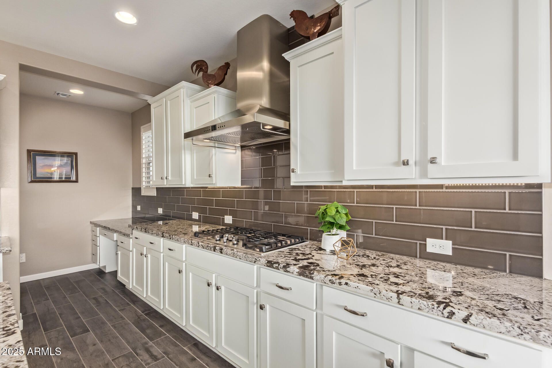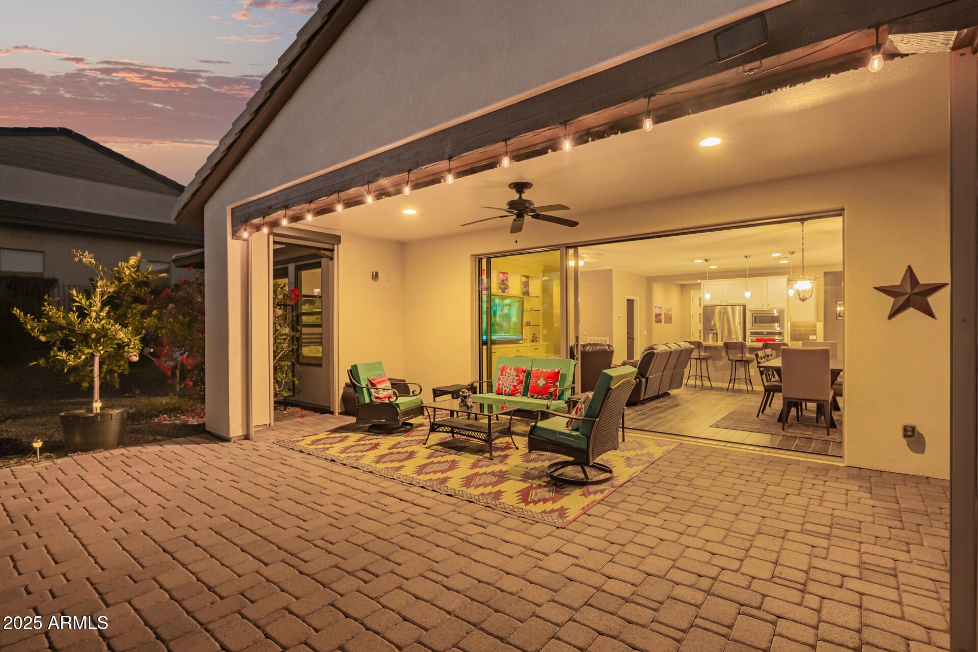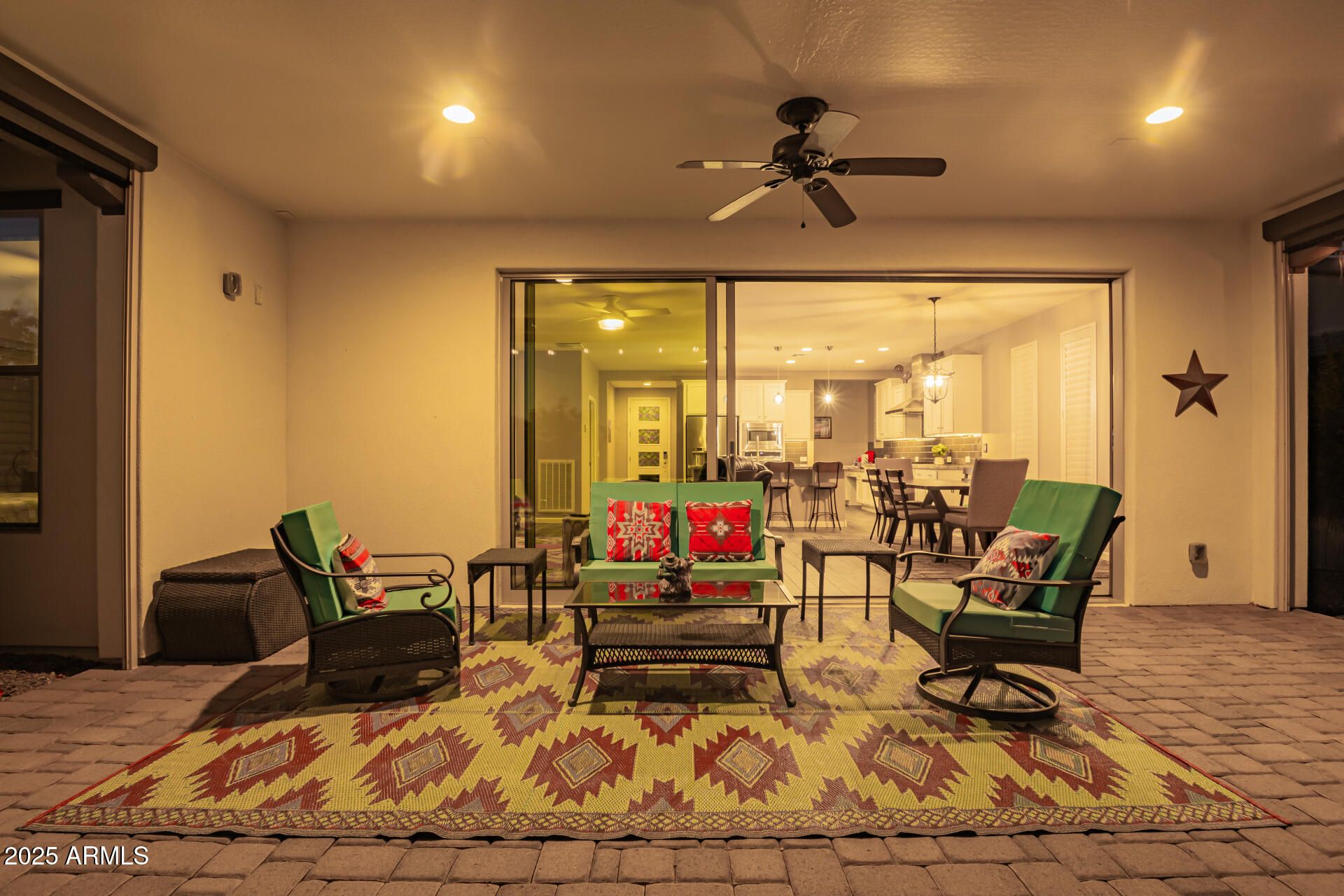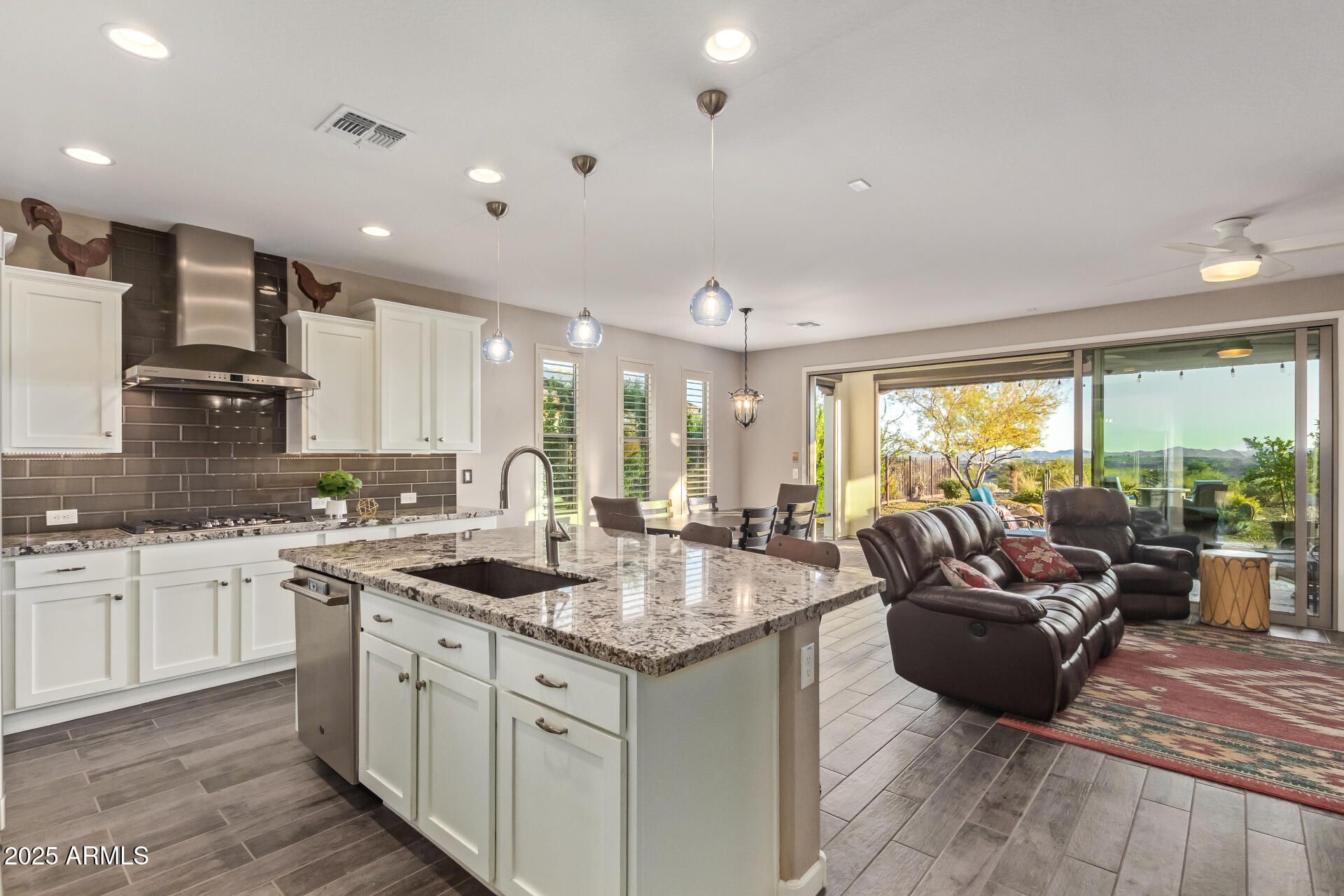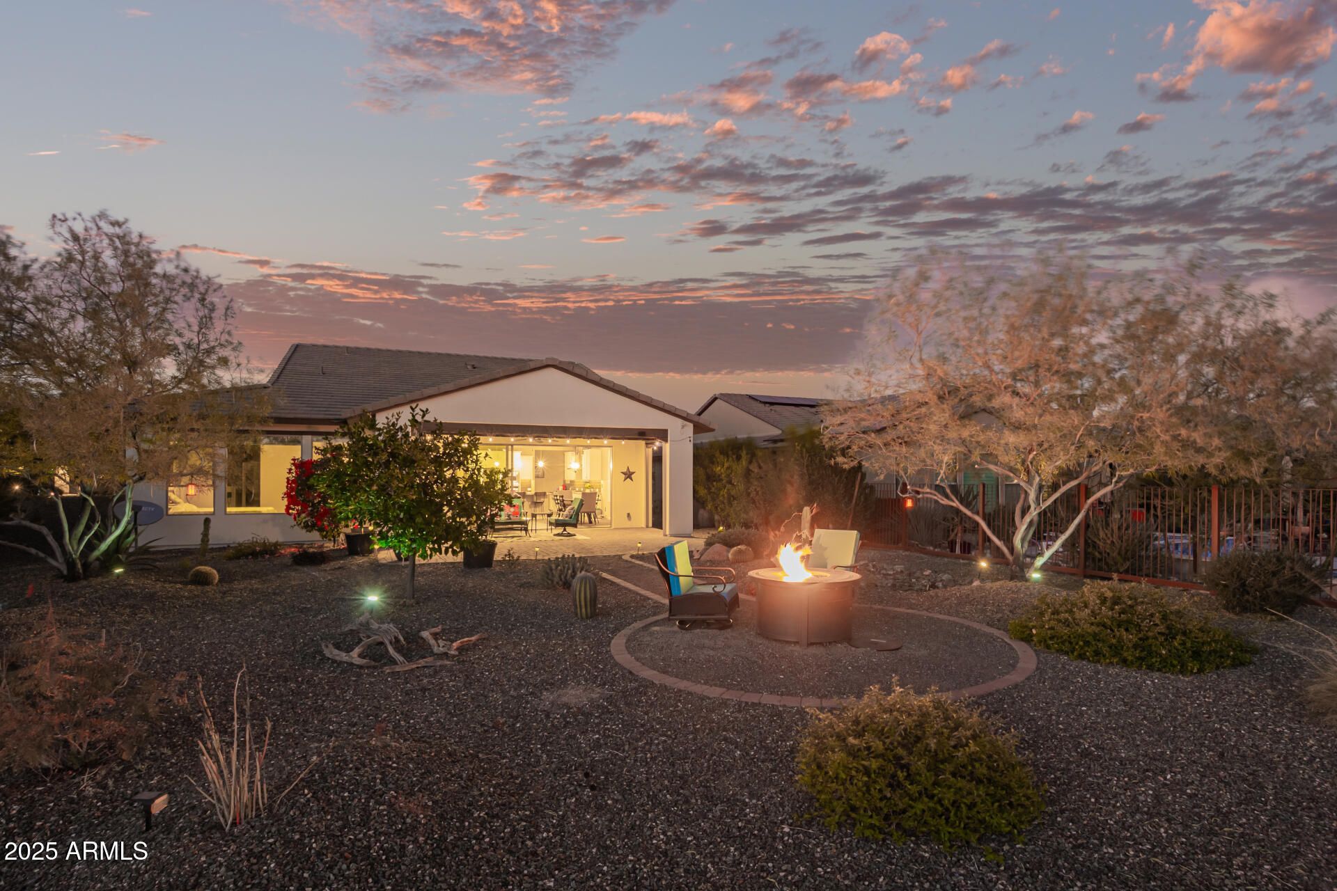 This elevated Juniper model offers everything you've been dreaming of, featuring unobstructed views of iconic Vulture Peak and a lifestyle you will love! The thoughtfully designed split 2-bedroom floor plan showcases an open great room concept ideal for everyday living and entertaining, enhanced by custom built-in shelves and cabinets for both style and functionality. The kitchen is beautifully appointed with honed granite countertops, subway tile backsplash, upgraded cabinets, stainless steel appliances, a gas cooktop, large pantry, and an office nook. Expansive glass wall sliding doors open to a covered patio with a gas firepit, creating seamless indoor-outdoor living and the perfect setting to take in the breathtaking views. The primary suite features dual sinks, a tiled walk-in shower, and a spacious walk-in closet. Enjoy an exceptional community lifestyle with two championship golf courses, spa, pickleball, tennis, fine dining, a resort-style pool, and more! Hurry, this gem won't last!