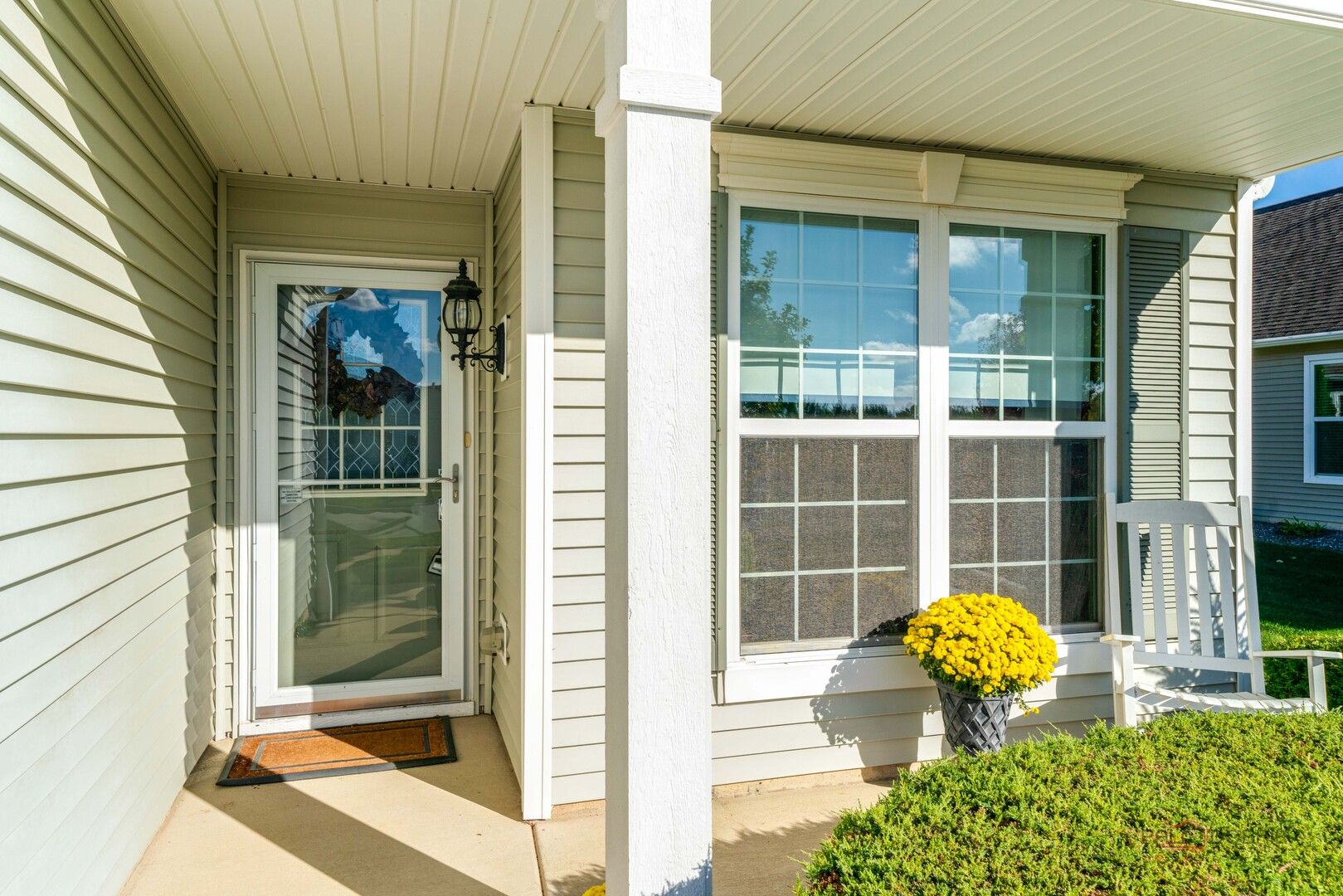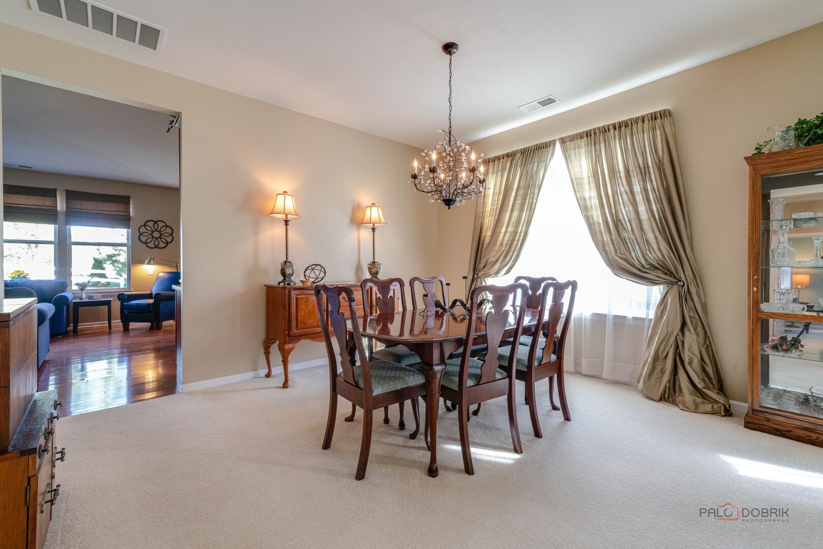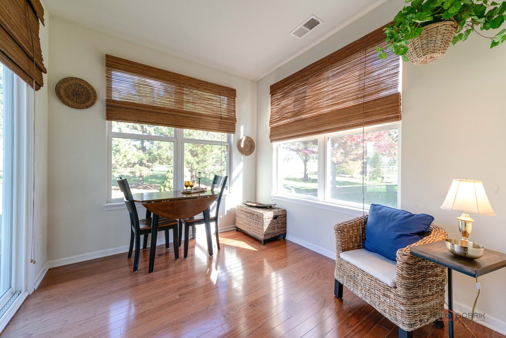 BEAUTIFULLY MAINTAINED WYLDWOOD MODEL IN GRAND DOMINION'S HIGHLY SOUGHT-AFTER 55+ COMMUNITY, WHERE AN ACTIVE LIFESTYLE MEETS LOW-MAINTENANCE LIVING, BACKING TO SCENIC OPEN FIELDS! From the moment you arrive, the inviting front porch sets the tone for this charming home, perfect for morning coffee or friendly chats with neighbors. Head inside to discover an airy open-concept design that seamlessly connects the living and dining areas, creating an ideal space for both entertaining and relaxing. Through a set of French doors, a versatile den offers endless possibilities. Create a quiet home office, a cozy reading nook, or even convert it into an extra bedroom for guests. The kitchen is thoughtfully designed with 42" crowned cabinetry, generous counter space, a closet pantry, and quality appliances. A center island doubles as a convenient spot to meal prep or gather for a quick bite, while the adjoining great room invites conversation and connection. Continue into the sunroom, where natural light fills the room and a slider opens to a private patio, ideal for summer cookouts, soaking up the sunshine, or simply unwinding after a full day of activities. The main bedroom suite is complete with a large bayed window, a walk-in closet, and an ensuite bath featuring a dual-sink vanity and a separate shower. A second bedroom and full bath ensure comfortable accommodations for visiting family or friends. The 2.5-car garage completes the home, offering ample space for both vehicles and extra storage.. Beyond your doorstep, Grand Dominion offers a vibrant lifestyle with resort-style amenities. The Lakeside Lodge serves as the community hub, featuring a welcoming grand lobby, a state-of-the-art fitness center, and an indoor pool. Head outside to enjoy tennis and bocce ball courts, tranquil paths, and scenic pond views. During the warmer months, the outdoor pool and sundeck provide the perfect place to relax and socialize. Ideally located near shopping, golf courses, and major roadways, this home offers the perfect blend of comfort, convenience, and community, all in a setting designed for easy, enjoyable living.