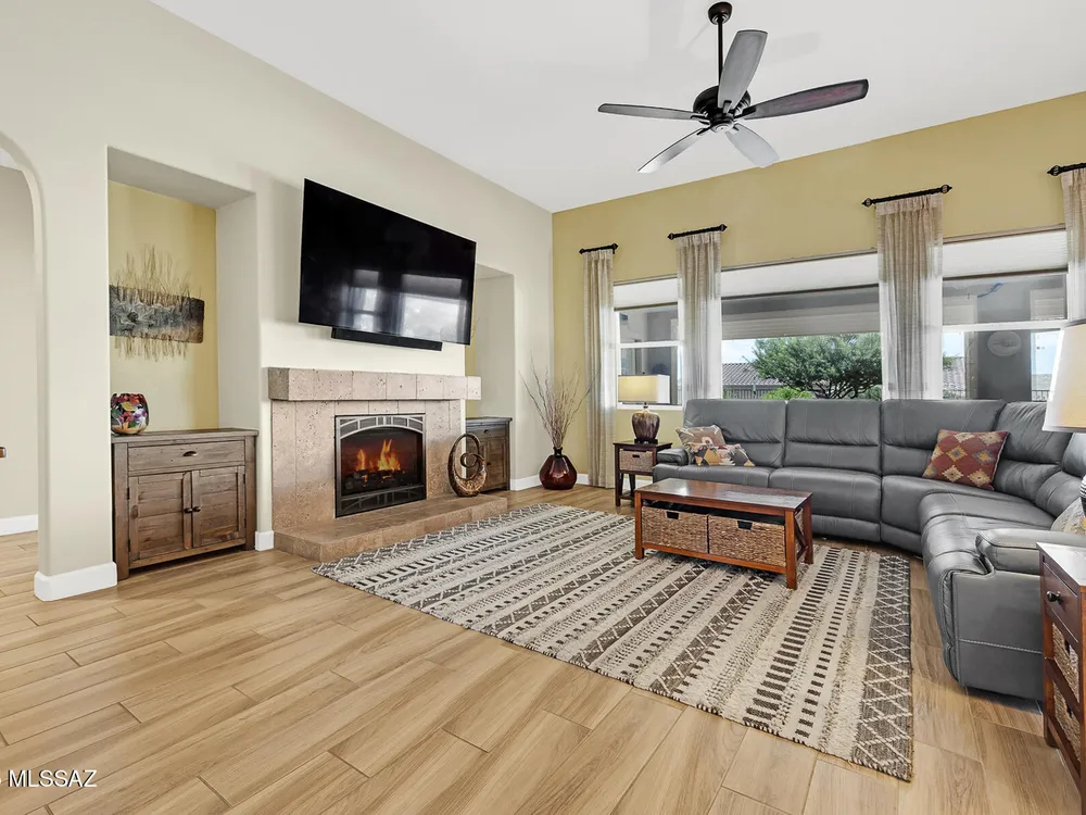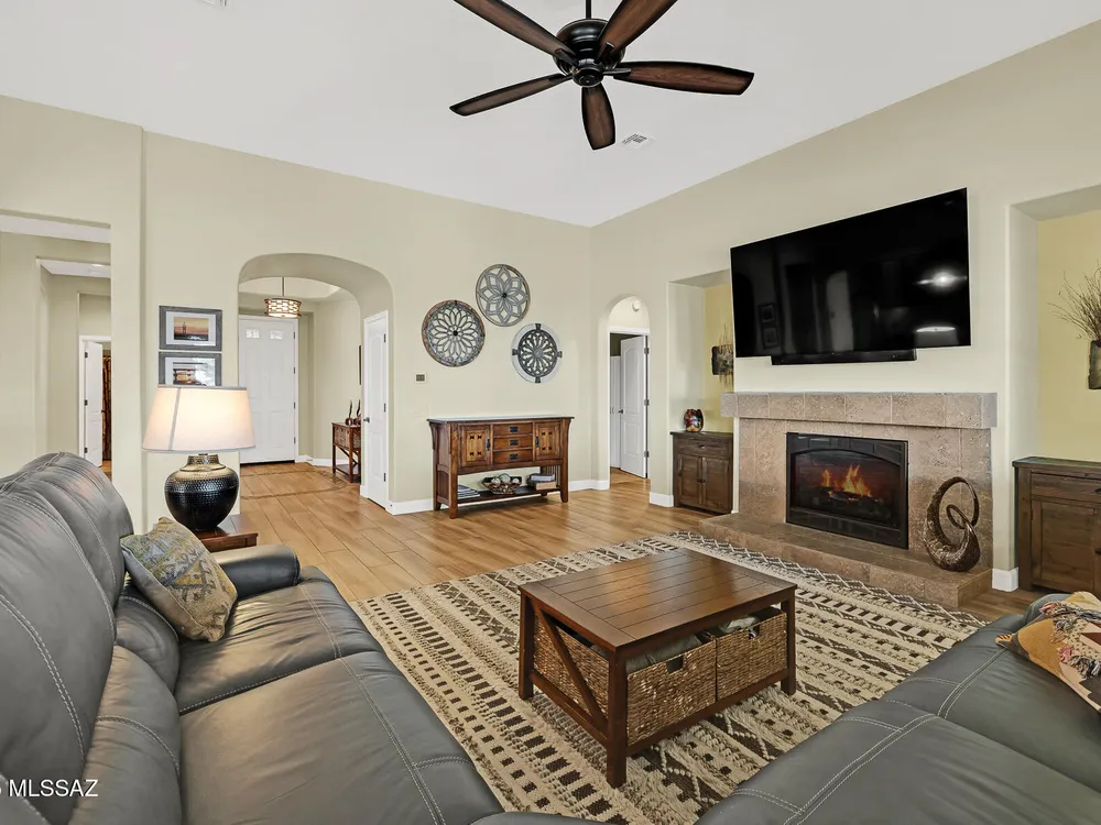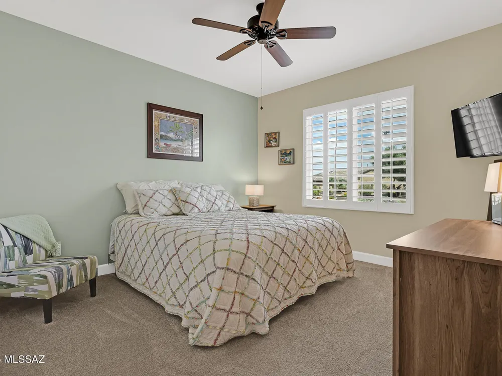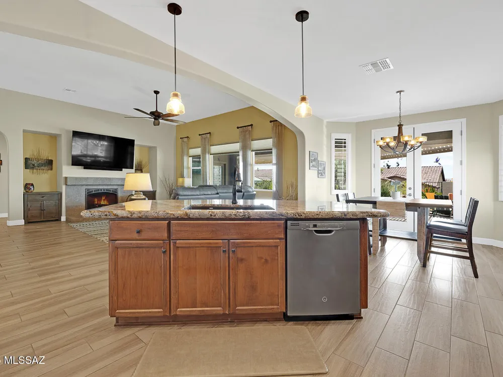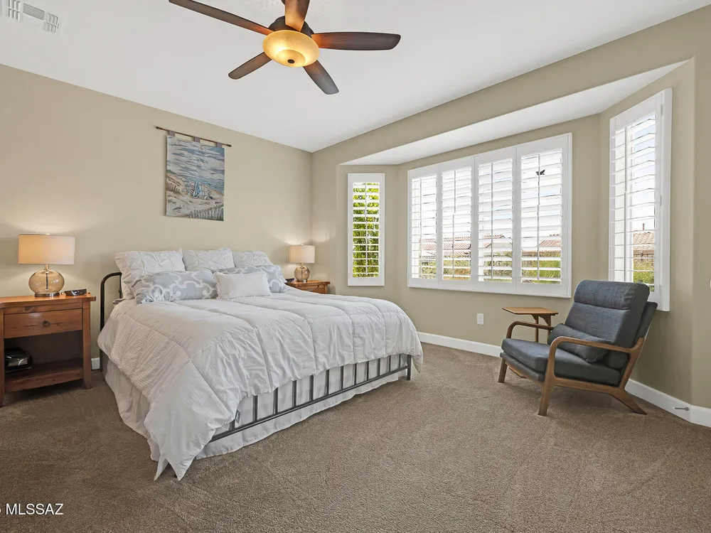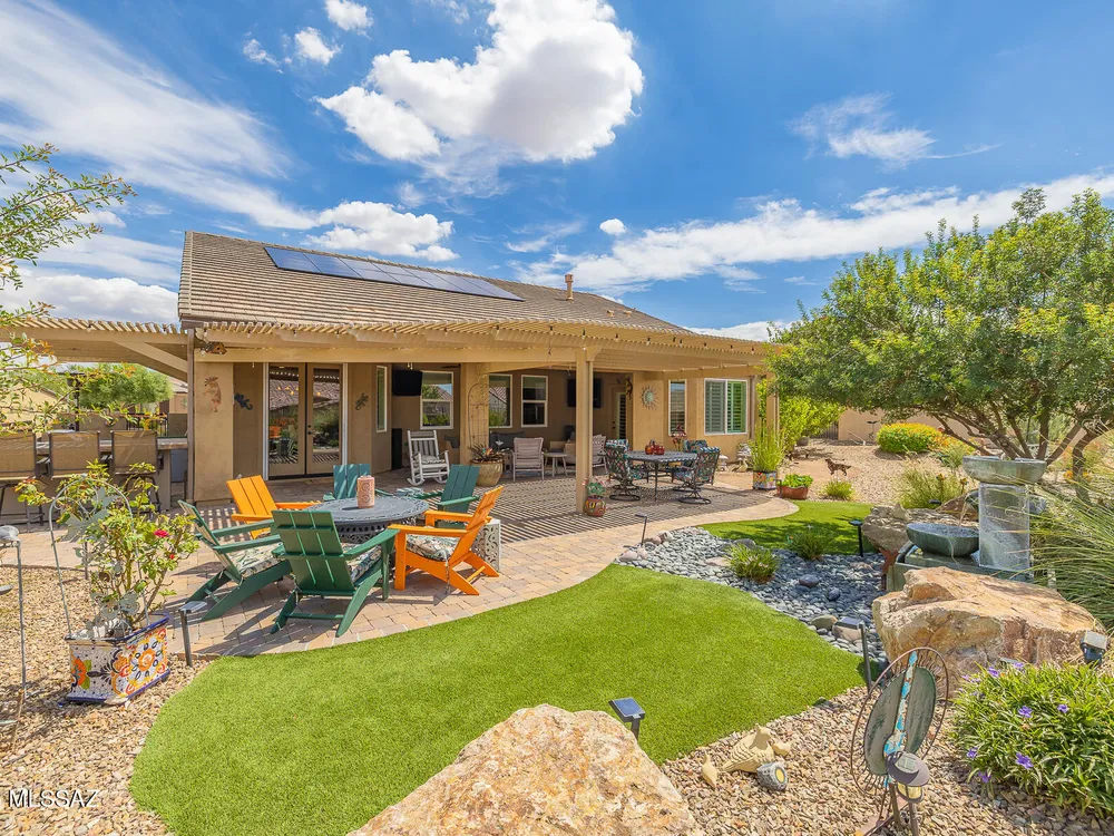 Gorgeous Artesa model on premium, elevated lot with common area to one side is situated close to all amenities while offering a spectacular rear yard plus Catalina views. This 2BD/2BA +Den (1,980 sq ft) split bedroom plan boasts SELLER OWNED energy-efficient Solar (builder installed), wood-look ceramic plank tile with carpeted bedrooms, wood shutters and rich-hued cultured marble bath vanities. Inviting foyer flows to an open concept Great room hosting walls of windows, media wall and upgraded fireplace w/ Travertine surround. Fabulous chef's kitchen features 2'' bullnose granite counter on enlarged island, matte SS appliances, electric induction stove, pecan cabinetry and butler's pantry with sink. Primary suite accessing rear patio is highlighted by large bay window, dual sink vanity,