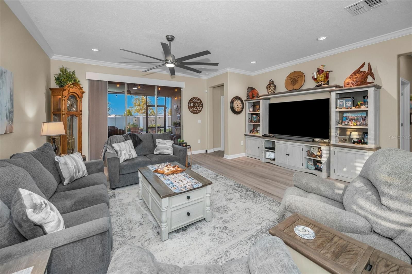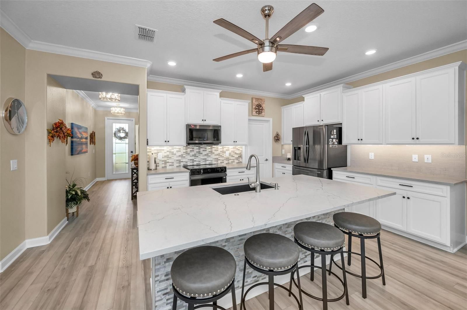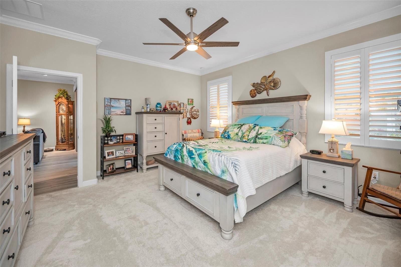- Built-in Features, Ceiling Fan(s), Crown Molding, High Ceilings, Kitchen/Family Room Combo, Open Floorplan, Main Level Primary, Solid Surface Counters, Solid-Wood Cabinets, Walk-In Closet(s)