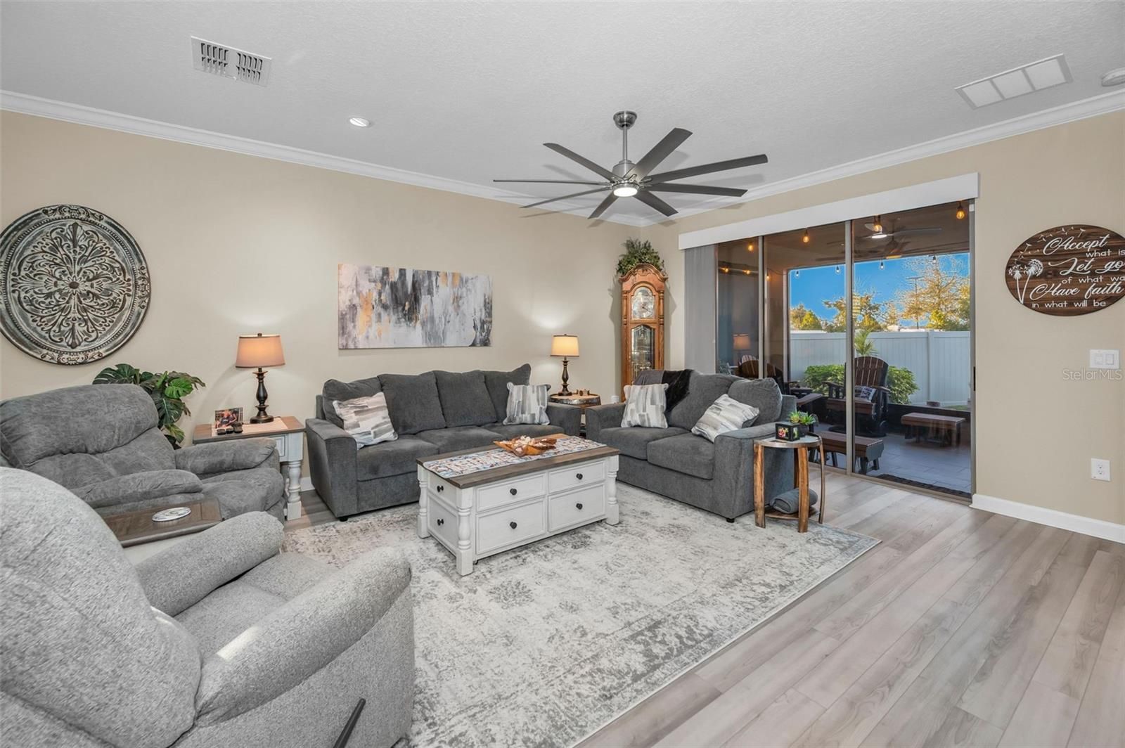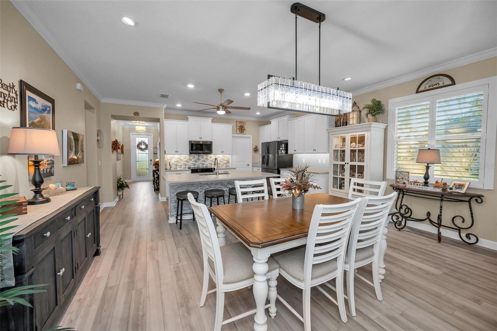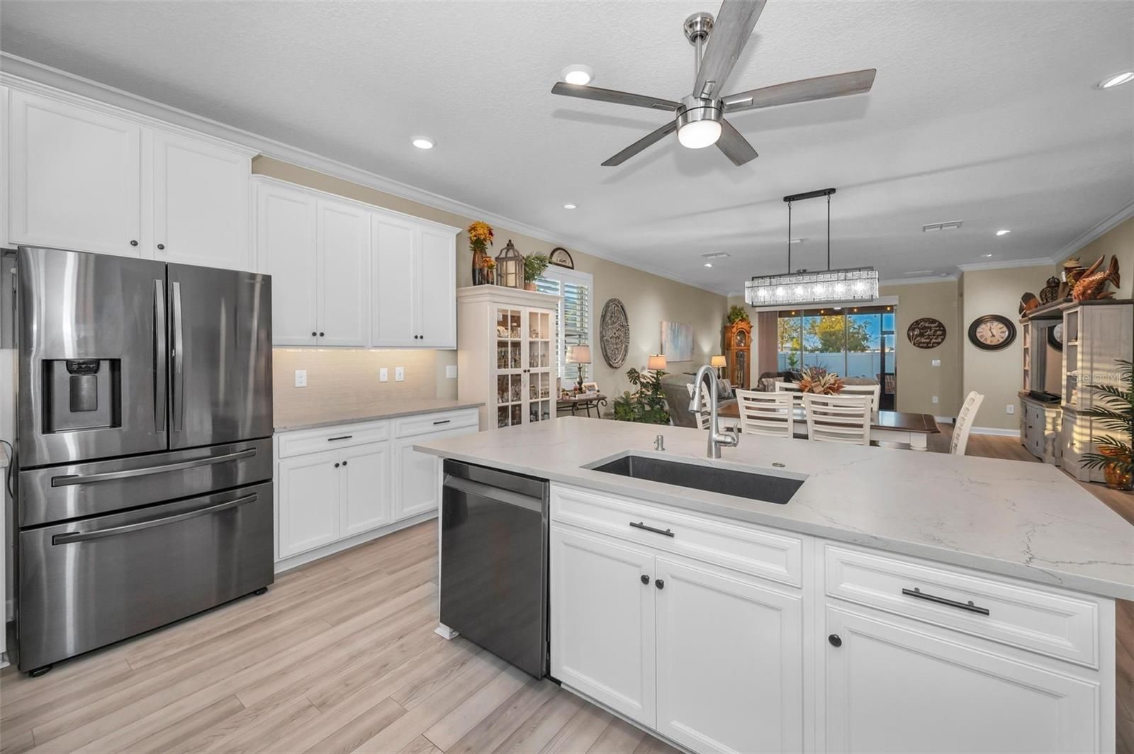 - Built-in Features, Ceiling Fan(s), Crown Molding, High Ceilings, Kitchen/Family Room Combo, Open Floorplan, Main Level Primary, Solid Surface Counters, Solid-Wood Cabinets, Walk-In Closet(s)