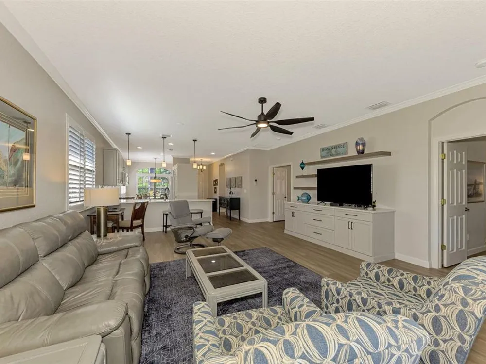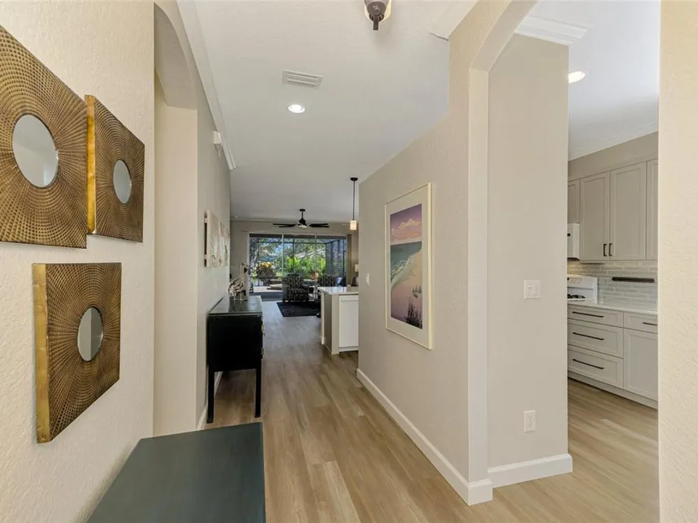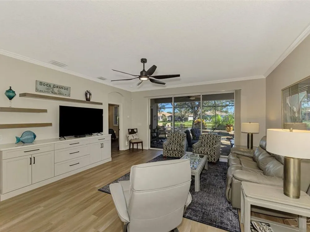 This FULLY REMODELED home with today’s MODERN TRENDS is a SHOWSTOPPER- From the home’s inviting curb appeal and well-maintained landscaping to its expansive outdoor lanai, this 3 Bedroom 2 Bathroom home is ready for you to move right in! The expansive lanai for relaxation and entertaining features a heated oversized spa with decorative tile accents and a planter, all conveniently controlled with electronic settings. Surrounded by Florida’s natural beauty, the home offers serene water views that provide a peaceful and private retreat. Inside, the updated interior strikes the perfect balance between modern style and everyday comfort. Highlights include quality cabinetry, sleek quartz countertops and replaced appliances, complemented by upgraded luxury vinyl floors, a stylish tiled backsplash and a custom-built entertainment center. Plantation shutters, crown molding and other charming details add character throughout. The primary bedroom features a renovated bathroom with an expansive Roman walk-in shower and two closets for extra storage. The third bedroom offers versatility with a built-in desk and a Murphy bed, making it ideal for a home office or guest space. Adding even more value, this home includes a 2023 NEW METAL ROOF for peace of mind. Nestled in the resort-style, gated community of Riverwood, this home is perfectly situated to enjoy all the amenities and activities the neighborhood provides. Residents love the tree-lined walking and biking paths, tennis and pickleball courts, a lap and resort-style pool with a hot tub, fitness center, and a variety of social activities and classes at the Activity Center. Golf enthusiasts can take advantage of the Riverwood Golf Club’s Par 72 Championship course, while pet owners will appreciate the R.O.M.P. Dog Park. Members can also enjoy access to the exclusive Beach Club on Manasota Key (membership based on availability). Conveniently located between Sarasota and Fort Myers on Florida’s stunning West Coast, Riverwood provides easy access to boating, cultural events, dining, shopping, and the gorgeous beaches of Southwest Florida. This home is the ideal blend of relaxed living and stylish upgrades. Don’t wait—contact your agent today to view all that this well-appointed Riverwood Home and Community provides.