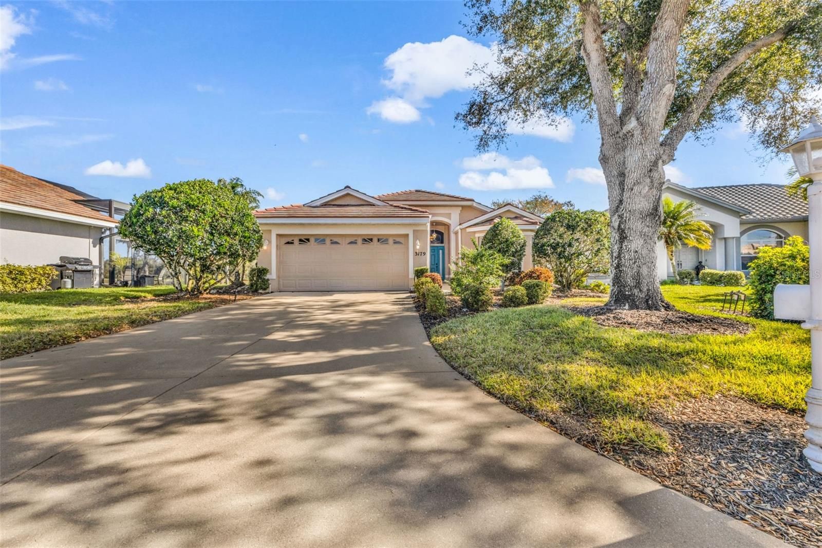 Water and golf course views take center stage in this Riverwood home, perfectly positioned on a premium waterfront tip lot overlooking the 10th hole. With a new roof in 2022, a new AC in 2023, and a beautifully updated kitchen completed in 2021, this property pairs stunning scenery with meaningful improvements. Tucked at the end of a cul-de-sac along one of Village Lane’s picturesque tree-lined streets, the setting provides privacy and beautiful curb appeal, enhanced by lush, established landscaping and an extended driveway. Inside, high-volume ceilings and large windows fill the space with natural light, highlighting the open floor plan and drawing your eye straight to the water. Transom windows above the sliding glass doors brighten the great room, and the living area opens to a covered, tiled, screened lanai designed for true Florida outdoor living, where morning coffee and evening gatherings are framed by sweeping water and golf course views. The kitchen is bright and cheerful with wood cabinetry, quartz countertops, a breakfast bar, and a sunny breakfast nook just off the main space. A separate den provides flexible space for a home office or additional guest area, and the laundry room includes extra storage and a utility sink. Located close to the clubhouse and activity center, this home combines exceptional views with a prime setting within the community, and a transferable flood policy is in place. As part of the vibrant Riverwood community, residents enjoy a par-72 championship golf course with optional membership, along with a state-of-the-art fitness center, a resort-style pool, pickleball courts, and Har Tru tennis courts. As part of the vibrant Riverwood community, residents enjoy a par-72 championship golf course, a state-of-the-art fitness center, a resort-style pool, pickleball courts, and Har Tru tennis courts. Beyond the gates, you will find easy access to world-class fishing, boating, waterfront dining, shopping, and the beautiful sandy beaches of the Gulf, conveniently located between Sarasota and Fort Myers on Florida’s West Coast. If you’ve been waiting for one of Riverwood’s special waterfront locations with both water and golf course views, this one is ready to welcome you home.