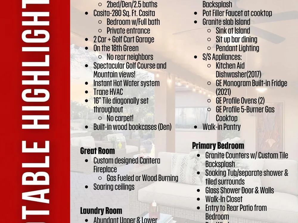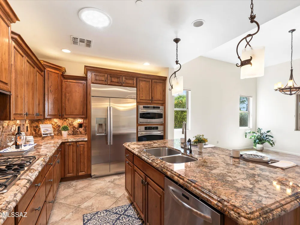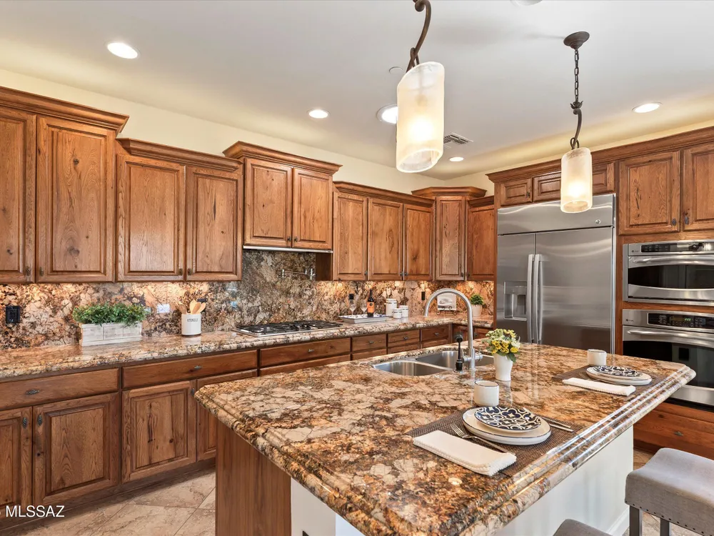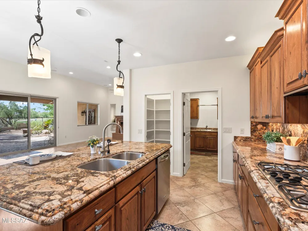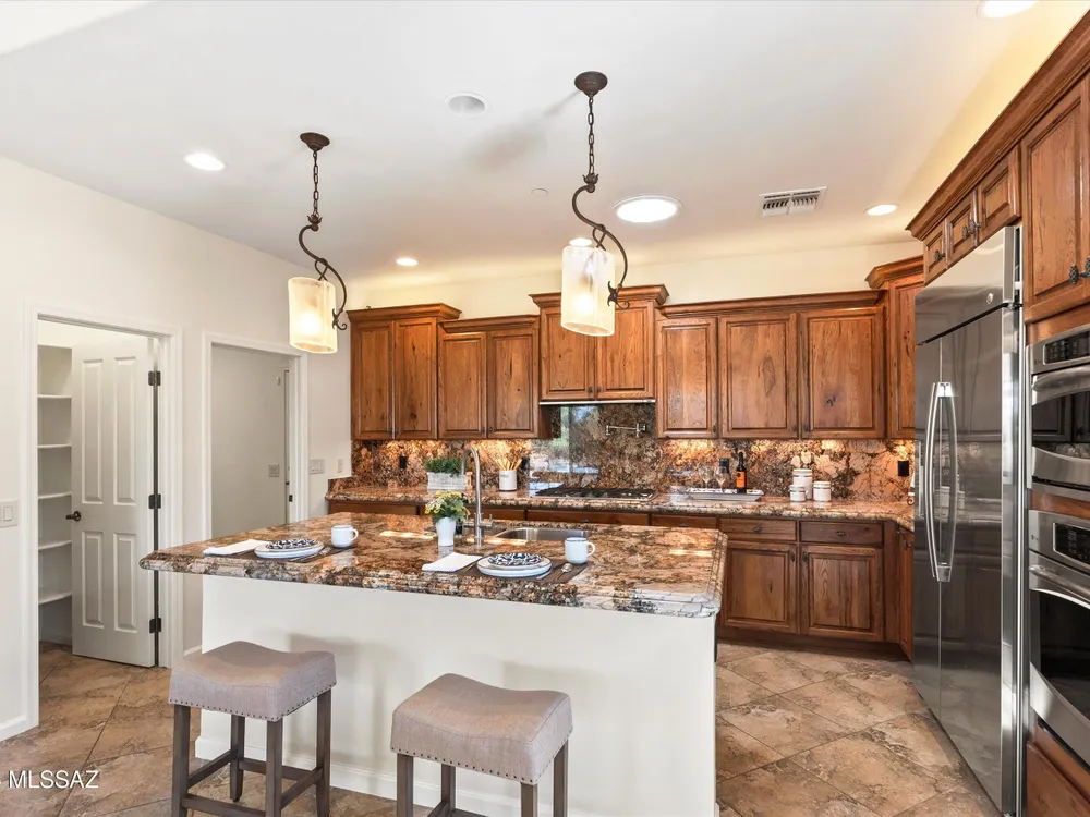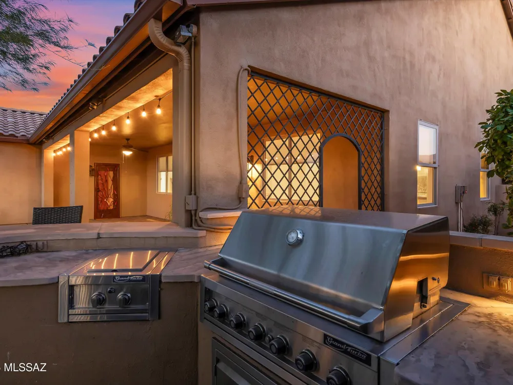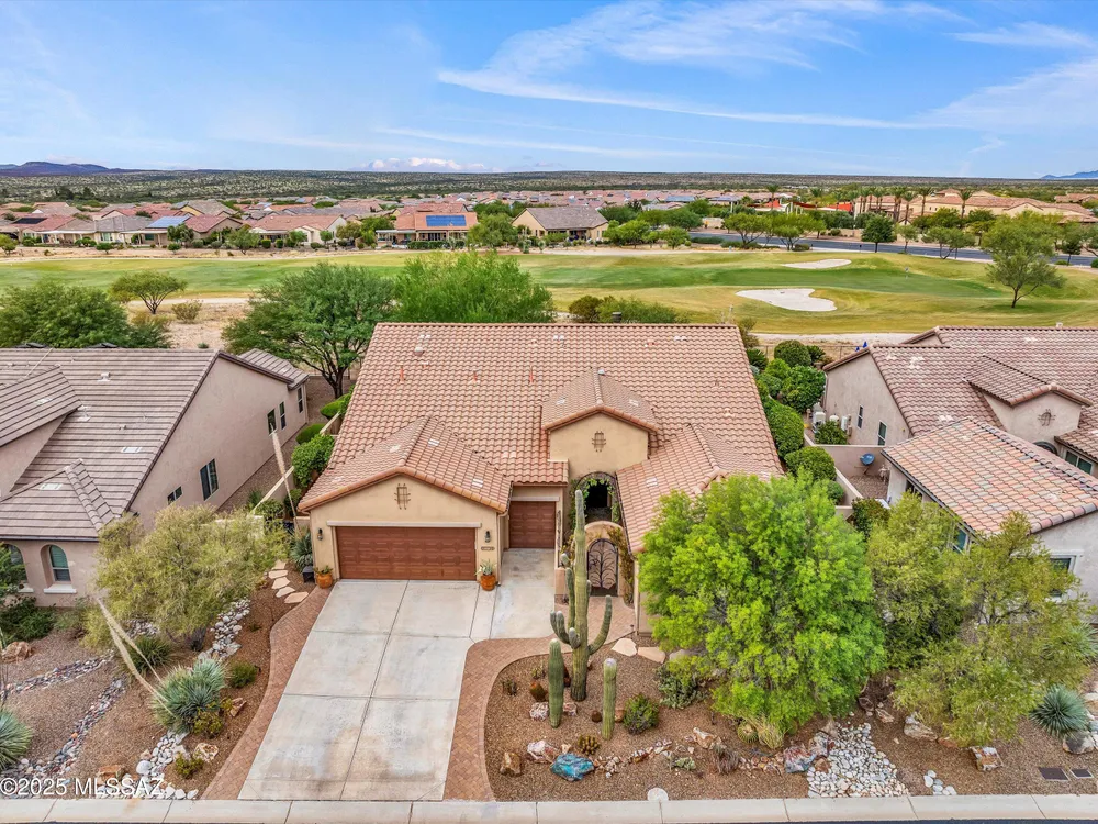 Savor Arizona resort living in this exquisite Saddlebrooke Ranch home on the 18th green, where sweeping golf & mountain vistas greet you daily. Enter thru a gated courtyard to discover open spaces w/ soaring ceilings, a Cantera stone f/p, and elegant finishes throughout. The chef's kitchen boasts granite slab counters, GE Monogram built-in refrigerator, double ovens, 5-burner gas cooktop w/ pot filler, and a generous island w/ bar seating. Retreat to the primary suite w/ patio access, spa-like bath, and walk-in closet. A private-entry casita w/ full bath offers a welcoming haven for guests. Outside, relax under the covered patio w/ ceiling fans, enjoy a built-in BBQ, sink & sit up bar, stroll among citrus & rose gardens & take in views that capture the true essence of desert living!
