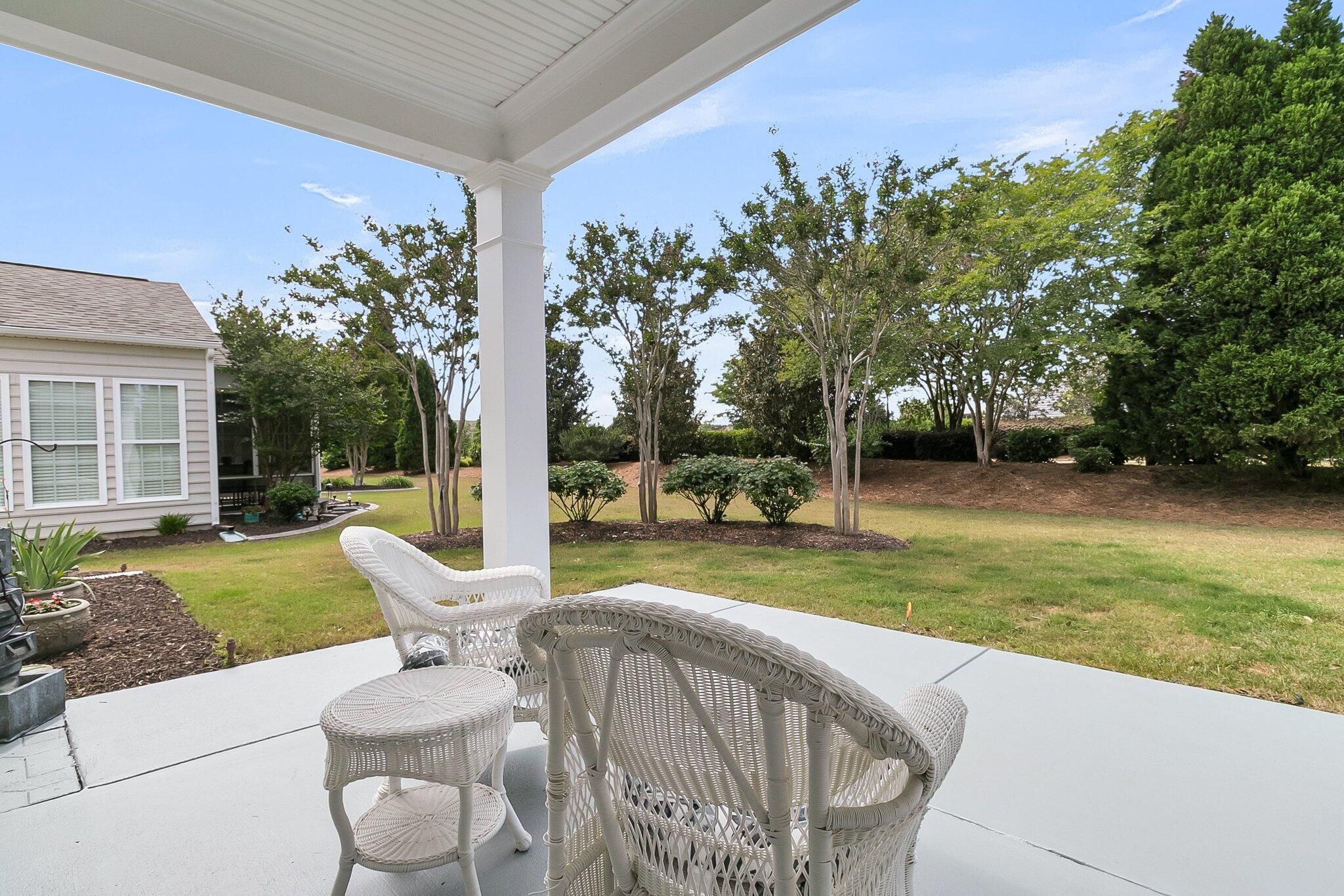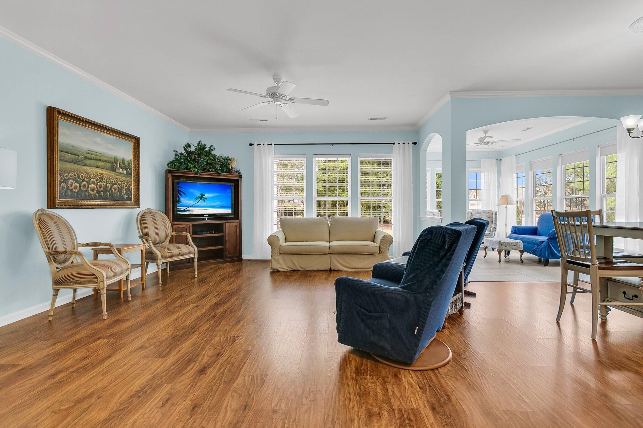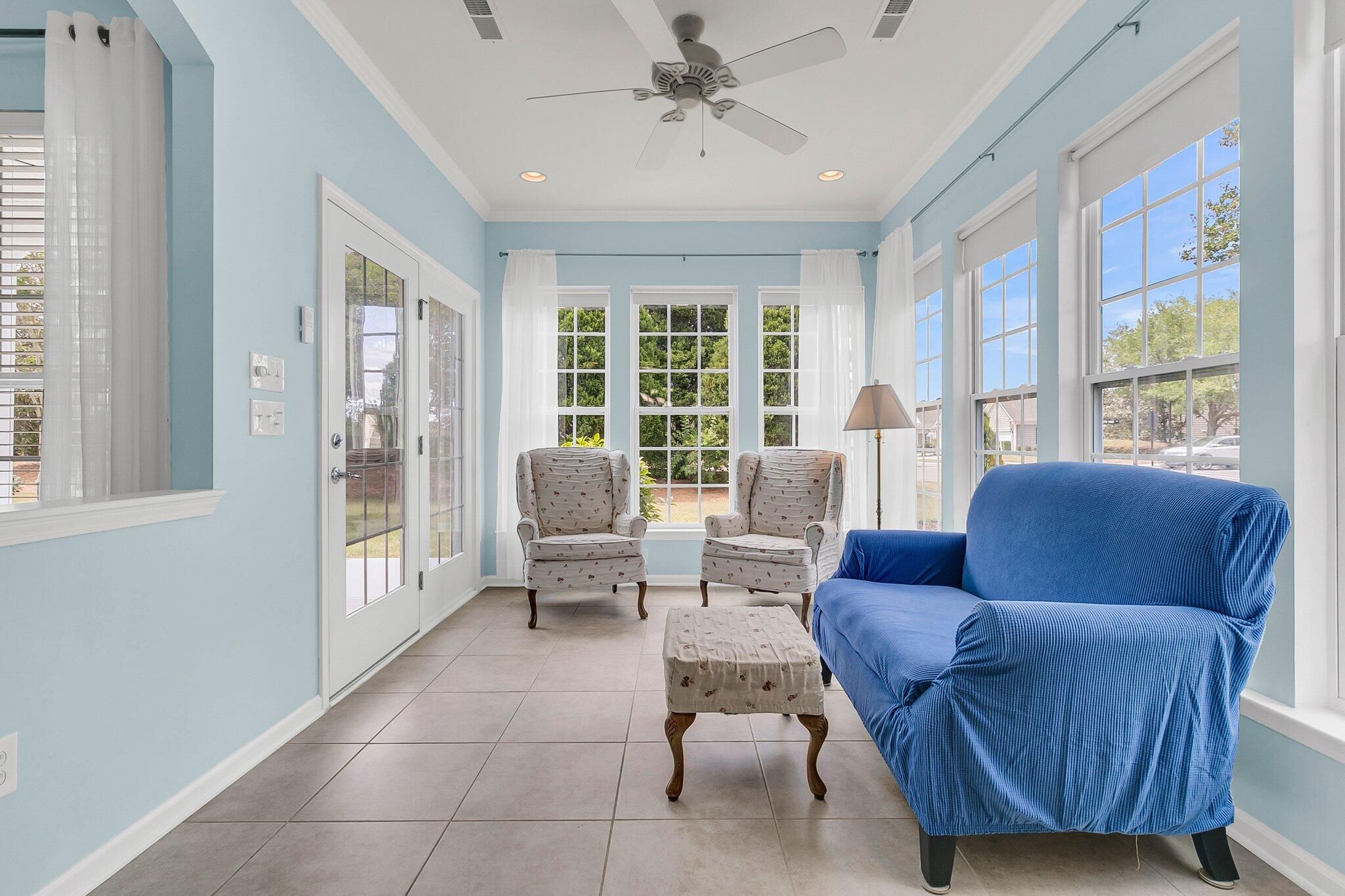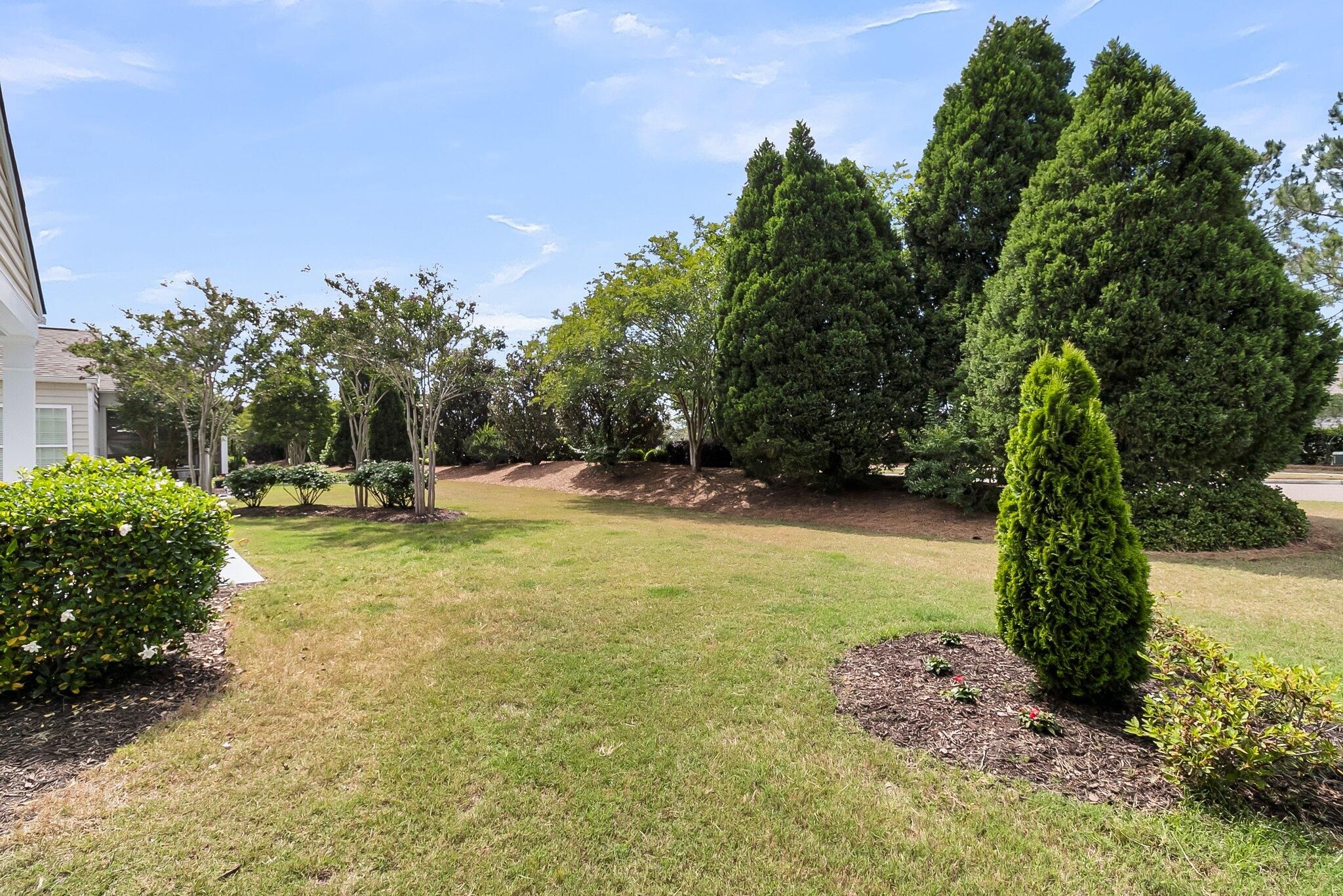 Del Webb Charleston's popular model, the Copper Ridge on a gorgeous oversized corner homesite in close proximity to the communities amenity center! This home features 2 bedrooms, 2 baths, office/den/flex room, sunroom, and covered porch. New roof installed in 2023. Beautiful curb appeal highlighted with mature landscaping and a front porch with plenty of room for seating. Step inside to a defined foyer with tiled flooring, wainscotting, and two piece crown molding. A charming archway leads you into open-concept living and a stunning view to the outside, it's no wonder this floorpan is so popular! A spacious kitchen looks directly into the living and dining rooms with a wraparound bar for informal eating. The kitchen is complete with 36'' Maple cabinets with crown molding, Corian.......countertops, and tile backsplash. The sunroom is located at the back of the home and includes tile flooring and ample windows. From the sunroom, you'll step onto a covered porch surrounded by beautiful scenery and privacy with a professionally landscaped berm, the feeling of relaxation is all around! Back inside the primary bedroom doesn't disappoint with laminate flooring, plenty of natural light and tray ceiling. From there, a primary bathroom with dual sink vanities, walk-in shower, tile flooring, linen closet, and giant walk-in closet! The guest bedroom is on the opposite side of the home offering your guests plenty of privacy. Finally, a den tucked down a short hallway complete with french doors that can be used as an office, extra TV room, hobby room, or third sleeping area for friends and family! The corner homesite surrounded by beautiful landscaping makes this one special. Please book your showing today to see this home and Charleston's premier active adult/55+ lifestyle community in full bloom!