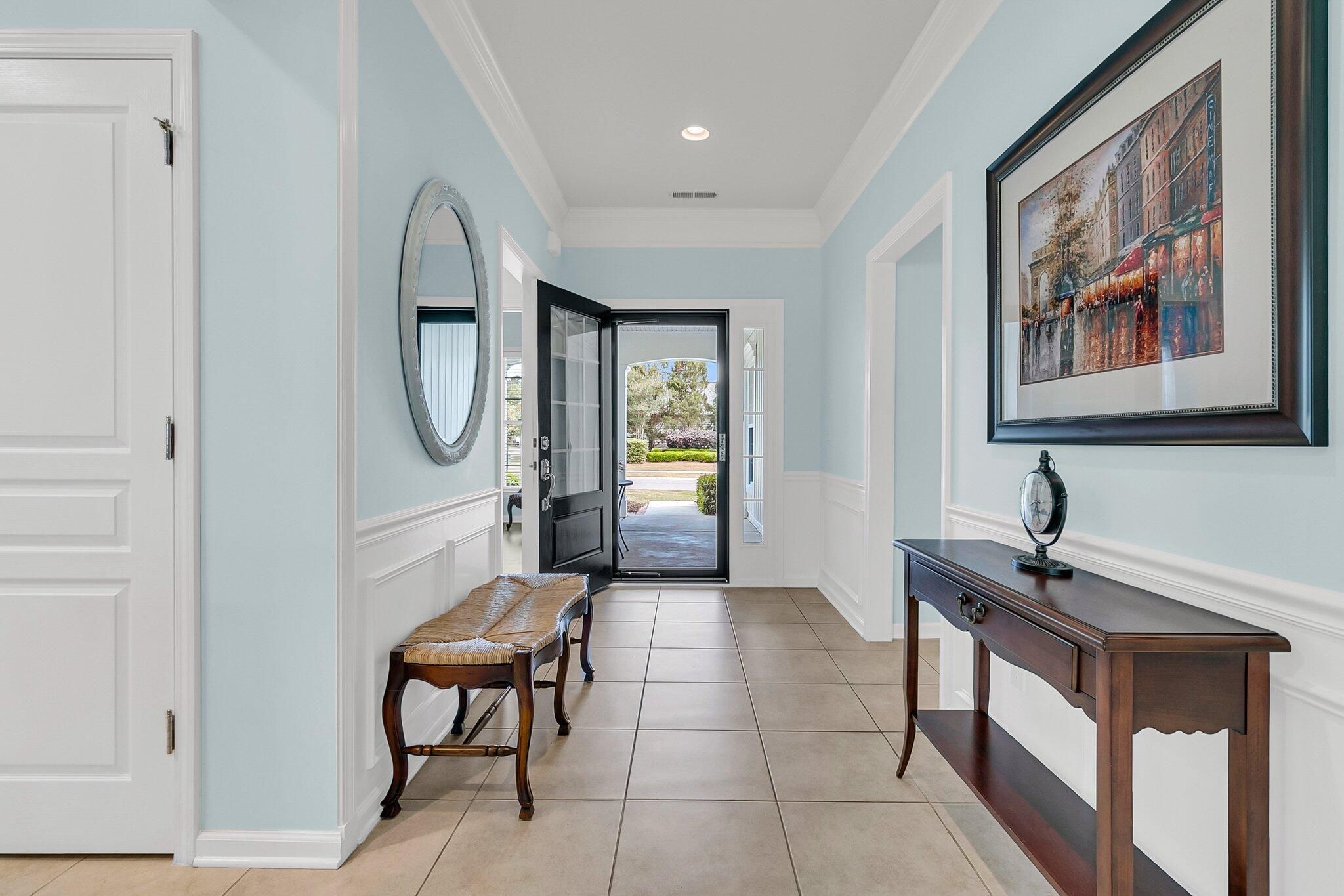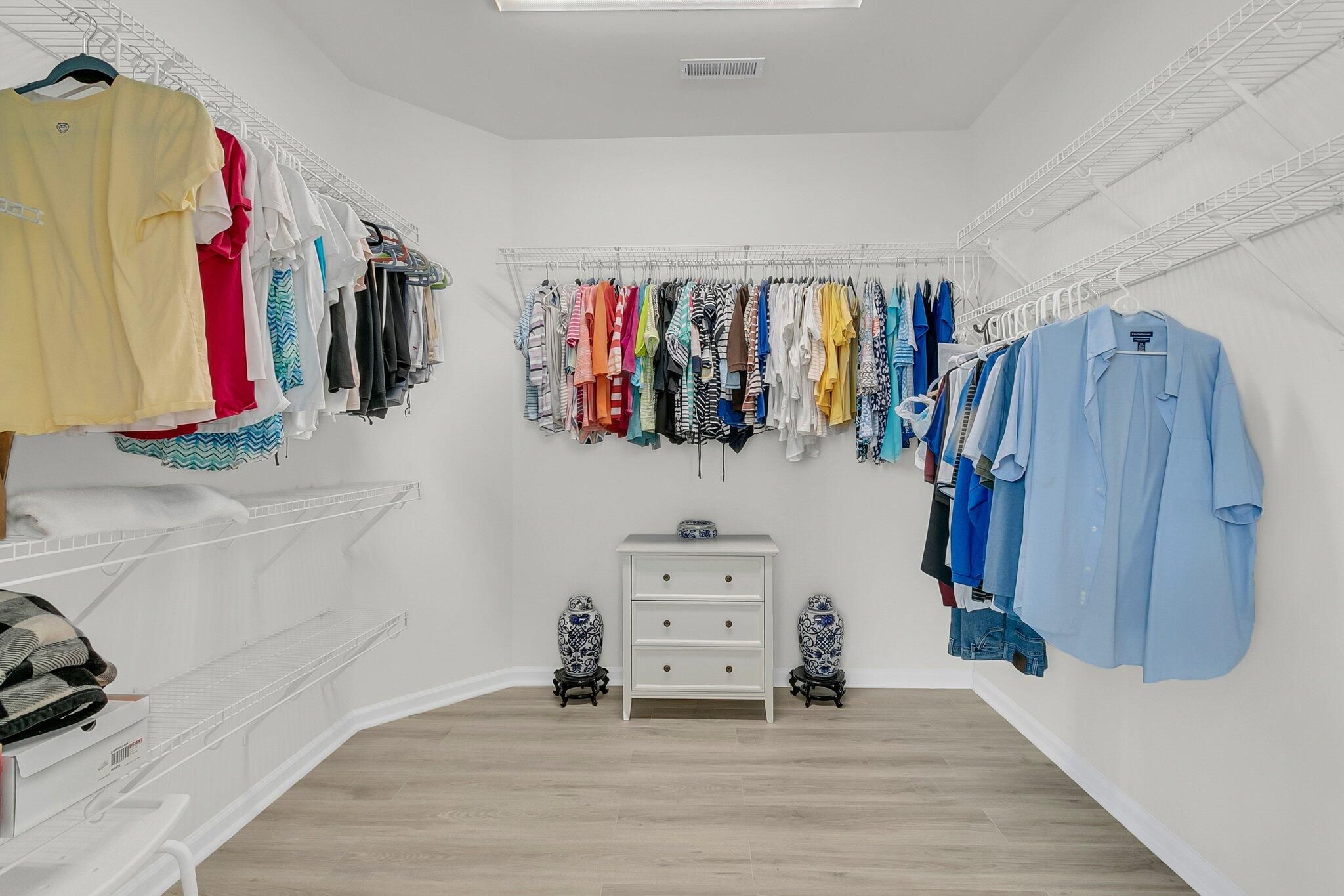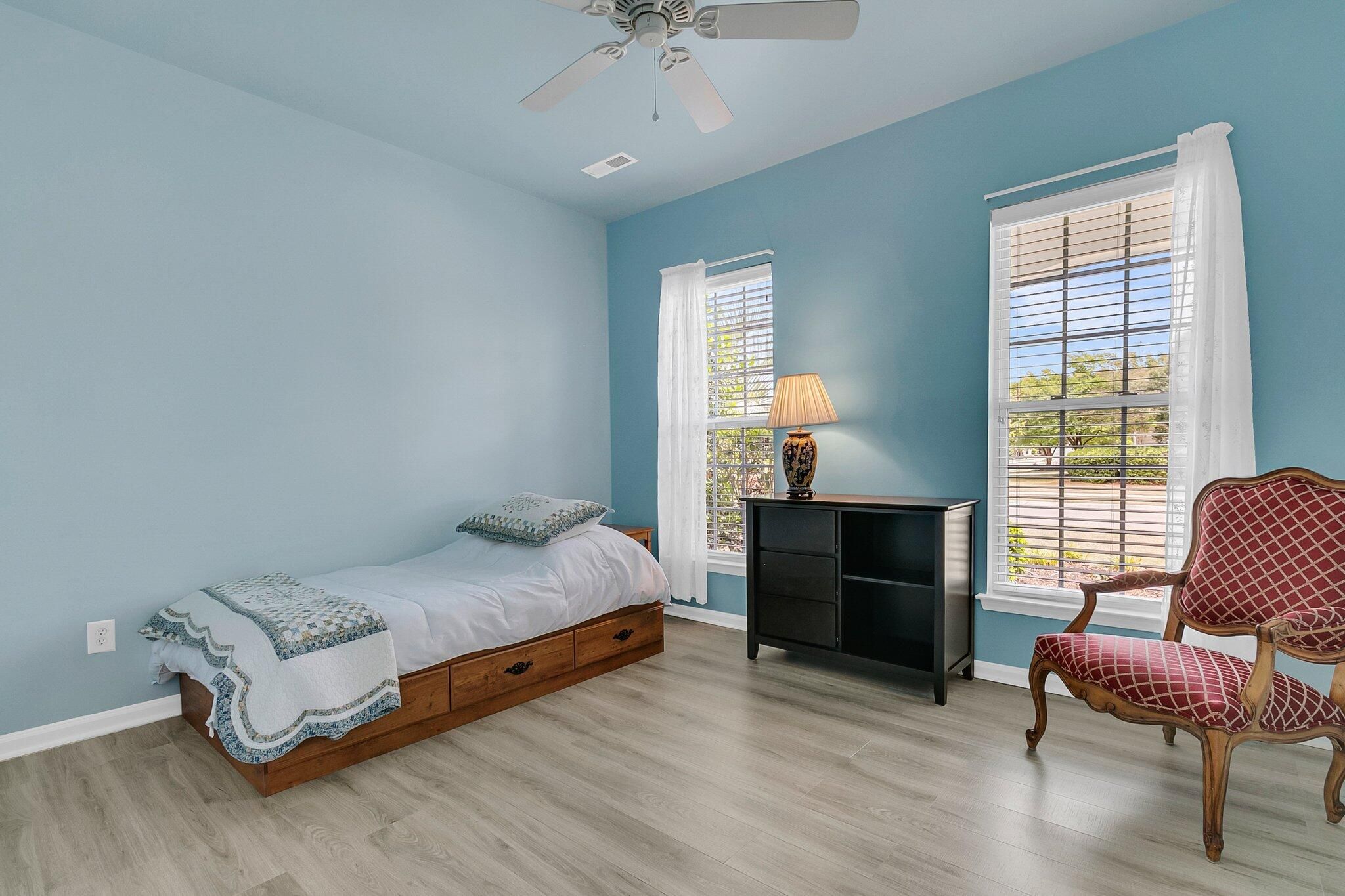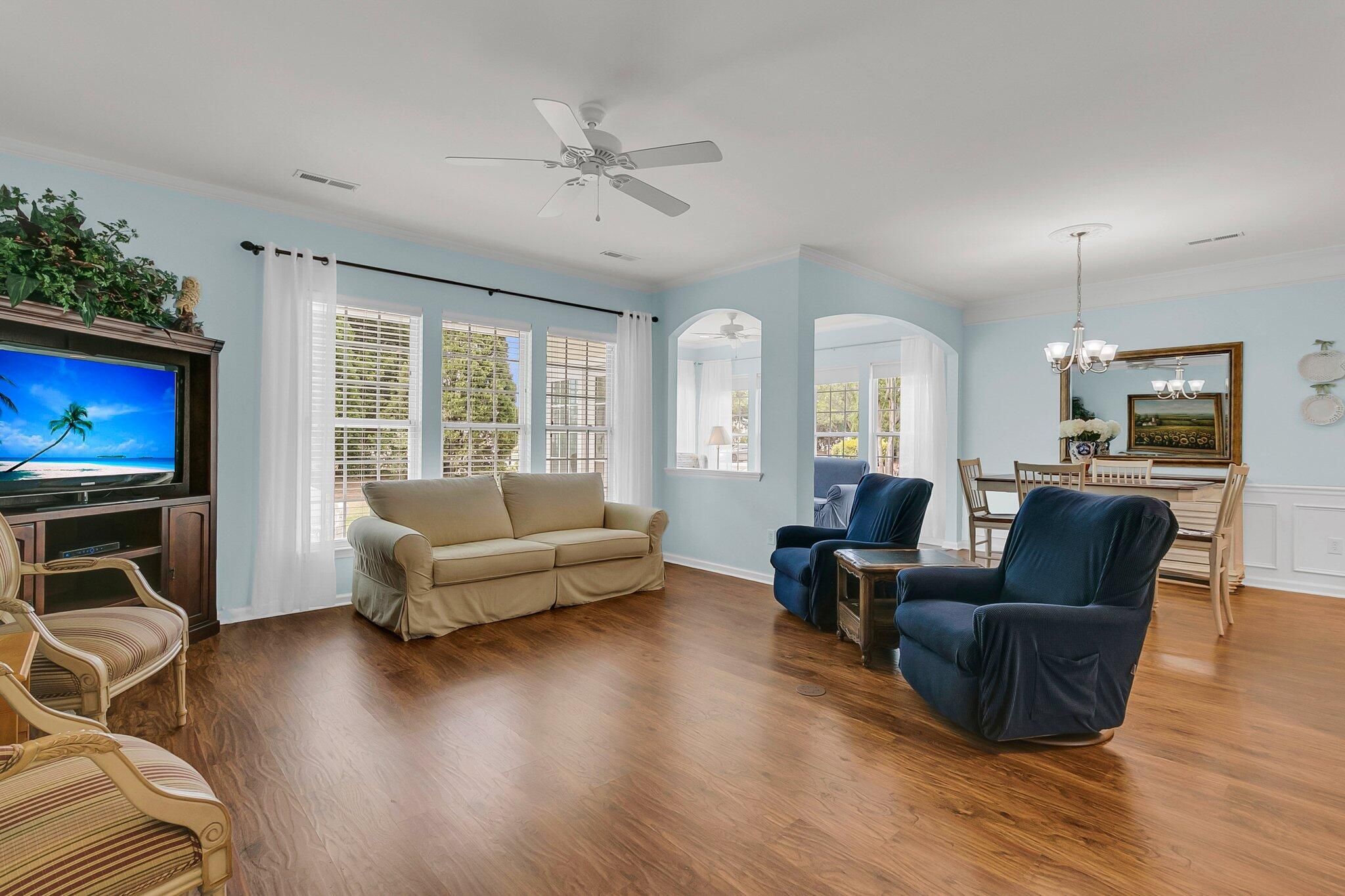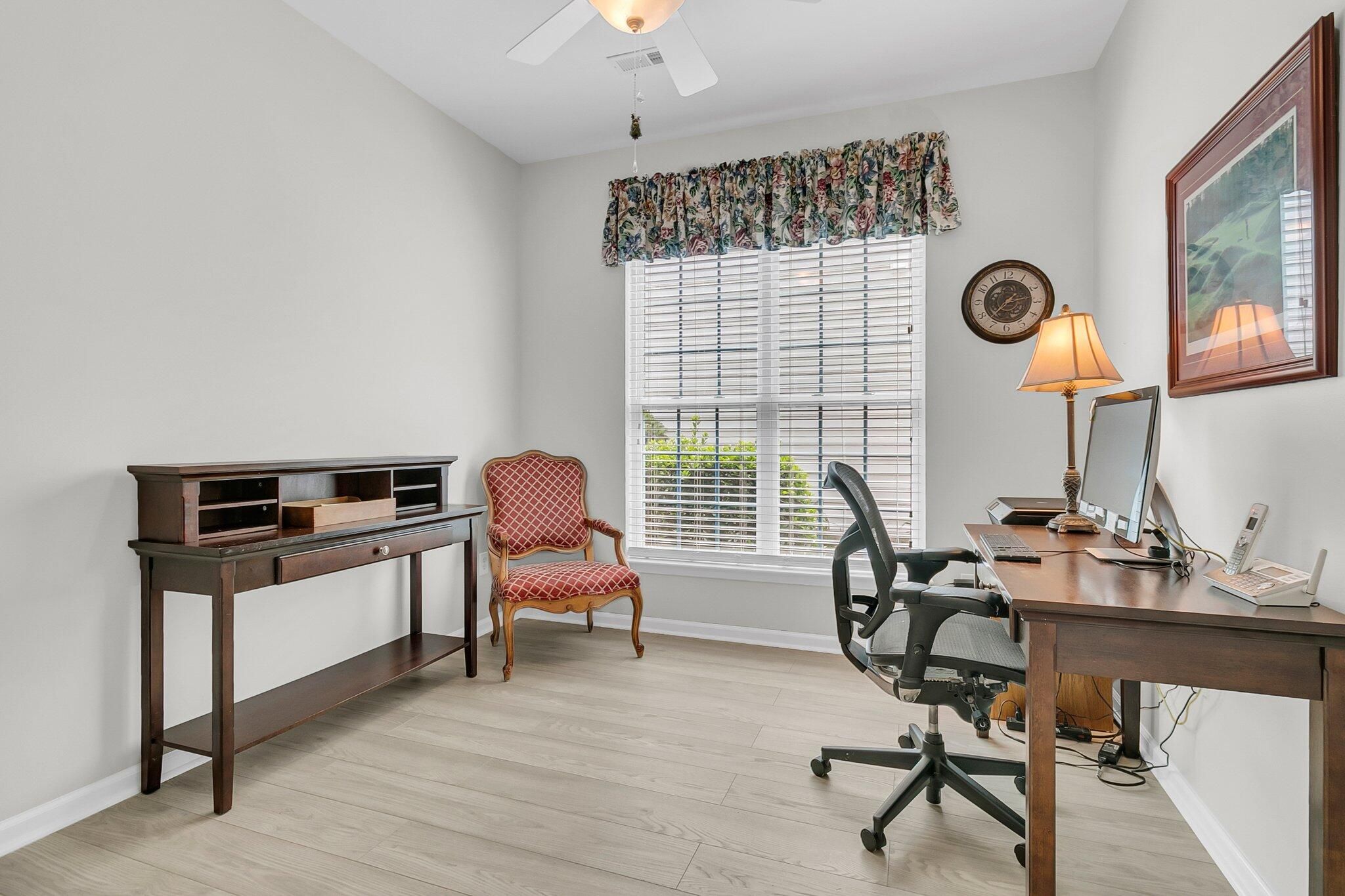 Del Webb Charleston's popular model, the Copper Ridge on a gorgeous oversized corner homesite in close proximity to the communities amenity center! This home features 2 bedrooms, 2 baths, office/den/flex room, sunroom, and covered porch. New roof installed in 2023. Beautiful curb appeal highlighted with mature landscaping and a front porch with plenty of room for seating. Step inside to a defined foyer with tiled flooring, wainscotting, and two piece crown molding. A charming archway leads you into open-concept living and a stunning view to the outside, it's no wonder this floorpan is so popular! A spacious kitchen looks directly into the living and dining rooms with a wraparound bar for informal eating. The kitchen is complete with 36'' Maple cabinets with crown molding, Corian.......countertops, and tile backsplash. The sunroom is located at the back of the home and includes tile flooring and ample windows. From the sunroom, you'll step onto a covered porch surrounded by beautiful scenery and privacy with a professionally landscaped berm, the feeling of relaxation is all around! Back inside the primary bedroom doesn't disappoint with laminate flooring, plenty of natural light and tray ceiling. From there, a primary bathroom with dual sink vanities, walk-in shower, tile flooring, linen closet, and giant walk-in closet! The guest bedroom is on the opposite side of the home offering your guests plenty of privacy. Finally, a den tucked down a short hallway complete with french doors that can be used as an office, extra TV room, hobby room, or third sleeping area for friends and family! The corner homesite surrounded by beautiful landscaping makes this one special. Please book your showing today to see this home and Charleston's premier active adult/55+ lifestyle community in full bloom!
